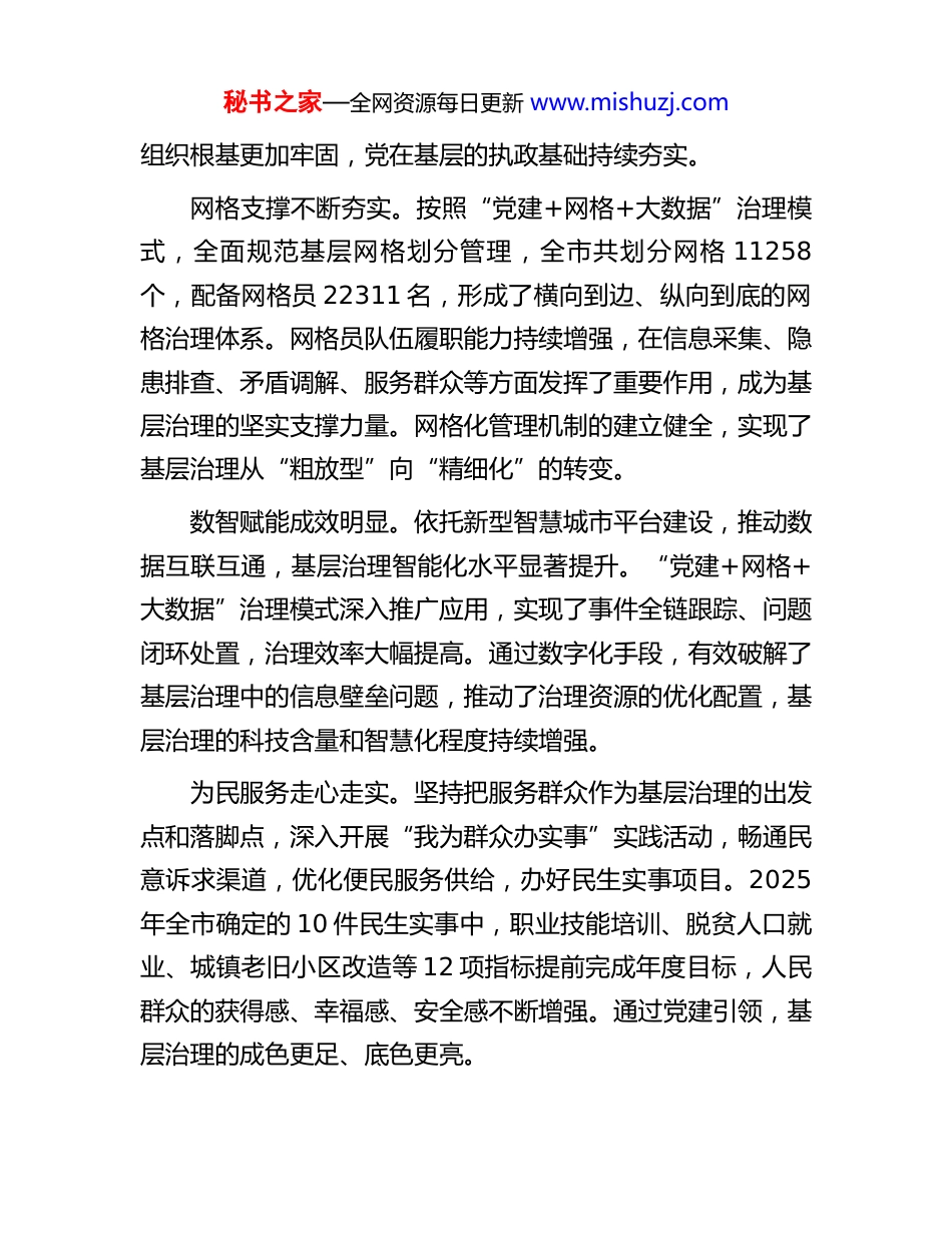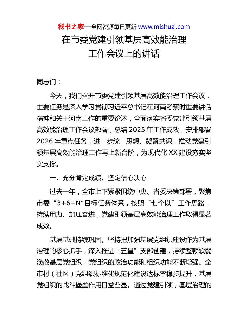 秘书之家—全网资源每日更新 www.mishuzj.com在市委党建引领基层高效能治理工作会议上的讲话同志们:今天,我们召开市委党建引领基层高效能治理工作会议,主要任务是深入学习贯彻习近平总书记在河南考察时重要讲话精神和关于河南工作的重要论述,全面落实省委党建引领基层高效能治理工作会议部署,总结 2025 年工作成效,安排部署2026 年重点任务,进一步统一思想、凝聚共识,推动党建引领基层高效能治理工作再上新台阶,为现代化 XX 建设夯实坚实支撑。一、充分肯定成绩,坚定信心决心过去一年,全市上下紧紧围绕中央、省委决策部署,聚焦市委“3+6+N”目标任务体系,按照“七个以”工作思路,持续用力、加压奋进,党建引领基层高效能治理工作取得显著成效。基层基础持续巩固。坚持把加强基层党组织建设作为基层治理的核心抓手,深入推进“五星”支部创建,持续整顿软弱涣散基层党组织,党组织的政治功能和组织功能不断增强。全市村(社区)党组织标准化规范化建设达标率稳步提升,基层党组织的战斗堡垒作用日益凸显。通过党建引领,基层治理的秘书之家—全网资源每日更新 www.mishuzj.com组织根基更加牢固,党在基层的执政基础持续夯实。网格支撑不断夯实。按照“党建+网格+大数据”治理模式,全面规范基层网格划分管理,全市共划分网格 11258个,配备网格员 22311 名,形成了横向到边、纵向到底的网格治理体系。网格员队伍履职能力持续增强,在信息采集、隐患排查、矛盾调解、服务群众等方面发挥了重要作用,成为基层治理的坚实支撑力量。网格化管理机制的建立健全,实现了基层治理从“粗放型”向“精细化”的转变。数智赋能成效明显。依托新型智慧城市平台建设,推动数据互联互通,基层治理智能化水平显著提升。“党建+网格+大数据”治理模式深入推广应用,实现了事件全链跟踪、问题闭环处置,治理效率大幅提高。通过数字化手段,有效破解了基层治理中的信息壁垒问题,推动了治理资源的优化配置,基层治理的科技含量和智慧化程度持续增强。为民服务走心走实。坚持把服务群众作为基层治理的出发点和落脚点,深入开展“我为群众办实事”实践活动,畅通民意诉求渠道,优化便民服务供给,办好民生实事项目。2025年全市确定的 10 件民生实事中,职业技能培训、脱贫人口就业、城镇老旧小区改造等 12 项指标提前完成年度目标,人民群众的获得感、幸福感、安全感不断增强。通过党建引领,基层治理的成色更足、底色更亮。秘书之家—全网资源每日更新 www.mishuzj.com风险防范扎实有效。坚持和发展新时代“枫桥经验”,大力化解矛盾纠纷,强力整治风险隐患,全力守护公共安全。通过“四议两公开”工作法、创新“甘棠议事”机制等有效举措,及时发现、就地化解各类矛盾纠纷,实现“小事不出村、大事不出镇、矛盾不上交”。矛盾纠纷化解率保持在较高水平,社会大局和谐稳定,以高效能治理促进了高质量发展和高水平安全的良性互动。实践创新亮点纷呈。各地各部门结合实际,积极探索党建引领基层治理的新路径、新方法,涌现出一批特色鲜明、成效突出的创新案例。社会组织参与基层社会治理、党员积分制管理、“双领双增”行动等典型做法得到推广,形成了可复制、可借鉴的经验模式。这些创新实践为全市基层治理工作提供了有益参考和示范引领。在充分肯定成绩的同时,也要清醒认识到,对标中央精神、对照省委要求、对比群众期待,工作中还存在一些短板和不足。有的地方基层党组织政治功能发挥不够充分,基层治理队伍专业化水平有待提升;有的地方网格化管理运行机制还不够顺畅,数据共享和互联互通还需加强;有的地方服务群众的精准性、实效性还有差距,群众满意度有待进一步提高。对于这些问题,必须高度重视,采取有力措施加以解决。二、抓实重点任务,聚力攻坚突破秘书之家—全网资源每日更新 www.mishuzj.com2026 年是“十五五”规划开局之年,也是推进现代化XX 建设的关键之年。做好党建引领基层高效能治理工作,意义重大、责任重大。要聚焦五个方面重点任务,持续用力、久久为功,推动基层治理效能实现新提升。聚焦夯实基层治理根基,在大抓基层、大抓基础上持续用力。...
