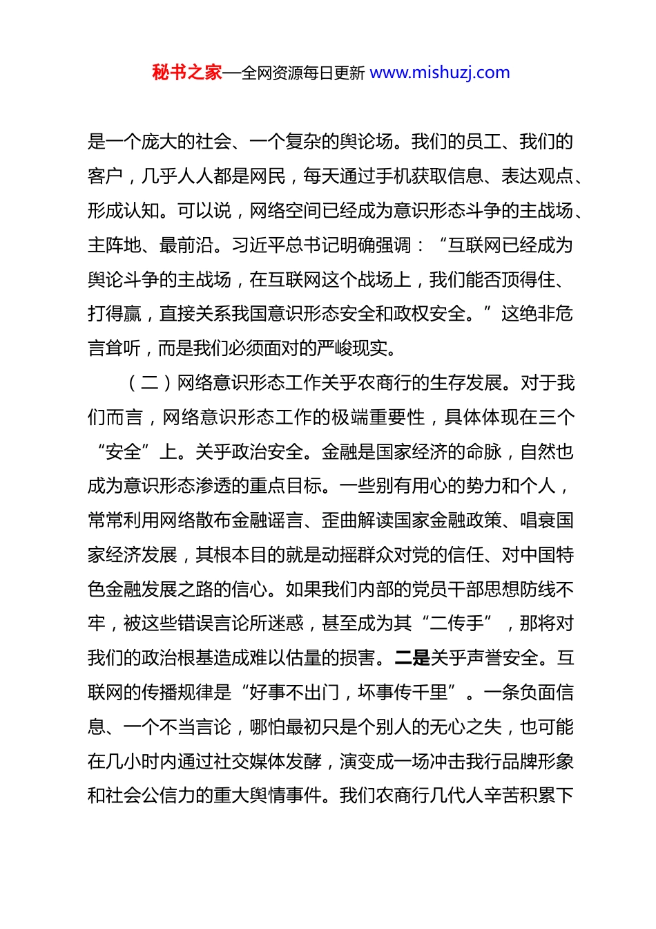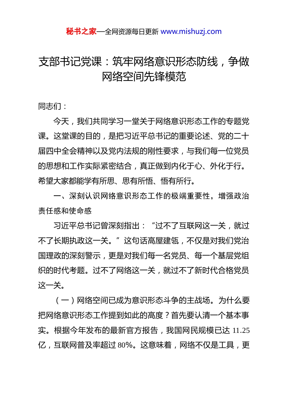 秘书之家—全网资源每日更新 www.mishuzj.com支部书记党课:筑牢网络意识形态防线,争做网络空间先锋模范 同志们:今天,我们共同学习一堂关于网络意识形态工作的专题党课。这堂课的目的,是把习近平总书记的重要论述、党的二十届四中全会精神以及党内法规的刚性要求,与我们每一位党员的思想和工作实际紧密结合,真正做到内化于心、外化于行。希望大家都能学有所思、思有所悟、悟有所行。一、深刻认识网络意识形态工作的极端重要性,增强政治责任感和使命感习近平总书记曾深刻指出:“过不了互联网这一关,就过不了长期执政这一关。”这句话高屋建瓴,不仅是对我们党治国理政的深刻警示,更是对我们每一名党员、每一个基层党组织的时代考题。过不了网络这一关,就过不了新时代合格党员这一关。(一)网络空间已成为意识形态斗争的主战场。为什么要把网络意识形态工作提到如此的高度?首先要认清一个基本事实。根据今年发布的最新官方报告,我国网民规模已达 11.25亿,互联网普及率超过 80%。这意味着,网络不仅是工具,更秘书之家—全网资源每日更新 www.mishuzj.com是一个庞大的社会、一个复杂的舆论场。我们的员工、我们的客户,几乎人人都是网民,每天通过手机获取信息、表达观点、形成认知。可以说,网络空间已经成为意识形态斗争的主战场、主阵地、最前沿。习近平总书记明确强调:“互联网已经成为舆论斗争的主战场,在互联网这个战场上,我们能否顶得住、打得赢,直接关系我国意识形态安全和政权安全。”这绝非危言耸听,而是我们必须面对的严峻现实。(二)网络意识形态工作关乎农商行的生存发展。对于我们而言,网络意识形态工作的极端重要性,具体体现在三个“安全”上。关乎政治安全。金融是国家经济的命脉,自然也成为意识形态渗透的重点目标。一些别有用心的势力和个人,常常利用网络散布金融谣言、歪曲解读国家金融政策、唱衰国家经济发展,其根本目的就是动摇群众对党的信任、对中国特色金融发展之路的信心。如果我们内部的党员干部思想防线不牢,被这些错误言论所迷惑,甚至成为其“二传手”,那将对我们的政治根基造成难以估量的损害。二是关乎声誉安全。互联网的传播规律是“好事不出门,坏事传千里”。一条负面信息、一个不当言论,哪怕最初只是个别人的无心之失,也可能在几小时内通过社交媒体发酵,演变成一场冲击我行品牌形象和社会公信力的重大舆情事件。我们农商行几代人辛苦积累下秘书之家—全网资源每日更新 www.mishuzj.com来的良好声誉,可能因为网络上的一点火星而付之一炬。三是关乎队伍稳定。网络上充斥着各种历史虚无主义、拜金主义、极端个人主义等错误思潮,以及各种未经证实的负面信息。我们的党员和职工如果长期浸淫在这样的网络环境中,缺乏辨别力和免疫力,思想就容易被侵蚀,价值观就可能发生扭曲,最终会影响到工作作风、职业操守乃至整个队伍的凝聚力和战斗力。因此,必须从政治高度、全局高度、战略高度来认识这项工作。抓网络意识形态工作,就是抓政治、抓安全、抓发展,是我们必须扛起的重大政治责任。(三)增强政治责任感和使命感是做好网络意识形态工作的核心支撑。面对网络意识形态领域的复杂形势,我们农商行全体党员干部必须强化责任担当,将网络意识形态工作作为一项根本性、战略性任务来抓。要建立健全责任落实机制,明确各级党组织和党员干部在网络意识形态工作中的具体职责,形成一级抓一级、层层抓落实的工作格局。同时,要加强能力建设,通过开展网络意识形态工作专题培训、案例分析等活动,提升党员干部辨别网络信息真伪、应对网络舆情、引导网络舆论的能力。每一位员工都要时刻保持清醒的头脑,在网络空间中自觉规范言行,主动传播党的声音和农商行的正面形象,以高度的政治责任感和使命感,共同筑牢网络意识形态安全的秘书之家—全网资源每日更新 www.mishuzj.com“防火墙”,为农商行的持续健康发展提供坚强的思想保障。二、准确把握网络意识形态斗争的新形势新特点,做到心中有数、应对有方面对日新月异的网络环境,我们必须清醒地认识到当前网络意识形态领域呈现出的新情况、新特点。(一)技术迭代加速,渗...