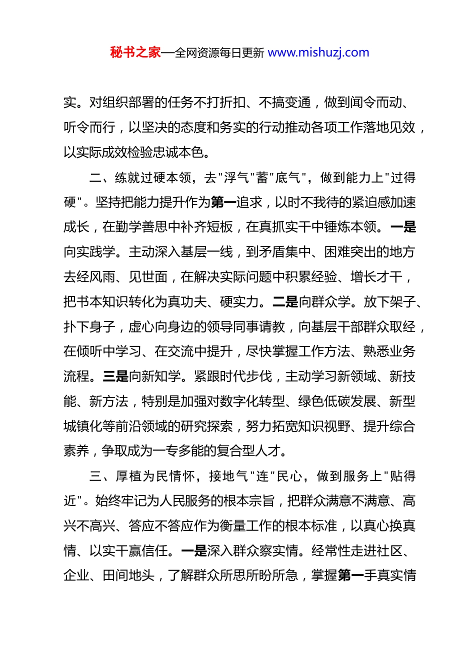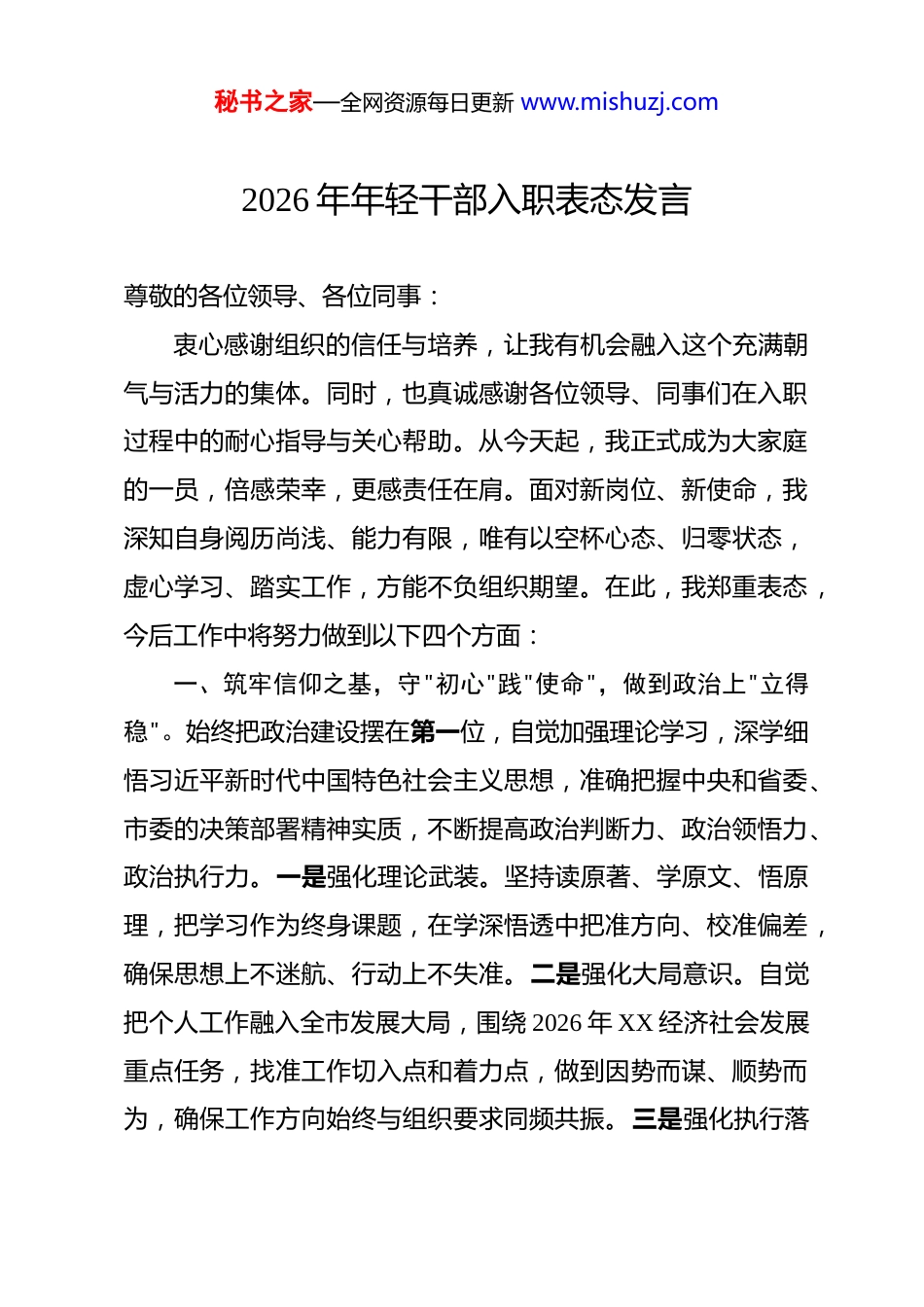 秘书之家—全网资源每日更新 www.mishuzj.com2026 年年轻干部入职表态发言 尊敬的各位领导、各位同事:衷心感谢组织的信任与培养,让我有机会融入这个充满朝气与活力的集体。同时,也真诚感谢各位领导、同事们在入职过程中的耐心指导与关心帮助。从今天起,我正式成为大家庭的一员,倍感荣幸,更感责任在肩。面对新岗位、新使命,我深知自身阅历尚浅、能力有限,唯有以空杯心态、归零状态,虚心学习、踏实工作,方能不负组织期望。在此,我郑重表态,今后工作中将努力做到以下四个方面:一、筑牢信仰之基,守"初心"践"使命",做到政治上"立得稳"。始终把政治建设摆在第一位,自觉加强理论学习,深学细悟习近平新时代中国特色社会主义思想,准确把握中央和省委、市委的决策部署精神实质,不断提高政治判断力、政治领悟力、政治执行力。一是强化理论武装。坚持读原著、学原文、悟原理,把学习作为终身课题,在学深悟透中把准方向、校准偏差,确保思想上不迷航、行动上不失准。二是强化大局意识。自觉把个人工作融入全市发展大局,围绕 2026 年 XX 经济社会发展重点任务,找准工作切入点和着力点,做到因势而谋、顺势而为,确保工作方向始终与组织要求同频共振。三是强化执行落秘书之家—全网资源每日更新 www.mishuzj.com实。对组织部署的任务不打折扣、不搞变通,做到闻令而动、听令而行,以坚决的态度和务实的行动推动各项工作落地见效,以实际成效检验忠诚本色。二、练就过硬本领,去"浮气"蓄"底气",做到能力上"过得硬"。坚持把能力提升作为第一追求,以时不我待的紧迫感加速成长,在勤学善思中补齐短板,在真抓实干中锤炼本领。一是向实践学。主动深入基层一线,到矛盾集中、困难突出的地方去经风雨、见世面,在解决实际问题中积累经验、增长才干,把书本知识转化为真功夫、硬实力。二是向群众学。放下架子、扑下身子,虚心向身边的领导同事请教,向基层干部群众取经,在倾听中学习、在交流中提升,尽快掌握工作方法、熟悉业务流程。三是向新知学。紧跟时代步伐,主动学习新领域、新技能、新方法,特别是加强对数字化转型、绿色低碳发展、新型城镇化等前沿领域的研究探索,努力拓宽知识视野、提升综合素养,争取成为一专多能的复合型人才。三、厚植为民情怀,接地气"连"民心,做到服务上"贴得近"。始终牢记为人民服务的根本宗旨,把群众满意不满意、高兴不高兴、答应不答应作为衡量工作的根本标准,以真心换真情、以实干赢信任。一是深入群众察实情。经常性走进社区、企业、田间地头,了解群众所思所盼所急,掌握第一手真实情秘书之家—全网资源每日更新 www.mishuzj.com况,不做"键盘干部"、不当"坐堂先生",做到心中有数、手中有策。二是聚焦需求办实事。围绕群众反映集中的就业、教育、医疗、养老等急难愁盼问题,主动领题、积极破题,用心用情办好每一件民生实事,让群众切实感受到组织的温暖和关怀。三是畅通渠道听民声。注重倾听基层声音,拓宽群众意见反馈渠道,对群众的合理诉求第一时间回应、高效办理,做到件件有回音、事事有着落,在密切联系群众中锤炼作风、涵养情怀。四、恪守清廉底线,守"规矩"存"正气",做到作风上"站得直"。始终把纪律规矩挺在前面,绷紧廉洁自律这根弦,守住底线、不碰红线、远离高压线,以清正廉洁的作风树好形象、立好口碑。一是严守政治纪律。时刻保持政治上的清醒和坚定,在大是大非面前旗帜鲜明,在风浪考验面前立场坚定,坚决维护组织权威,做到言行一致、表里如一。二是严守廉洁纪律。自觉净化"三圈"——社交圈、生活圈、朋友圈,管好自己、管好家人、管好身边人,从小事小节上加强修养,从一点一滴中砥砺品质,扣好廉洁从政的"第一粒扣子"。三是严守工作纪律。秉持严谨细致的工作态度,保守工作秘密,严守职业操守,对每一项经手的工作精益求精、尽善尽美,以"功成不必在我、功成必定有我"的境界和担当,书写无愧于时代的青春答卷。各位领导、同事们,千言万语化作一句话:请组织放心,秘书之家—全网资源每日更新 www.mishuzj.com请各位领导和同事监督!在今后的工作中,我将以"归零"的心态再出发、以"冲刺"的姿态再加速、...