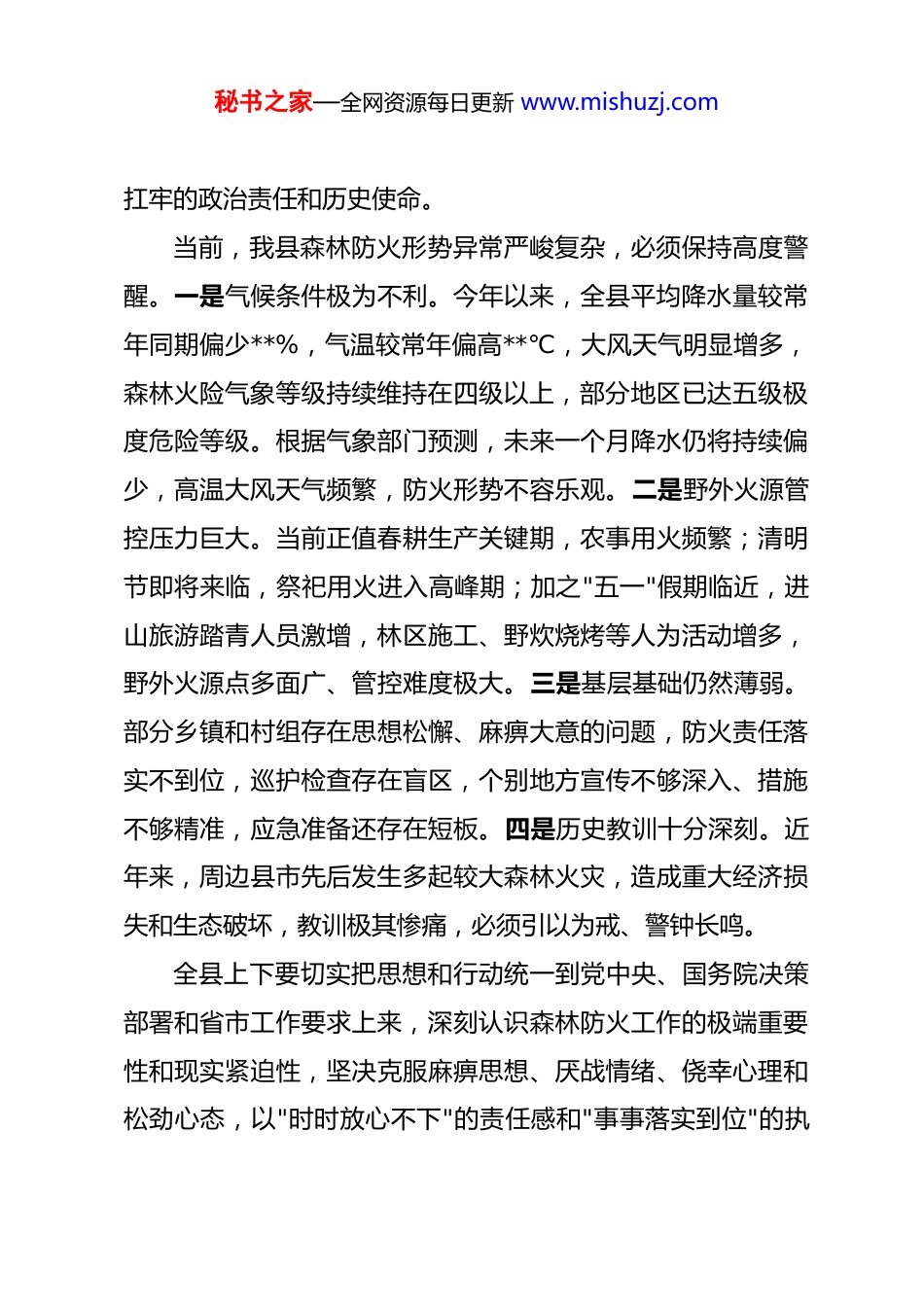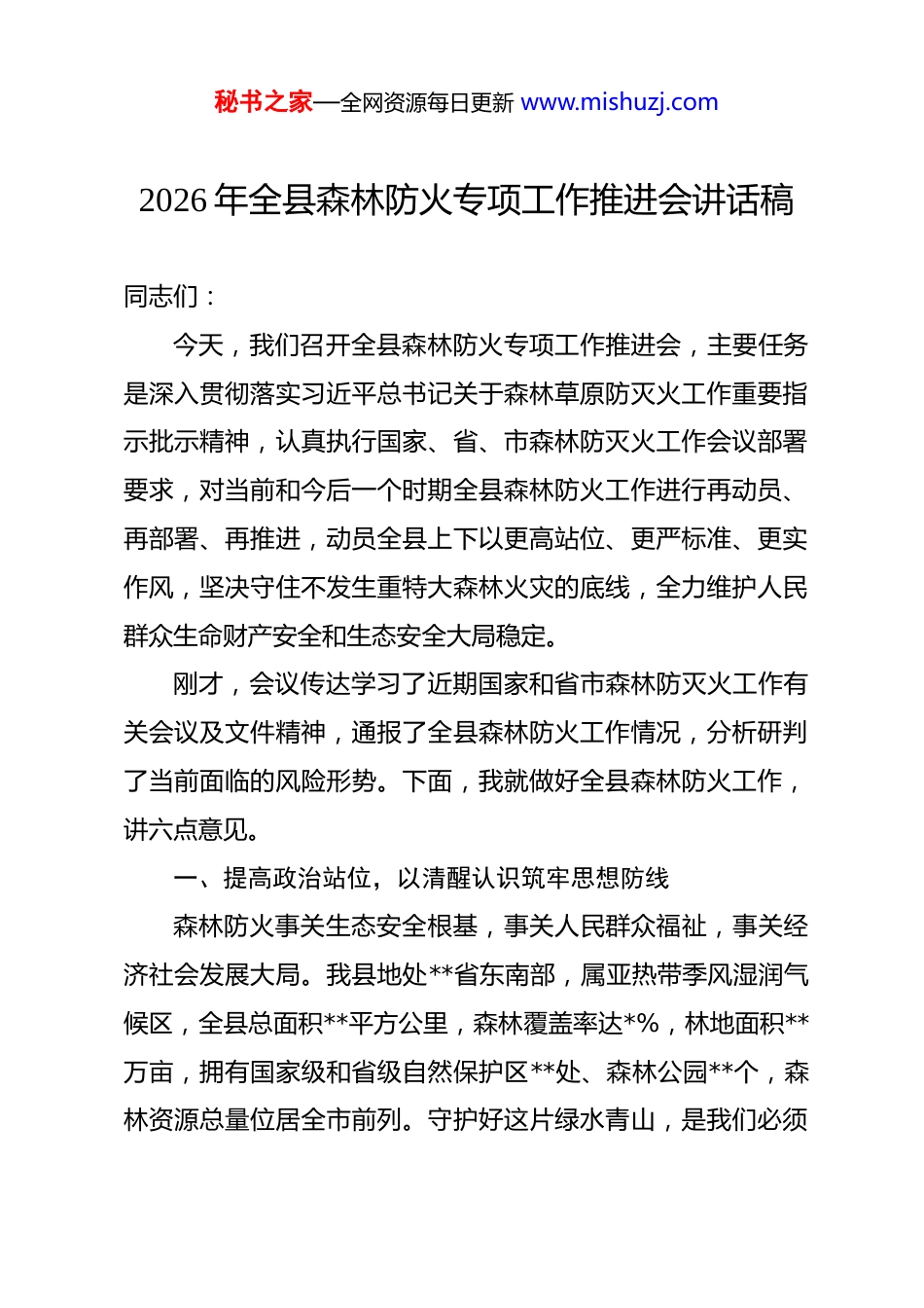 秘书之家—全网资源每日更新 www.mishuzj.com2026 年全县森林防火专项工作推进会讲话稿 同志们:今天,我们召开全县森林防火专项工作推进会,主要任务是深入贯彻落实习近平总书记关于森林草原防灭火工作重要指示批示精神,认真执行国家、省、市森林防灭火工作会议部署要求,对当前和今后一个时期全县森林防火工作进行再动员、再部署、再推进,动员全县上下以更高站位、更严标准、更实作风,坚决守住不发生重特大森林火灾的底线,全力维护人民群众生命财产安全和生态安全大局稳定。刚才,会议传达学习了近期国家和省市森林防灭火工作有关会议及文件精神,通报了全县森林防火工作情况,分析研判了当前面临的风险形势。下面,我就做好全县森林防火工作,讲六点意见。一、提高政治站位,以清醒认识筑牢思想防线森林防火事关生态安全根基,事关人民群众福祉,事关经济社会发展大局。我县地处**省东南部,属亚热带季风湿润气候区,全县总面积**平方公里,森林覆盖率达*%,林地面积**万亩,拥有国家级和省级自然保护区**处、森林公园**个,森林资源总量位居全市前列。守护好这片绿水青山,是我们必须秘书之家—全网资源每日更新 www.mishuzj.com扛牢的政治责任和历史使命。当前,我县森林防火形势异常严峻复杂,必须保持高度警醒。一是气候条件极为不利。今年以来,全县平均降水量较常年同期偏少**%,气温较常年偏高**℃,大风天气明显增多,森林火险气象等级持续维持在四级以上,部分地区已达五级极度危险等级。根据气象部门预测,未来一个月降水仍将持续偏少,高温大风天气频繁,防火形势不容乐观。二是野外火源管控压力巨大。当前正值春耕生产关键期,农事用火频繁;清明节即将来临,祭祀用火进入高峰期;加之"五一"假期临近,进山旅游踏青人员激增,林区施工、野炊烧烤等人为活动增多,野外火源点多面广、管控难度极大。三是基层基础仍然薄弱。部分乡镇和村组存在思想松懈、麻痹大意的问题,防火责任落实不到位,巡护检查存在盲区,个别地方宣传不够深入、措施不够精准,应急准备还存在短板。四是历史教训十分深刻。近年来,周边县市先后发生多起较大森林火灾,造成重大经济损失和生态破坏,教训极其惨痛,必须引以为戒、警钟长鸣。全县上下要切实把思想和行动统一到党中央、国务院决策部署和省市工作要求上来,深刻认识森林防火工作的极端重要性和现实紧迫性,坚决克服麻痹思想、厌战情绪、侥幸心理和松劲心态,以"时时放心不下"的责任感和"事事落实到位"的执秘书之家—全网资源每日更新 www.mishuzj.com行力,全力以赴打好森林防火攻坚战、持久战。二、压实防火责任,以严密体系筑牢制度防线森林防火是一项系统工程,必须构建权责明晰、运转高效的责任体系,确保防火责任纵向到底、横向到边、不留死角。(一)全面压实各级领导责任。一是严格落实林长制。县级总林长对全县森林防火工作负总责,各乡镇林长对本辖区森林防火工作负直接责任,村(社区)级林长对本村森林防火工作负具体责任。要健全"县—乡(镇)—村—组—护林员"五级防控网格,将防火责任明确到山头地块、落实到具体人头。县级林长每季度巡林不少于 2 次,乡镇级林长每月巡林不少于 2次,村级林长每周巡林不少于 1 次,护林员坚持全天候在岗巡护,确保山有人管、林有人护、火有人防、责有人担。二是严格执行包保责任制。实行县级领导包乡镇、乡镇领导包村组、村组干部包山头地块的三级包保制度,逐级签订防火责任书,建立防火责任台账,实行清单化管理、销号式推进。(二)全面压实部门监管责任。一是强化统筹协调。县森林防灭火指挥部办公室(县应急管理局)要发挥好牵头抓总、统筹协调作用,定期召开联席会议,及时研判形势、部署任务、协调推进。二是强化分工协作。县林业局要抓好火源管控和护林员管理,县公安局要依法严厉打击野外违规用火和失火犯罪秘书之家—全网资源每日更新 www.mishuzj.com行为,县民政局要做好清明祭扫安全管理,县教育局要加强中小学校森林防火教育,县气象局要及时发布森林火险气象等级预警,县融媒体中心要加大防火宣传力度,县交通运输局、县文旅局等部门要结合各自职责做好...