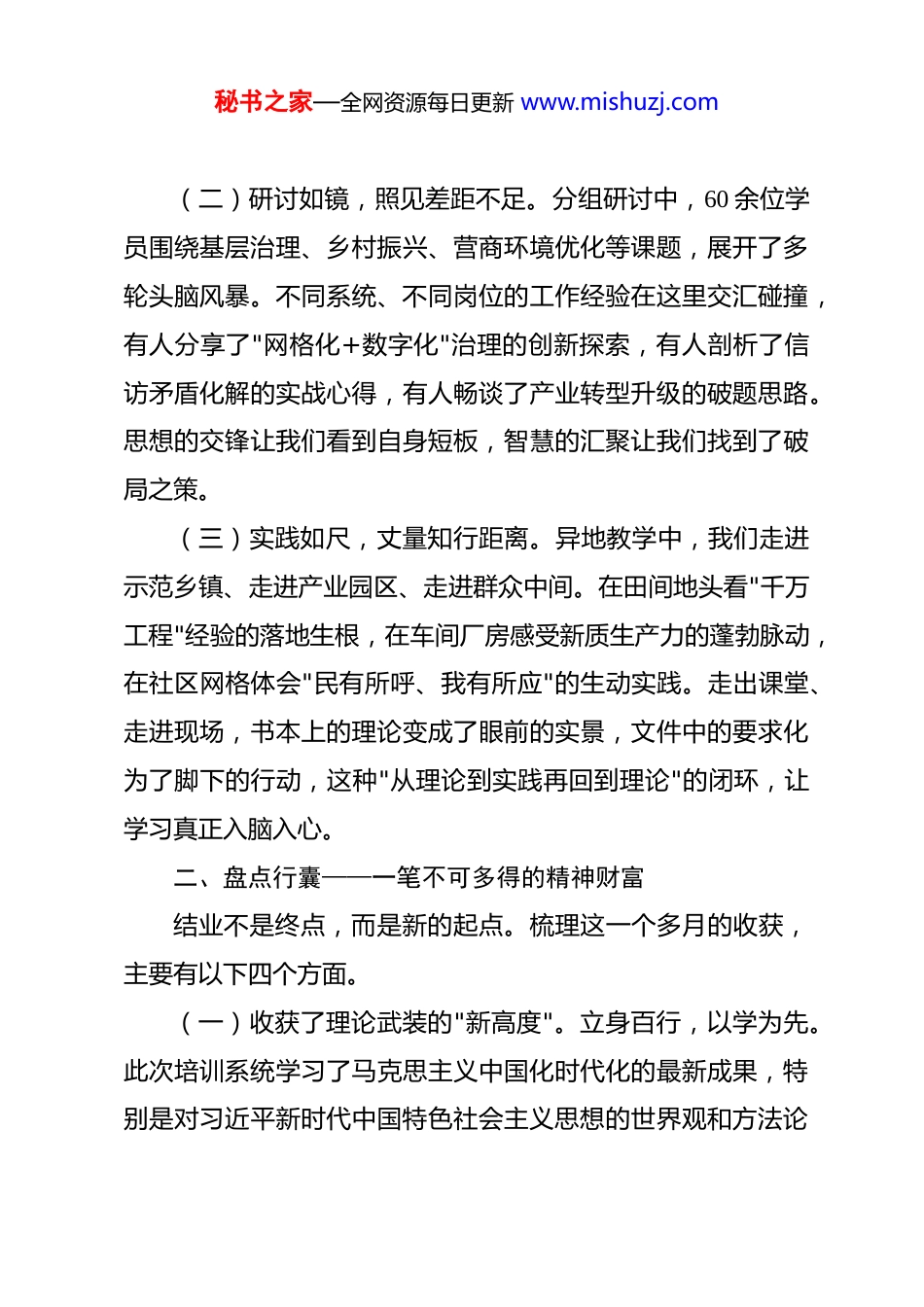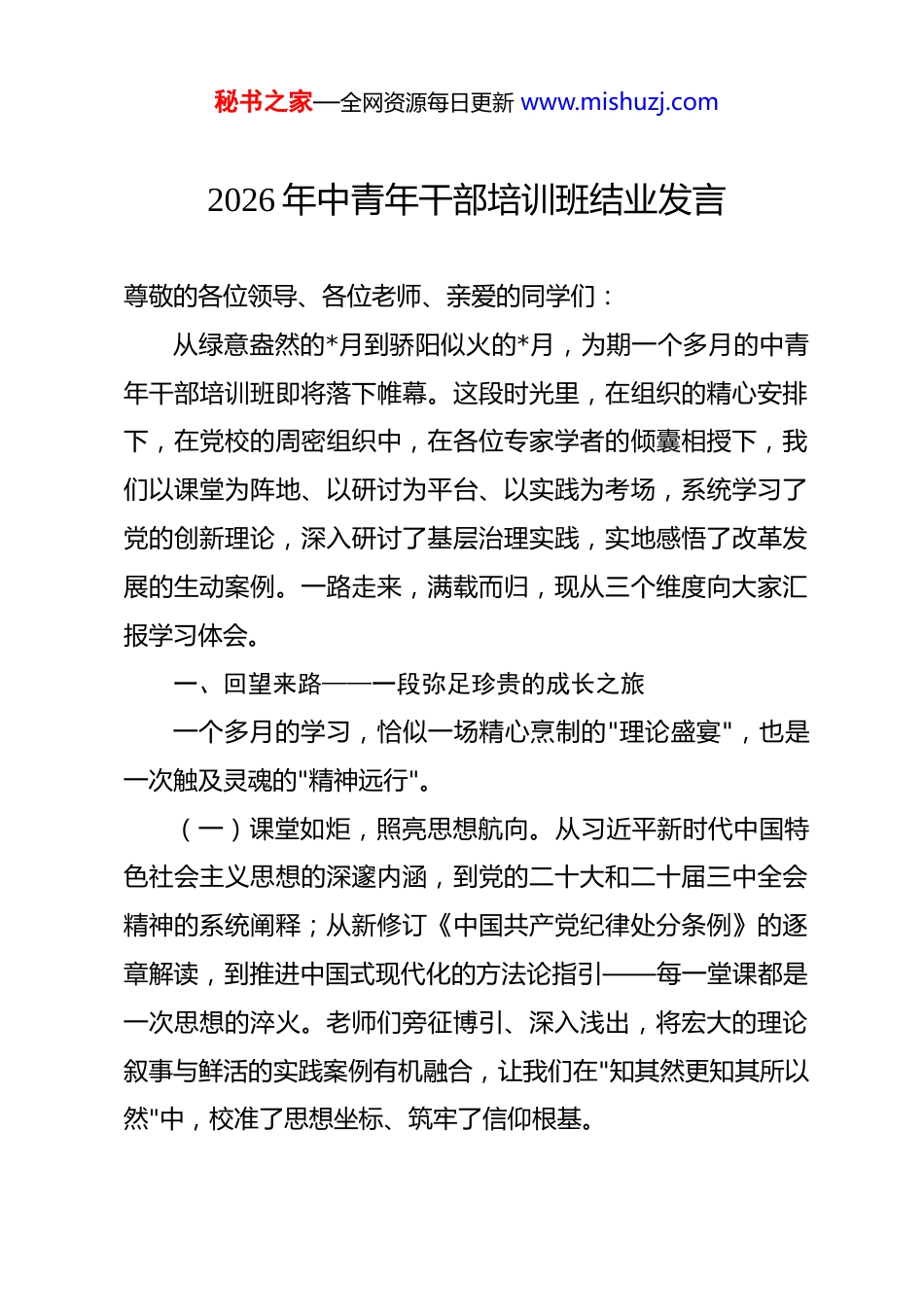 秘书之家—全网资源每日更新 www.mishuzj.com2026 年中青年干部培训班结业发言 尊敬的各位领导、各位老师、亲爱的同学们:从绿意盎然的*月到骄阳似火的*月,为期一个多月的中青年干部培训班即将落下帷幕。这段时光里,在组织的精心安排下,在党校的周密组织中,在各位专家学者的倾囊相授下,我们以课堂为阵地、以研讨为平台、以实践为考场,系统学习了党的创新理论,深入研讨了基层治理实践,实地感悟了改革发展的生动案例。一路走来,满载而归,现从三个维度向大家汇报学习体会。一、回望来路——一段弥足珍贵的成长之旅一个多月的学习,恰似一场精心烹制的"理论盛宴",也是一次触及灵魂的"精神远行"。(一)课堂如炬,照亮思想航向。从习近平新时代中国特色社会主义思想的深邃内涵,到党的二十大和二十届三中全会精神的系统阐释;从新修订《中国共产党纪律处分条例》的逐章解读,到推进中国式现代化的方法论指引——每一堂课都是一次思想的淬火。老师们旁征博引、深入浅出,将宏大的理论叙事与鲜活的实践案例有机融合,让我们在"知其然更知其所以然"中,校准了思想坐标、筑牢了信仰根基。秘书之家—全网资源每日更新 www.mishuzj.com(二)研讨如镜,照见差距不足。分组研讨中,60 余位学员围绕基层治理、乡村振兴、营商环境优化等课题,展开了多轮头脑风暴。不同系统、不同岗位的工作经验在这里交汇碰撞,有人分享了"网格化+数字化"治理的创新探索,有人剖析了信访矛盾化解的实战心得,有人畅谈了产业转型升级的破题思路。思想的交锋让我们看到自身短板,智慧的汇聚让我们找到了破局之策。(三)实践如尺,丈量知行距离。异地教学中,我们走进示范乡镇、走进产业园区、走进群众中间。在田间地头看"千万工程"经验的落地生根,在车间厂房感受新质生产力的蓬勃脉动,在社区网格体会"民有所呼、我有所应"的生动实践。走出课堂、走进现场,书本上的理论变成了眼前的实景,文件中的要求化为了脚下的行动,这种"从理论到实践再回到理论"的闭环,让学习真正入脑入心。二、盘点行囊——一笔不可多得的精神财富结业不是终点,而是新的起点。梳理这一个多月的收获,主要有以下四个方面。(一)收获了理论武装的"新高度"。立身百行,以学为先。此次培训系统学习了马克思主义中国化时代化的最新成果,特别是对习近平新时代中国特色社会主义思想的世界观和方法论秘书之家—全网资源每日更新 www.mishuzj.com有了更为深刻的理解把握。"六个必须坚持"不仅是认识论,更是方法论,为我们分析问题、研判形势、推动工作提供了强大的思想武器。理论学习没有休止符,回去以后,我将继续把理论学习作为"日课",常学常新、常悟常进,真正做到学思用贯通、知信行统一。(二)收获了党性锤炼的"新深度"。这次培训安排了党章党纪教育、廉政警示教育以及红色教育基地现场教学等环节。在王家坝闸前,感悟"舍小家、为大家"的蒙洼精神;在警示教育课堂上,那些曾经身居要职的落马干部的忏悔实录,令人警醒、发人深省。党性修养不是一朝一夕之功,而是一辈子的必修课。通过这次学习,我更加深刻地认识到,作为一名党员干部,必须时刻绑紧理想信念这根"安全带",守牢纪律规矩这条"生命线",做到心有所畏、言有所戒、行有所止。(三)收获了能力提升的"新维度"。案例教学中,我们围绕产业发展、基层治理、应急管理等主题,以小组为单位进行沙盘推演和模拟决策。从问题研判到方案论证,从风险评估到效果预判,每一个环节都是对综合能力的全方位检验。特别是通过跨领域、跨部门的交流研讨,拓宽了工作视野,优化了思维方式,提升了解决复杂问题的系统能力。这些方法和经验,将直接转化为今后推动工作的实际本领。秘书之家—全网资源每日更新 www.mishuzj.com(四)收获了同窗情谊的"新温度"。第 XX 期中青年干部培训班,汇聚了来自全市各县市区、各部门的优秀干部。一个多月的朝夕相处,从课堂上的思想碰撞到课后的促膝长谈,从运动场上的挥汗如雨到食堂里的欢声笑语,我们以"同学"之名,结下了真挚的情谊。这份在学习中淬炼、在交流中升华的友谊,是最宝贵的"同学资源",也必将转化为今后工作中携手并进的...
