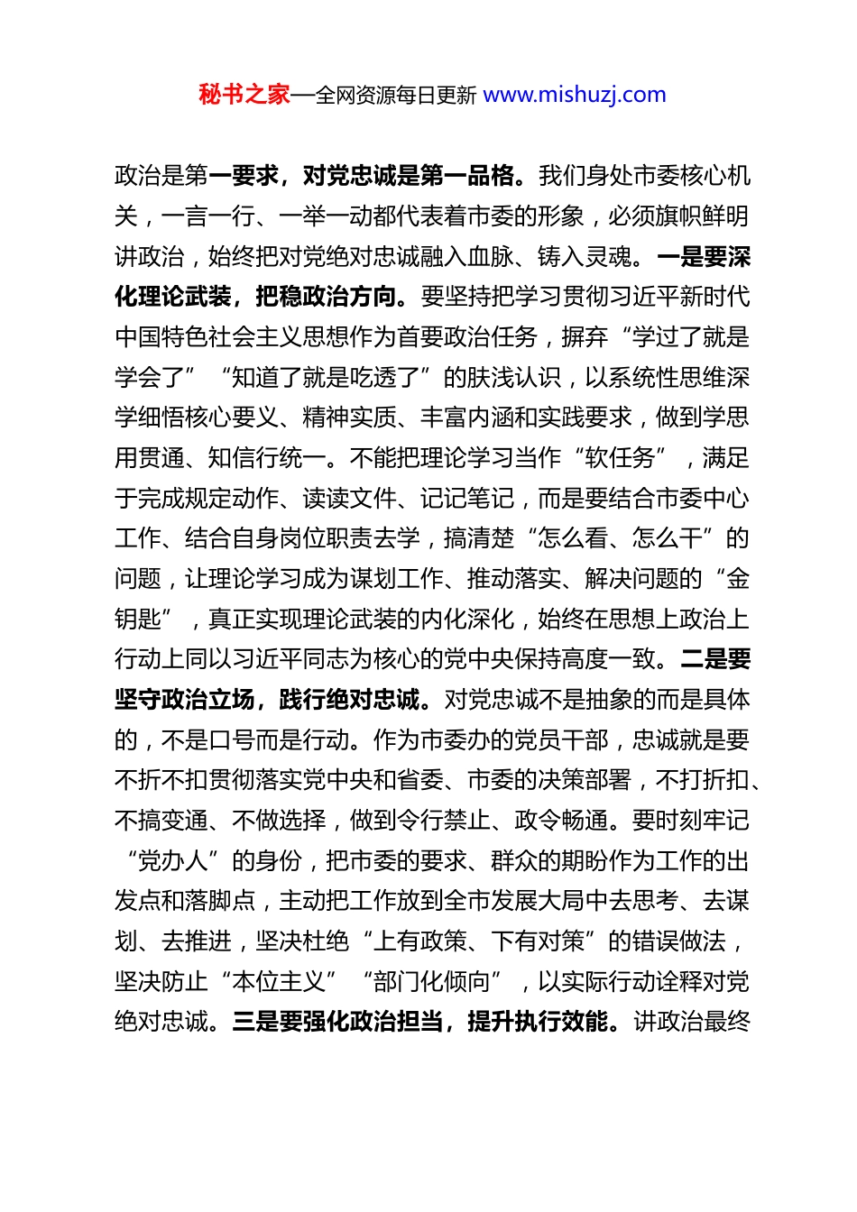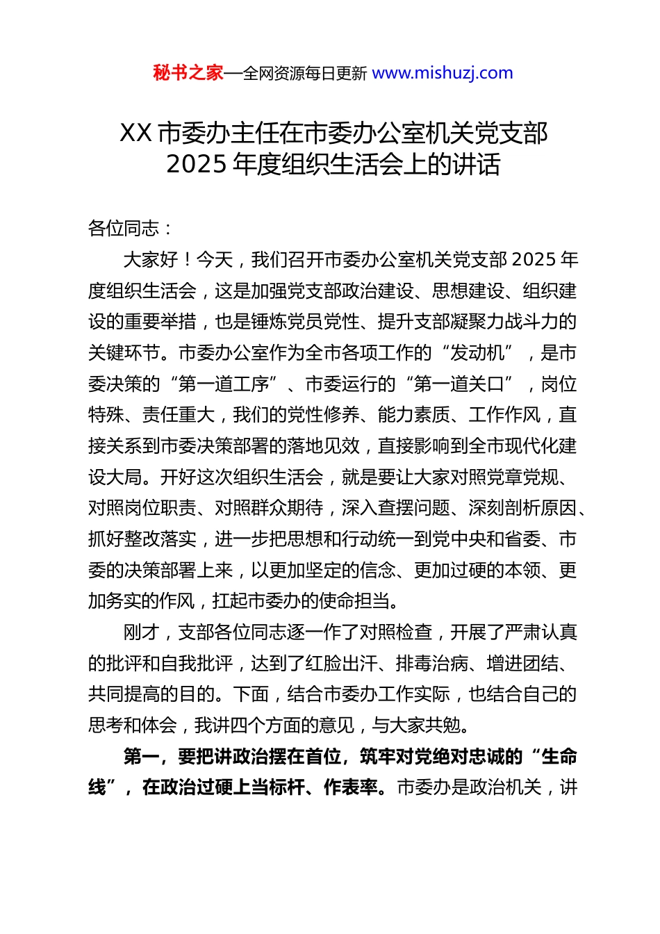 秘书之家—全网资源每日更新 www.mishuzj.comXX 市委办主任在市委办公室机关党支部2025 年度组织生活会上的讲话各位同志:大家好!今天,我们召开市委办公室机关党支部 2025 年度组织生活会,这是加强党支部政治建设、思想建设、组织建设的重要举措,也是锤炼党员党性、提升支部凝聚力战斗力的关键环节。市委办公室作为全市各项工作的“发动机”,是市委决策的“第一道工序”、市委运行的“第一道关口”,岗位特殊、责任重大,我们的党性修养、能力素质、工作作风,直接关系到市委决策部署的落地见效,直接影响到全市现代化建设大局。开好这次组织生活会,就是要让大家对照党章党规、对照岗位职责、对照群众期待,深入查摆问题、深刻剖析原因、抓好整改落实,进一步把思想和行动统一到党中央和省委、市委的决策部署上来,以更加坚定的信念、更加过硬的本领、更加务实的作风,扛起市委办的使命担当。刚才,支部各位同志逐一作了对照检查,开展了严肃认真的批评和自我批评,达到了红脸出汗、排毒治病、增进团结、共同提高的目的。下面,结合市委办工作实际,也结合自己的思考和体会,我讲四个方面的意见,与大家共勉。第一,要把讲政治摆在首位,筑牢对党绝对忠诚的“生命线”,在政治过硬上当标杆、作表率。市委办是政治机关,讲秘书之家—全网资源每日更新 www.mishuzj.com政治是第一要求,对党忠诚是第一品格。我们身处市委核心机关,一言一行、一举一动都代表着市委的形象,必须旗帜鲜明讲政治,始终把对党绝对忠诚融入血脉、铸入灵魂。一是要深化理论武装,把稳政治方向。要坚持把学习贯彻习近平新时代中国特色社会主义思想作为首要政治任务,摒弃“学过了就是学会了”“知道了就是吃透了”的肤浅认识,以系统性思维深学细悟核心要义、精神实质、丰富内涵和实践要求,做到学思用贯通、知信行统一。不能把理论学习当作“软任务”,满足于完成规定动作、读读文件、记记笔记,而是要结合市委中心工作、结合自身岗位职责去学,搞清楚“怎么看、怎么干”的问题,让理论学习成为谋划工作、推动落实、解决问题的“金钥匙”,真正实现理论武装的内化深化,始终在思想上政治上行动上同以习近平同志为核心的党中央保持高度一致。二是要坚守政治立场,践行绝对忠诚。对党忠诚不是抽象的而是具体的,不是口号而是行动。作为市委办的党员干部,忠诚就是要不折不扣贯彻落实党中央和省委、市委的决策部署,不打折扣、不搞变通、不做选择,做到令行禁止、政令畅通。要时刻牢记“党办人”的身份,把市委的要求、群众的期盼作为工作的出发点和落脚点,主动把工作放到全市发展大局中去思考、去谋划、去推进,坚决杜绝“上有政策、下有对策”的错误做法,坚决防止“本位主义”“部门化倾向”,以实际行动诠释对党绝对忠诚。三是要强化政治担当,提升执行效能。讲政治最终秘书之家—全网资源每日更新 www.mishuzj.com要体现在抓落实上。市委的各项决策部署,最终要靠市委办来统筹、来协调、来督查、来落实,我们是推动市委决策落地的“第一棒”。全体党员干部要持续强化推动工作落实的主动性和自觉性,树立“马上就办、真抓实干”的理念,对市委交办的任务,不等不靠、不推不拖,第一时间研究、第一时间部署、第一时间落实,以“时时放心不下”的责任感,把每一项工作做细、做实、做好,确保市委的决策部署落地生根、开花结果。第二,要把强本领作为核心,聚焦服务大局履职尽责,在能力过硬上当标杆、作表率。市委办是市委的“参谋部”“后勤部”“督查部”,肩负着以文辅政、督查落实、统筹协调、服务保障等重要职责,没有过硬的能力素质,就扛不起这份责任,也干不好这份工作。面对全市现代化建设的新形势新任务,我们必须聚焦发展大局,不断提升履职能力,以过硬的本领为市委保驾护航。一是要提升以文辅政的精准度,当好“智囊团”。以文辅政是市委办的核心职责之一,文稿起草、调查研究是我们的“看家本领”。要走出办公室,深入基层、深入一线、深入群众,开展常态化、精准化的调查研究,摸清基层的实际情况、掌握群众的所思所盼、找准发展的堵点难点,把基层的好经验、好做法总结上来,...
