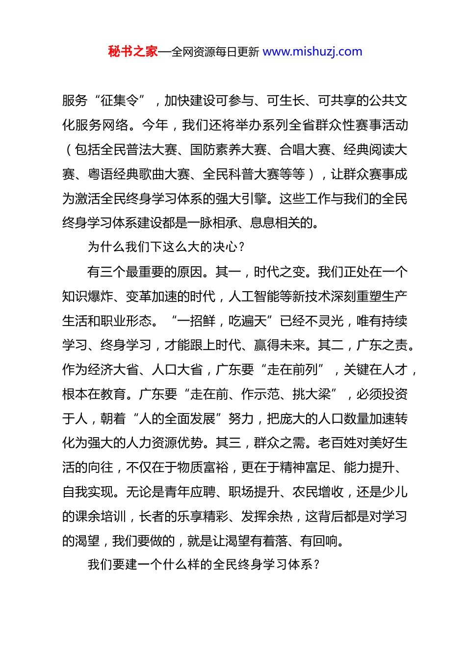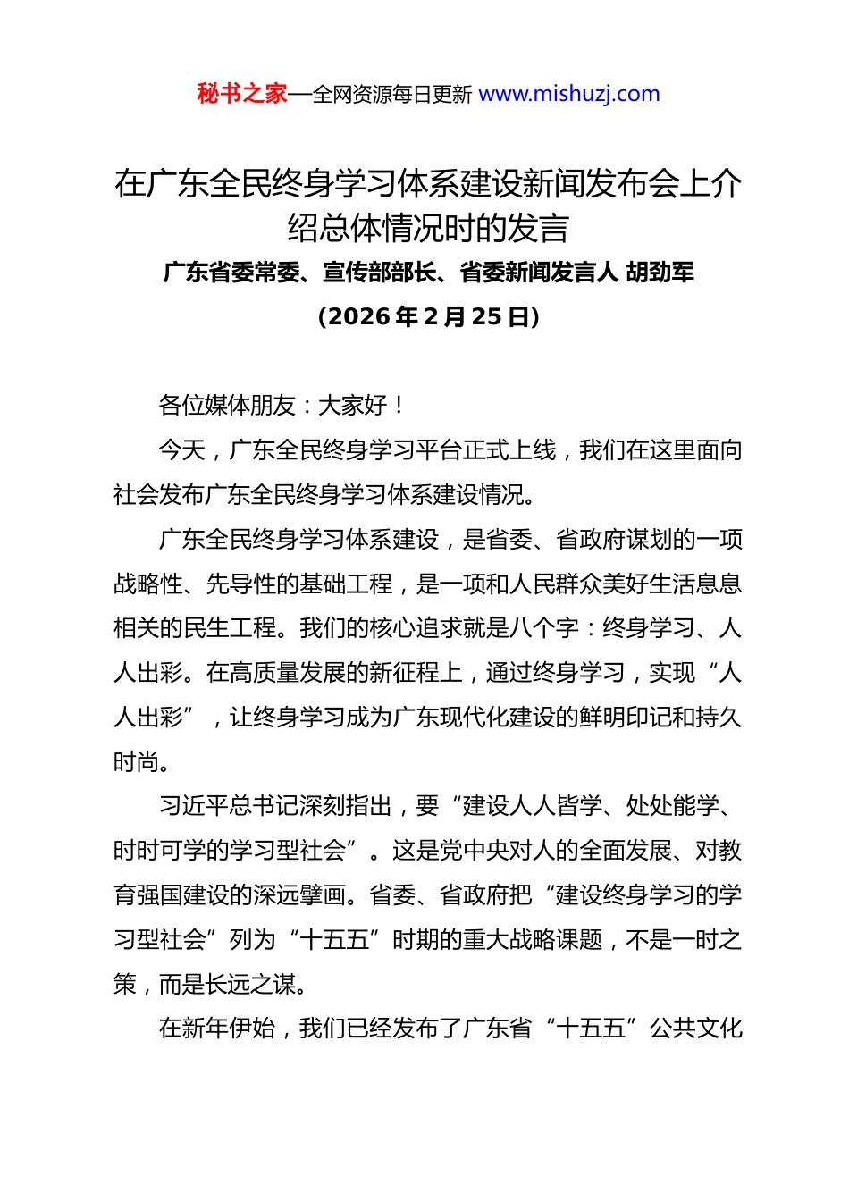 秘书之家—全网资源每日更新 www.mishuzj.com在广东全民终身学习体系建设新闻发布会上介绍总体情况时的发言广东省委常委、宣传部部长、省委新闻发言人 胡劲军(2026 年 2 月 25 日)各位媒体朋友:大家好!今天,广东全民终身学习平台正式上线,我们在这里面向社会发布广东全民终身学习体系建设情况。广东全民终身学习体系建设,是省委、省政府谋划的一项战略性、先导性的基础工程,是一项和人民群众美好生活息息相关的民生工程。我们的核心追求就是八个字:终身学习、人人出彩。在高质量发展的新征程上,通过终身学习,实现“人人出彩”,让终身学习成为广东现代化建设的鲜明印记和持久时尚。习近平总书记深刻指出,要“建设人人皆学、处处能学、时时可学的学习型社会”。这是党中央对人的全面发展、对教育强国建设的深远擘画。省委、省政府把“建设终身学习的学习型社会”列为“十五五”时期的重大战略课题,不是一时之策,而是长远之谋。在新年伊始,我们已经发布了广东省“十五五”公共文化秘书之家—全网资源每日更新 www.mishuzj.com服务“征集令”,加快建设可参与、可生长、可共享的公共文化服务网络。今年,我们还将举办系列全省群众性赛事活动(包括全民普法大赛、国防素养大赛、合唱大赛、经典阅读大赛、粤语经典歌曲大赛、全民科普大赛等等),让群众赛事成为激活全民终身学习体系的强大引擎。这些工作与我们的全民终身学习体系建设都是一脉相承、息息相关的。为什么我们下这么大的决心?有三个最重要的原因。其一,时代之变。我们正处在一个知识爆炸、变革加速的时代,人工智能等新技术深刻重塑生产生活和职业形态。“一招鲜,吃遍天”已经不灵光,唯有持续学习、终身学习,才能跟上时代、赢得未来。其二,广东之责。作为经济大省、人口大省,广东要“走在前列”,关键在人才,根本在教育。广东要“走在前、作示范、挑大梁”,必须投资于人,朝着“人的全面发展”努力,把庞大的人口数量加速转化为强大的人力资源优势。其三,群众之需。老百姓对美好生活的向往,不仅在于物质富裕,更在于精神富足、能力提升、自我实现。无论是青年应聘、职场提升、农民增收,还是少儿的课余培训,长者的乐享精彩、发挥余热,这背后都是对学习的渴望,我们要做的,就是让渴望有着落、有回响。我们要建一个什么样的全民终身学习体系?秘书之家—全网资源每日更新 www.mishuzj.com广东全民终身学习体系是一个超级学习生态系统和服务体系闭环。一切要从人民群众的需求出发。不知道去哪里学?我们就建一个“统一入口”,登录一次,全网通学。不知道学什么?我们就开一个“课程超市”,把全省、全国最好的课程都摆上货架,任你挑择。怕课程过时老旧?我们就创新评价机制,让课程常换常新。怕学完用不上?那我们打通“学分银行”,营造比学赶超的激励机制。目的就是要做到人人皆学、处处能学、时时可学。我们的全民终身学习体系要重点打造六个工程:第一,思政育人工程,这是“思想的充电站”。把广东推进中国式现代化的生动实践变成思政“金课”,让“金课”“金师”走到百姓的身边。第二,学历提升工程,这是“成长的立交桥”。重点面向粤东粤西粤北的青年、产业工人,每年提供 30 万个以上优质继续教育学位,让大家一边工作一边圆大学的梦想。第三,技能提质工程,这是“职业的加速器”。围绕先进制造、数字经济、康养照护等急需领域,每年培训 200 万人次以上,从源头破解“技能的代差”,学到的就是企业所需要的。第四,文化艺术润心工程,这是“精神的营养餐”。实施“五年百部文艺精品创作”,整合全省数字文化资源,让优秀秘书之家—全网资源每日更新 www.mishuzj.com文化特别是特色岭南文化走进千家万户。第五,“粤学粤优”品牌工程,这是“精准的服务包”。为外卖小哥办“骑手学院”,为银发族开“乐龄课堂”,为新农人建“乡村振兴学院”……总之,重点人群需要什么,我们就服务什么,提供什么。第六,学习网络贯通工程,这是“学习一张网”。推动学习型城市、社区、企业、家庭建设,打通线上线下资源,建立健全城乡一体的县(市、区)—镇(街)—村(社区)三级...