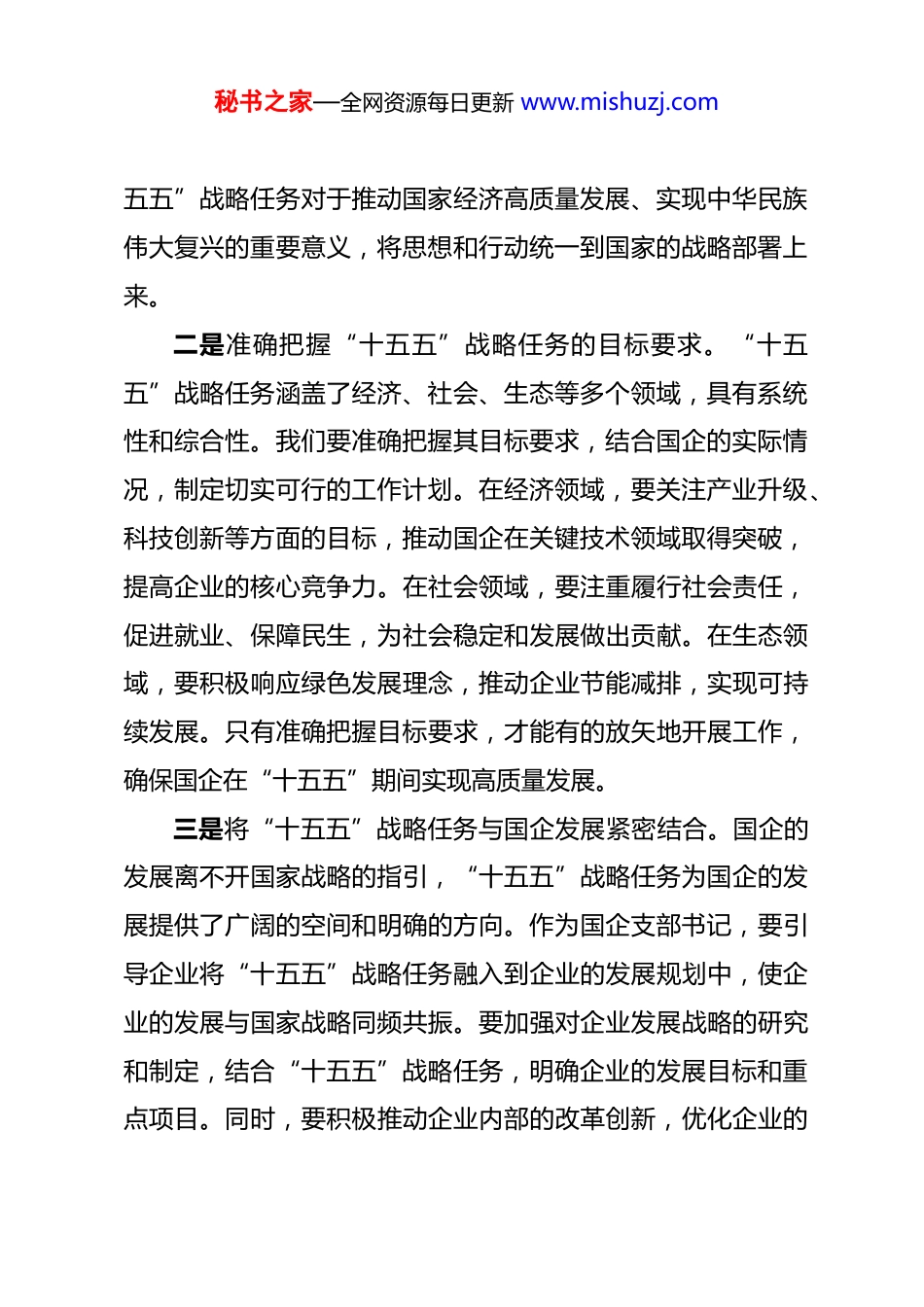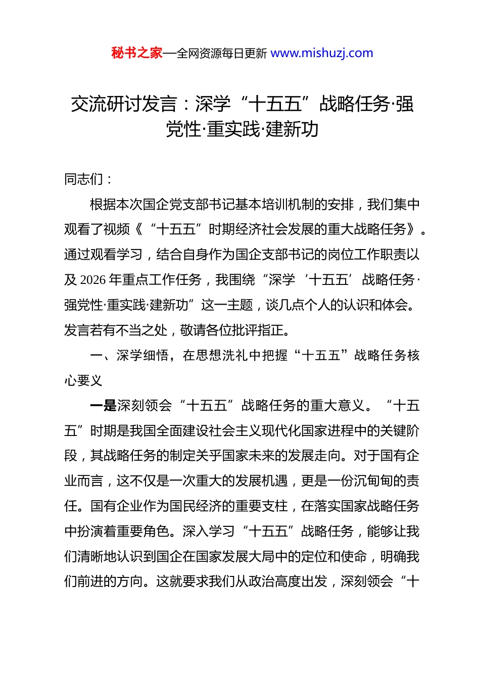 秘书之家—全网资源每日更新 www.mishuzj.com交流研讨发言:深学“十五五”战略任务·强党性·重实践·建新功 同志们:根据本次国企党支部书记基本培训机制的安排,我们集中观看了视频《“十五五”时期经济社会发展的重大战略任务》。通过观看学习,结合自身作为国企支部书记的岗位工作职责以及 2026 年重点工作任务,我围绕“深学‘十五五’战略任务·强党性·重实践·建新功”这一主题,谈几点个人的认识和体会。发言若有不当之处,敬请各位批评指正。一、深学细悟,在思想洗礼中把握“十五五”战略任务核心要义一是深刻领会“十五五”战略任务的重大意义。“十五五”时期是我国全面建设社会主义现代化国家进程中的关键阶段,其战略任务的制定关乎国家未来的发展走向。对于国有企业而言,这不仅是一次重大的发展机遇,更是一份沉甸甸的责任。国有企业作为国民经济的重要支柱,在落实国家战略任务中扮演着重要角色。深入学习“十五五”战略任务,能够让我们清晰地认识到国企在国家发展大局中的定位和使命,明确我们前进的方向。这就要求我们从政治高度出发,深刻领会“十秘书之家—全网资源每日更新 www.mishuzj.com五五”战略任务对于推动国家经济高质量发展、实现中华民族伟大复兴的重要意义,将思想和行动统一到国家的战略部署上来。二是准确把握“十五五”战略任务的目标要求。“十五五”战略任务涵盖了经济、社会、生态等多个领域,具有系统性和综合性。我们要准确把握其目标要求,结合国企的实际情况,制定切实可行的工作计划。在经济领域,要关注产业升级、科技创新等方面的目标,推动国企在关键技术领域取得突破,提高企业的核心竞争力。在社会领域,要注重履行社会责任,促进就业、保障民生,为社会稳定和发展做出贡献。在生态领域,要积极响应绿色发展理念,推动企业节能减排,实现可持续发展。只有准确把握目标要求,才能有的放矢地开展工作,确保国企在“十五五”期间实现高质量发展。三是将“十五五”战略任务与国企发展紧密结合。国企的发展离不开国家战略的指引,“十五五”战略任务为国企的发展提供了广阔的空间和明确的方向。作为国企支部书记,要引导企业将“十五五”战略任务融入到企业的发展规划中,使企业的发展与国家战略同频共振。要加强对企业发展战略的研究和制定,结合“十五五”战略任务,明确企业的发展目标和重点项目。同时,要积极推动企业内部的改革创新,优化企业的秘书之家—全网资源每日更新 www.mishuzj.com管理体制和运营机制,提高企业的运营效率和管理水平,为落实“十五五”战略任务提供有力保障。二、对标检视,在自我反思中查找工作短板与不足一是对照“十五五”战略任务查找政治站位差距。反思自身工作,在将“十五五”战略任务与企业政治建设相结合方面还存在不足。有时对国家战略的政治意义和深远影响理解不够深刻,在推动企业发展过程中,没有充分从政治高度来谋划和部署工作。对企业贯彻落实国家战略的监督和指导不够到位,导致部分工作在执行过程中出现偏差。这反映出在政治站位上还存在一定的差距,需要进一步提高政治敏锐性和政治责任感,将“十五五”战略任务作为企业政治建设的重要内容,确保企业始终与党中央保持高度一致。二是对照“十五五”战略任务查找工作能力短板。“十五五”战略任务对国企的发展提出了更高的要求,也对国企支部书记的工作能力提出了新的挑战。在实际工作中,发现自身在推动企业科技创新、产业升级等方面的能力还不够强。对新技术、新产业的了解和掌握不够深入,缺乏有效的工作方法和手段来推动企业在这些领域的发展。在应对复杂问题和挑战时,有时显得力不从心,缺乏创新思维和解决问题的能力。这反映出在工作能力上还存在明显的短板,需要不断学习和提升,以秘书之家—全网资源每日更新 www.mishuzj.com适应“十五五”战略任务的要求。三是对照“十五五”战略任务查找工作作风问题。在工作作风方面,还存在一些不足之处。有时存在形式主义、官僚主义的倾向,对工作的落实情况跟踪不够及时、不够深入,导致一些工作在执行过程中出现打折扣的现象。在与员工沟通交流方面,还不够主动、不够深入...