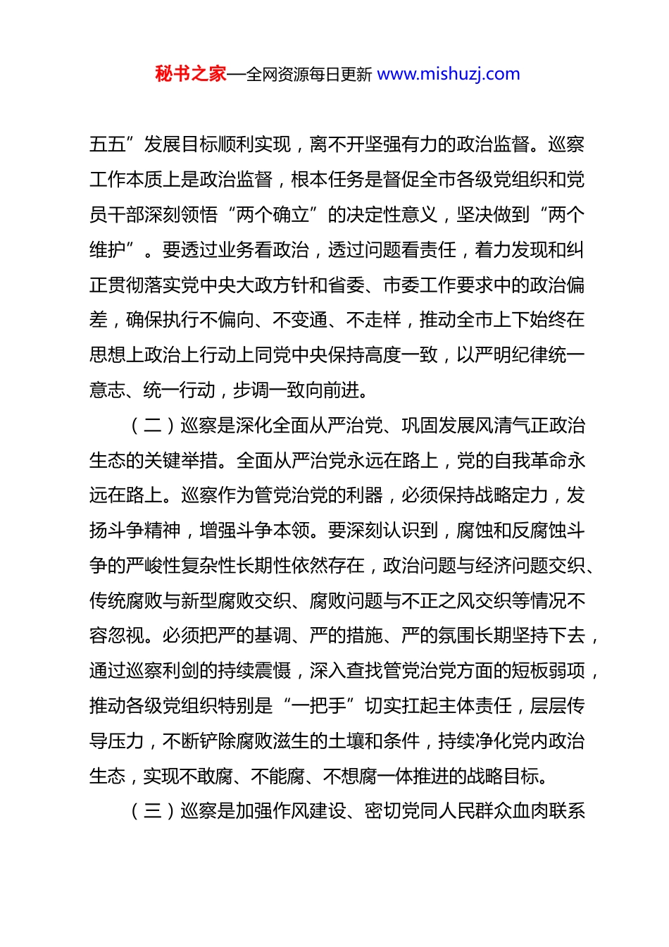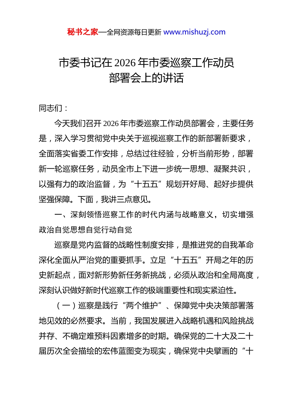 秘书之家—全网资源每日更新 www.mishuzj.com市委书记在 2026 年市委巡察工作动员部署会上的讲话 同志们:今天我们召开 2026 年市委巡察工作动员部署会,主要任务是,深入学习贯彻党中央关于巡视巡察工作的新部署新要求,全面落实省委工作安排,总结过往经验,分析当前形势,部署新一轮巡察任务,动员全市上下进一步统一思想、凝聚共识,以强有力的政治监督,为“十五五”规划开好局、起好步提供坚强保障。下面,我讲三点意见。一、深刻领悟巡察工作的时代内涵与战略意义,切实增强政治自觉思想自觉行动自觉巡察是党内监督的战略性制度安排,是推进党的自我革命深化全面从严治党的重要抓手。立足“十五五”开局之年的历史新起点,面对新形势新任务新挑战,必须从政治和全局高度,深刻认识做好新时代巡察工作的极端重要性和现实紧迫性。(一)巡察是践行“两个维护”、保障党中央决策部署落地见效的必然要求。当前,我国发展进入战略机遇和风险挑战并存、不确定难预料因素增多的时期。确保党的二十大及二十届历次全会描绘的宏伟蓝图变为现实,确保党中央擘画的“十秘书之家—全网资源每日更新 www.mishuzj.com五五”发展目标顺利实现,离不开坚强有力的政治监督。巡察工作本质上是政治监督,根本任务是督促全市各级党组织和党员干部深刻领悟“两个确立”的决定性意义,坚决做到“两个维护”。要透过业务看政治,透过问题看责任,着力发现和纠正贯彻落实党中央大政方针和省委、市委工作要求中的政治偏差,确保执行不偏向、不变通、不走样,推动全市上下始终在思想上政治上行动上同党中央保持高度一致,以严明纪律统一意志、统一行动,步调一致向前进。(二)巡察是深化全面从严治党、巩固发展风清气正政治生态的关键举措。全面从严治党永远在路上,党的自我革命永远在路上。巡察作为管党治党的利器,必须保持战略定力,发扬斗争精神,增强斗争本领。要深刻认识到,腐蚀和反腐蚀斗争的严峻性复杂性长期性依然存在,政治问题与经济问题交织、传统腐败与新型腐败交织、腐败问题与不正之风交织等情况不容忽视。必须把严的基调、严的措施、严的氛围长期坚持下去,通过巡察利剑的持续震慑,深入查找管党治党方面的短板弱项,推动各级党组织特别是“一把手”切实扛起主体责任,层层传导压力,不断铲除腐败滋生的土壤和条件,持续净化党内政治生态,实现不敢腐、不能腐、不想腐一体推进的战略目标。(三)巡察是加强作风建设、密切党同人民群众血肉联系秘书之家—全网资源每日更新 www.mishuzj.com的重要途径。党的作风是观察党群干群关系、人心向背的晴雨表。巡察工作必须始终坚持人民立场,着力发现和推动解决群众反映强烈、损害群众利益的突出问题。要巩固拓展深入贯彻中央八项规定精神学习教育成果,将其作为巡察监督的重点内容。要督促各级党组织和党员干部认真学习《关于加强党的作风建设论述摘编》《党政机关厉行节约反对浪费条例》等重要内容,深刻领会其核心要义和实践要求。要紧盯“四风”顽疾,特别是违规接受宴请、违规收送礼品礼金、违规发放津补贴、铺张浪费等突出问题,对顶风违纪行为露头就打、从严惩治。要通过巡察监督,推动作风建设常态长效,引导广大党员干部牢记“三个务必”,大力弘扬党的光荣传统和优良作风,以优良党风政风带动社风民风持续向上向好,不断夯实党的执政根基。二、准确把握新时代巡察工作的目标任务和监督重点,着力提升巡察监督的精准性实效性巡察工作必须紧紧围绕中心、服务大局,做到党中央决策部署到哪里、省委市委工作要求到哪里,巡察监督就跟进到哪里。2026 年巡察工作要紧扣“十五五”开局之年的特征,突出政治巡察定位,聚焦关键领域,实施精准监督。(一)聚焦“国之大者”,强化对贯彻落实党中央重大决秘书之家—全网资源每日更新 www.mishuzj.com策部署情况的监督检查。要将学习贯彻党的创新理论情况作为巡察监督的重中之重。重点了解各级党组织是否将学习《习近平谈治国理政》第五卷等重要著作,同深入传达学习党的二十届四中全会精神紧密结合起来,是否完整、准确、全面把握其精神实质、核心要义、实践要求,是否真正做到学思...