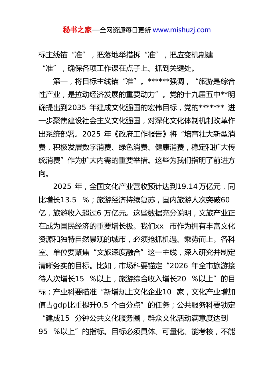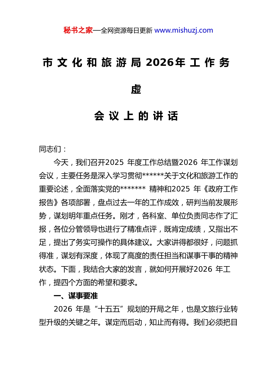 秘书之家—全网资源每日更新 www.mishuzj.com市 文 化 和 旅 游 局 2026年 工 作 务虚会 议 上 的 讲 话同志们:今天,我们召开2025 年度工作总结暨2026 年工作谋划会议,主要任务是深入学习贯彻******关于文化和旅游工作的重要论述,全面落实党的******* 精神和2025 年《政府工作报告》各项部署,盘点过去一年的工作成效,研判当前发展形势,谋划明年重点任务。刚才,各科室、单位负责同志作了汇报,各位分管领导也进行了精准点评,既肯定成绩,又指出不足,提出了务实可操作的具体建议。大家讲得都很好,问题抓得准,谋划有深度,体现了高度的责任担当和谋事干事的精神状态。下面,我结合大家的发言,就如何开展好2026 年工作,提四个方面的希望和要求。一、谋事要准2026 年是“十五五”规划的开局之年,也是文旅行业转型升级的关键之年。谋定而后动,知止而有得。我们必须把目秘书之家—全网资源每日更新 www.mishuzj.com标主线锚“准”,把落地举措拆“准”,把应变机制建“准”,确保各项工作谋在点子上、抓到关键处。第一,将目标主线锚“准”。******强调,“旅游是综合性产业,是拉动经济发展的重要动力”。党的十九届五中**明确提出到2035 年建成文化强国的宏伟目标,党的******* 进一步聚焦建设社会主义文化强国,对深化文化体制机制改革作出系统部署。2025 年《政府工作报告》将“培育壮大新型消费,积极发展数字消费、绿色消费、健康消费,稳定和扩大传统消费”作为扩大内需的重要举措。这些为我们指明了前进方向。2025 年,全国文化产业营收预计达到19.14万亿元,同比增长13.5 %;旅游经济持续复苏,国内旅游人次突破60亿,旅游收入超过6 万亿元。这些数据充分说明,文旅产业正在成为国民经济的重要增长极。我们xx市作为拥有丰富文化资源和独特自然景观的城市,必须抢抓机遇、乘势而上。各科室、单位要聚焦“文旅深度融合”这一主线,深入研究并制定清晰务实的目标。比如,市场科要锚定“2026 年全市旅游接待人次增长15 %以上,旅游综合收入增长20 %以上”的目标;产业科要瞄准“新增规上文化企业10 家,文化产业增加值占gdp比重提升0.5 个百分点”的任务;公共服务科要锁定“建成15 分钟公共文化服务圈,群众文化活动满意度达到95 %以上”的指标。目标必须具体、可量化、能考核,不能秘书之家—全网资源每日更新 www.mishuzj.com笼统模糊,更不能上下一般粗。要聚焦关键、切实可行,既体现“跳起来摘桃子”的进取精神,又充分考虑基础条件和发展实际,激发干事动力,避免好高骛远。第二,将落地举措拆“准”。一分部署,九分落实。必须将全局计划分解为具体项目、可量化任务,形成“任务书+路线图+时间表+责任人”的闭环体系。比如,我们谋划的“xx文化公园”项目,不能停留在概念阶段,要细化到“一季度完成规划设计方案,二季度启动征地拆迁,三季度开工建设,四季度完成主体工程”的进度安排;要量化到“总投资5亿元,年度投资2 亿元,新增就业岗位300个,年接待游客50 万人次”的绩效指标。产业扶持方面,不能简单说“加大对文旅企业支持力度”,而要明确“设立2000 万元文旅产业引导基金,对5 家重点演艺企业给予每家不超过100万元的补贴,对10 家民宿示范点给予每家20 万元的奖励”。公共文化服务方面,不能泛泛而谈“提升服务水平”,而要具体到“新建城市书房5 处,更新村级公共文化服务点100个,开展‘戏曲进乡村’演出300场,‘公益电影放映’5000 场”。只有将举措拆细、拆实、拆准,才能确保谋划有抓手、推进有实效。第三,将应变机制建“准”。当前,文旅市场瞬息万变,新需求、新业态、新模式层出不穷。必须建立常态化研判机制,定期跟踪动态、分析变化、评估成效,及时调整优化。比秘书之家—全网资源每日更新 www.mishuzj.com如,针对近年来火爆的“特种兵式旅游”“citywalk”“沉浸式演艺”等新兴业态,我们要成立专项研判小组,每季度召开一次市场分析会,研究其对本地市场的影响,及时出台引导规范措施。要建立“月调度、季评估、年考核”的动态监测体系,对重点景区、重点企业、重点项目...