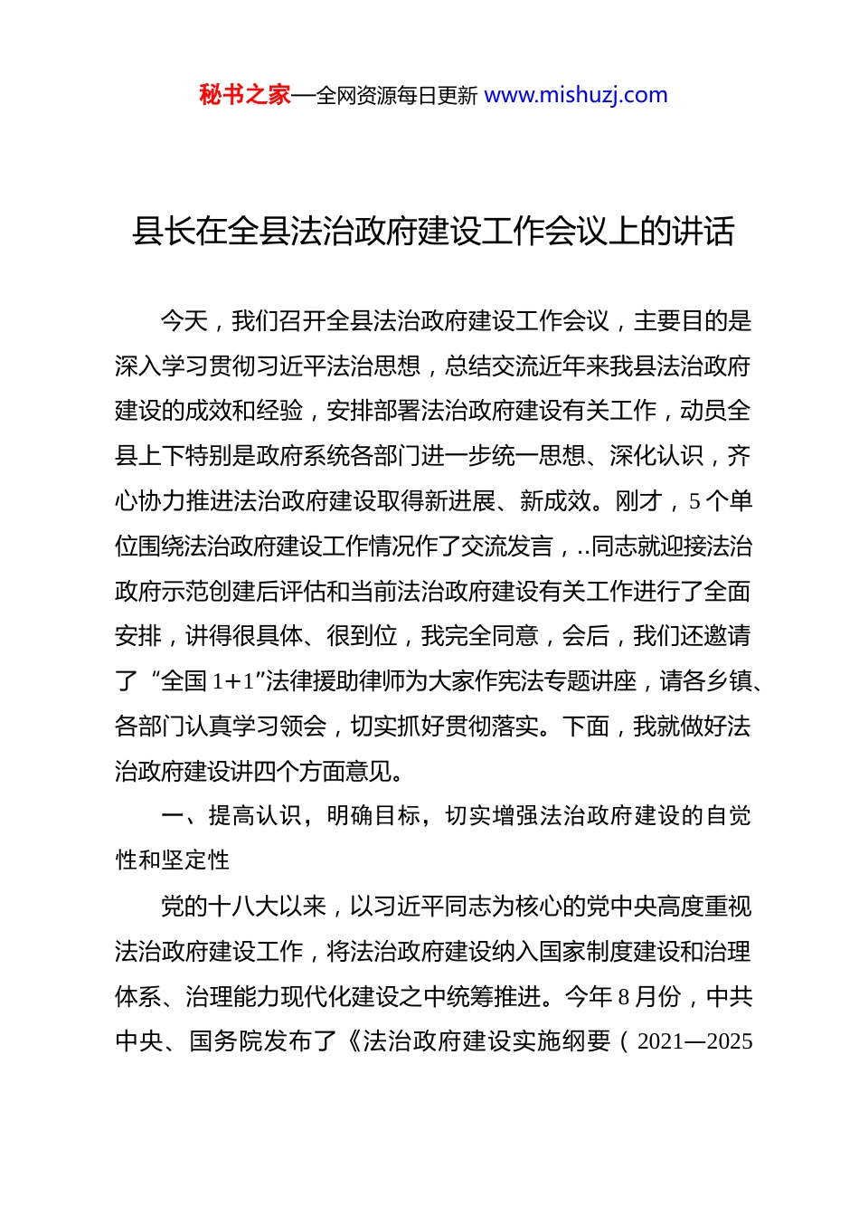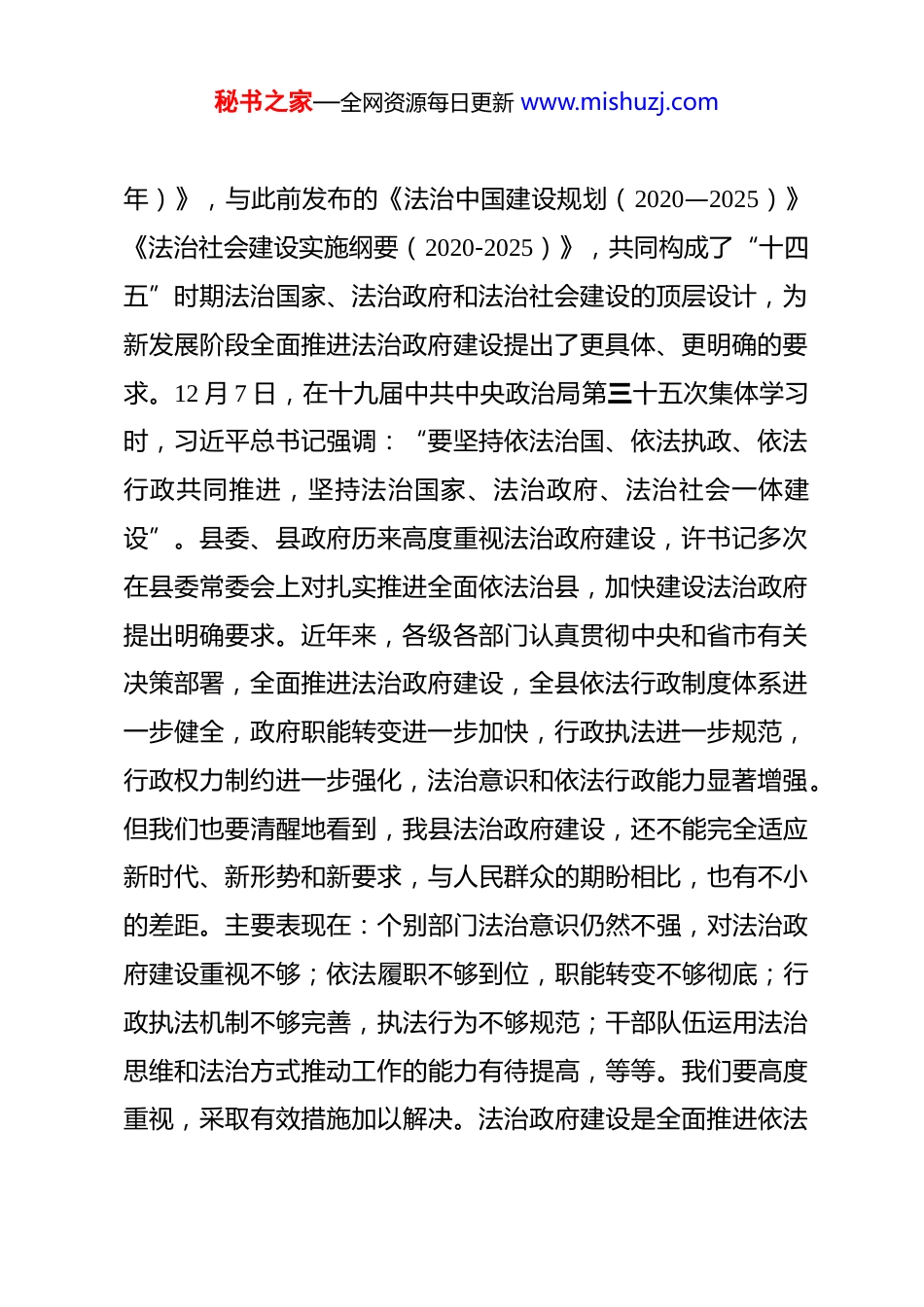 秘书之家—全网资源每日更新 www.mishuzj.com县长在全县法治政府建设工作会议上的讲话今天,我们召开全县法治政府建设工作会议,主要目的是深入学习贯彻习近平法治思想,总结交流近年来我县法治政府建设的成效和经验,安排部署法治政府建设有关工作,动员全县上下特别是政府系统各部门进一步统一思想、深化认识,齐心协力推进法治政府建设取得新进展、新成效。刚才,5 个单位围绕法治政府建设工作情况作了交流发言,..同志就迎接法治政府示范创建后评估和当前法治政府建设有关工作进行了全面安排,讲得很具体、很到位,我完全同意,会后,我们还邀请了“全国 1+1”法律援助律师为大家作宪法专题讲座,请各乡镇、各部门认真学习领会,切实抓好贯彻落实。下面,我就做好法治政府建设讲四个方面意见。一、提高认识,明确目标,切实增强法治政府建设的自觉性和坚定性党的十八大以来,以习近平同志为核心的党中央高度重视法治政府建设工作,将法治政府建设纳入国家制度建设和治理体系、治理能力现代化建设之中统筹推进。今年 8 月份,中共中央、国务院发布了《法治政府建设实施纲要(2021—2025秘书之家—全网资源每日更新 www.mishuzj.com年)》,与此前发布的《法治中国建设规划(2020—2025)》《法治社会建设实施纲要(2020-2025)》,共同构成了“十四五”时期法治国家、法治政府和法治社会建设的顶层设计,为新发展阶段全面推进法治政府建设提出了更具体、更明确的要求。12 月 7 日,在十九届中共中央政治局第三十五次集体学习时,习近平总书记强调:“要坚持依法治国、依法执政、依法行政共同推进,坚持法治国家、法治政府、法治社会一体建设”。县委、县政府历来高度重视法治政府建设,许书记多次在县委常委会上对扎实推进全面依法治县,加快建设法治政府提出明确要求。近年来,各级各部门认真贯彻中央和省市有关决策部署,全面推进法治政府建设,全县依法行政制度体系进一步健全,政府职能转变进一步加快,行政执法进一步规范,行政权力制约进一步强化,法治意识和依法行政能力显著增强。但我们也要清醒地看到,我县法治政府建设,还不能完全适应新时代、新形势和新要求,与人民群众的期盼相比,也有不小的差距。主要表现在:个别部门法治意识仍然不强,对法治政府建设重视不够;依法履职不够到位,职能转变不够彻底;行政执法机制不够完善,执法行为不够规范;干部队伍运用法治思维和法治方式推动工作的能力有待提高,等等。我们要高度重视,采取有效措施加以解决。法治政府建设是全面推进依法秘书之家—全网资源每日更新 www.mishuzj.com治县的重要内容,对优化营商环境,擦亮城市名片、推进县委、县政府各项决策部署落实具有重要意义,各乡镇、各部门一定要提高政治站位,把建设法治政府摆在突出位置,作为做好各项工作的重要基础和保障,切实增强推进法治政府建设的使命感和责任感,全力抓好法治政府建设各项目标任务,不断提高政府治理能力现代化、法治化水平,在全社会营造良好的法治氛围。二、突出重点、强化举措,全面提升法治政府建设水平当前,我县正处于转型发展、追赶跨越的关键时期,各种矛盾问题比较突出,加快依法行政,强化法治政府建设显得尤为关键。各乡镇、各部门要坚持把法治政府建设放到经济社会发展大局中去考量,运用法治思维和法治方式推动工作,真正把法治政府建设各项工作贯穿于全县改革发展的各方面、全过程。一要不断提升行政决策规范水平。法治政府建设的核心就是政府要依法行政、科学民主决策。各乡镇、各部门要严格按照《重大行政决策程序暂行条例》《重大行政决策程序规定》等有关规定,坚持公众参与、专家论证、风险评估、合法性审查、集体讨论决定的重大行政决策程序,大力推行重大行政决策事项年度目录公开制度,确保各项决策符合法律规定和人民秘书之家—全网资源每日更新 www.mishuzj.com意愿。今后凡提交县政府常务会讨论的重大行政决策,必须由司法局组织政府法律顾问进行合法性审查,未经合法性审查的事项一律不许上会研究。要建立健全重大行政决策责任追究制,领导干部既要规范决策,又要勇于担当,坚决遏制怕担责任就不...
