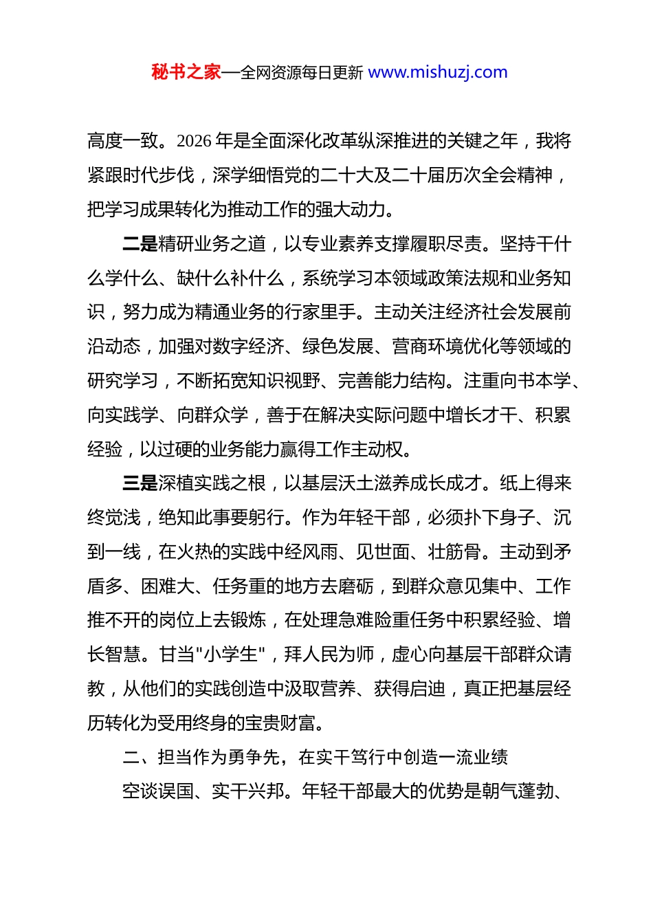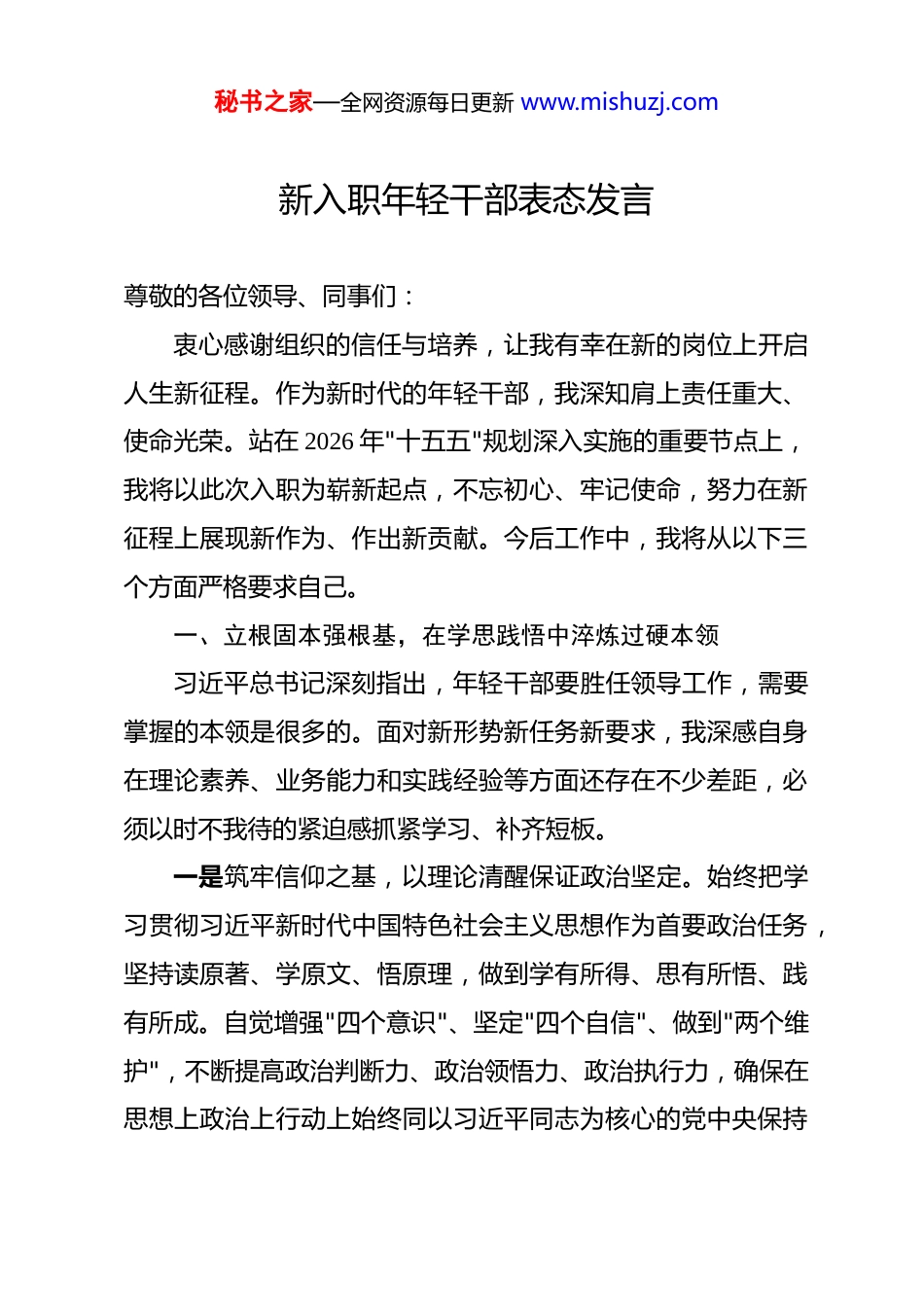 秘书之家—全网资源每日更新 www.mishuzj.com新入职年轻干部表态发言 尊敬的各位领导、同事们:衷心感谢组织的信任与培养,让我有幸在新的岗位上开启人生新征程。作为新时代的年轻干部,我深知肩上责任重大、使命光荣。站在 2026 年"十五五"规划深入实施的重要节点上,我将以此次入职为崭新起点,不忘初心、牢记使命,努力在新征程上展现新作为、作出新贡献。今后工作中,我将从以下三个方面严格要求自己。一、立根固本强根基,在学思践悟中淬炼过硬本领习近平总书记深刻指出,年轻干部要胜任领导工作,需要掌握的本领是很多的。面对新形势新任务新要求,我深感自身在理论素养、业务能力和实践经验等方面还存在不少差距,必须以时不我待的紧迫感抓紧学习、补齐短板。一是筑牢信仰之基,以理论清醒保证政治坚定。始终把学习贯彻习近平新时代中国特色社会主义思想作为首要政治任务,坚持读原著、学原文、悟原理,做到学有所得、思有所悟、践有所成。自觉增强"四个意识"、坚定"四个自信"、做到"两个维护",不断提高政治判断力、政治领悟力、政治执行力,确保在思想上政治上行动上始终同以习近平同志为核心的党中央保持秘书之家—全网资源每日更新 www.mishuzj.com高度一致。2026 年是全面深化改革纵深推进的关键之年,我将紧跟时代步伐,深学细悟党的二十大及二十届历次全会精神,把学习成果转化为推动工作的强大动力。二是精研业务之道,以专业素养支撑履职尽责。坚持干什么学什么、缺什么补什么,系统学习本领域政策法规和业务知识,努力成为精通业务的行家里手。主动关注经济社会发展前沿动态,加强对数字经济、绿色发展、营商环境优化等领域的研究学习,不断拓宽知识视野、完善能力结构。注重向书本学、向实践学、向群众学,善于在解决实际问题中增长才干、积累经验,以过硬的业务能力赢得工作主动权。三是深植实践之根,以基层沃土滋养成长成才。纸上得来终觉浅,绝知此事要躬行。作为年轻干部,必须扑下身子、沉到一线,在火热的实践中经风雨、见世面、壮筋骨。主动到矛盾多、困难大、任务重的地方去磨砺,到群众意见集中、工作推不开的岗位上去锻炼,在处理急难险重任务中积累经验、增长智慧。甘当"小学生",拜人民为师,虚心向基层干部群众请教,从他们的实践创造中汲取营养、获得启迪,真正把基层经历转化为受用终身的宝贵财富。二、担当作为勇争先,在实干笃行中创造一流业绩空谈误国、实干兴邦。年轻干部最大的优势是朝气蓬勃、秘书之家—全网资源每日更新 www.mishuzj.com敢想敢干,最忌讳的是眼高手低、坐而论道。我将始终保持奋发有为的精神状态,以"时时放心不下"的责任感和"事事落实到位"的执行力,扎扎实实做好每一项工作。一是善谋全局、精于统筹,提升工作的前瞻性系统性。树立"一盘棋"思想,自觉把本职工作放到大局中去思考、去谋划、去推进。坚持目标导向与问题导向相结合,工作开展前注重摸清底数、找准症结、明确路径,做到心中有数、手中有策。学会"弹钢琴",善于抓住主要矛盾和矛盾的主要方面,分清轻重缓急,合理调配资源和精力,做到忙而不乱、忙而有序,以科学统筹提升工作质效。二是敢于突破、善于创新,激发工作的创造力驱动力 。2026 年,新一轮科技革命和产业变革加速演进,数字化转型深入推进,政务服务改革持续深化,对我们的工作理念、方式和能力都提出了新的更高要求。我将主动破除思维定势和路径依赖,善于运用改革的思维、创新的办法破解工作难题。积极拥抱数字化、智能化手段,探索"互联网+政务服务""大数据+精准治理"等新模式新路径,以创新驱动工作提质增效。同时注重总结提炼好经验好做法,推动形成可复制、可推广的制度成果。三是真抓实干、务求实效,锤炼工作的执行力落实力。坚持"说了就干、干就干好"的工作标准,对组织交办的任务不讲秘书之家—全网资源每日更新 www.mishuzj.com条件、不打折扣、不搞变通。建立健全"清单化管理、项目化推进、节点化考核"工作机制,做到每项工作有部署、有检查、有反馈、有落实。发扬钉钉子精神,对认准的事情紧盯不放、一抓到底,不达目的不罢休。坚决摒弃形式主义、官僚主义,少说空话、多...