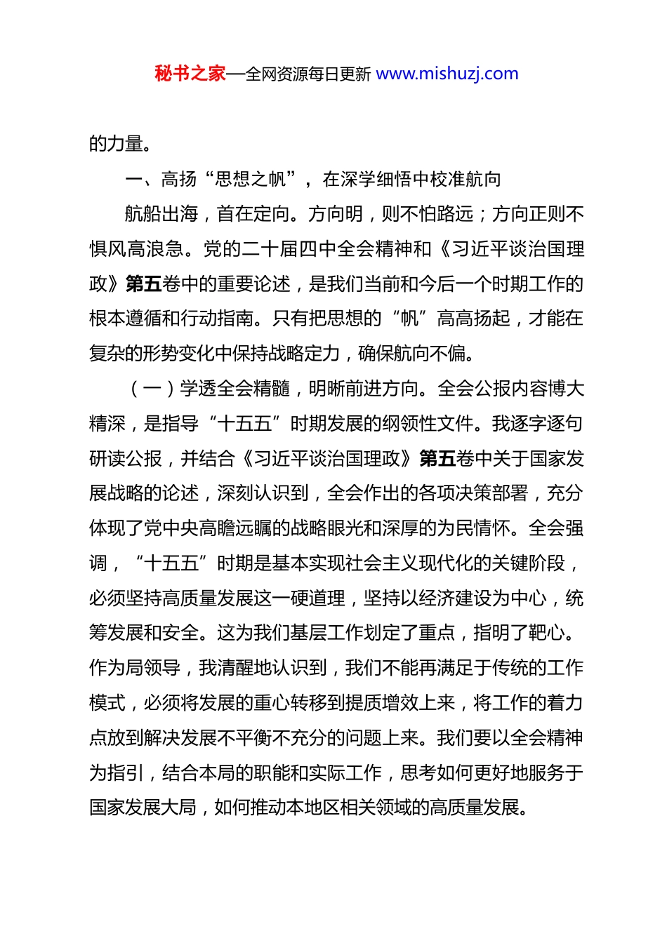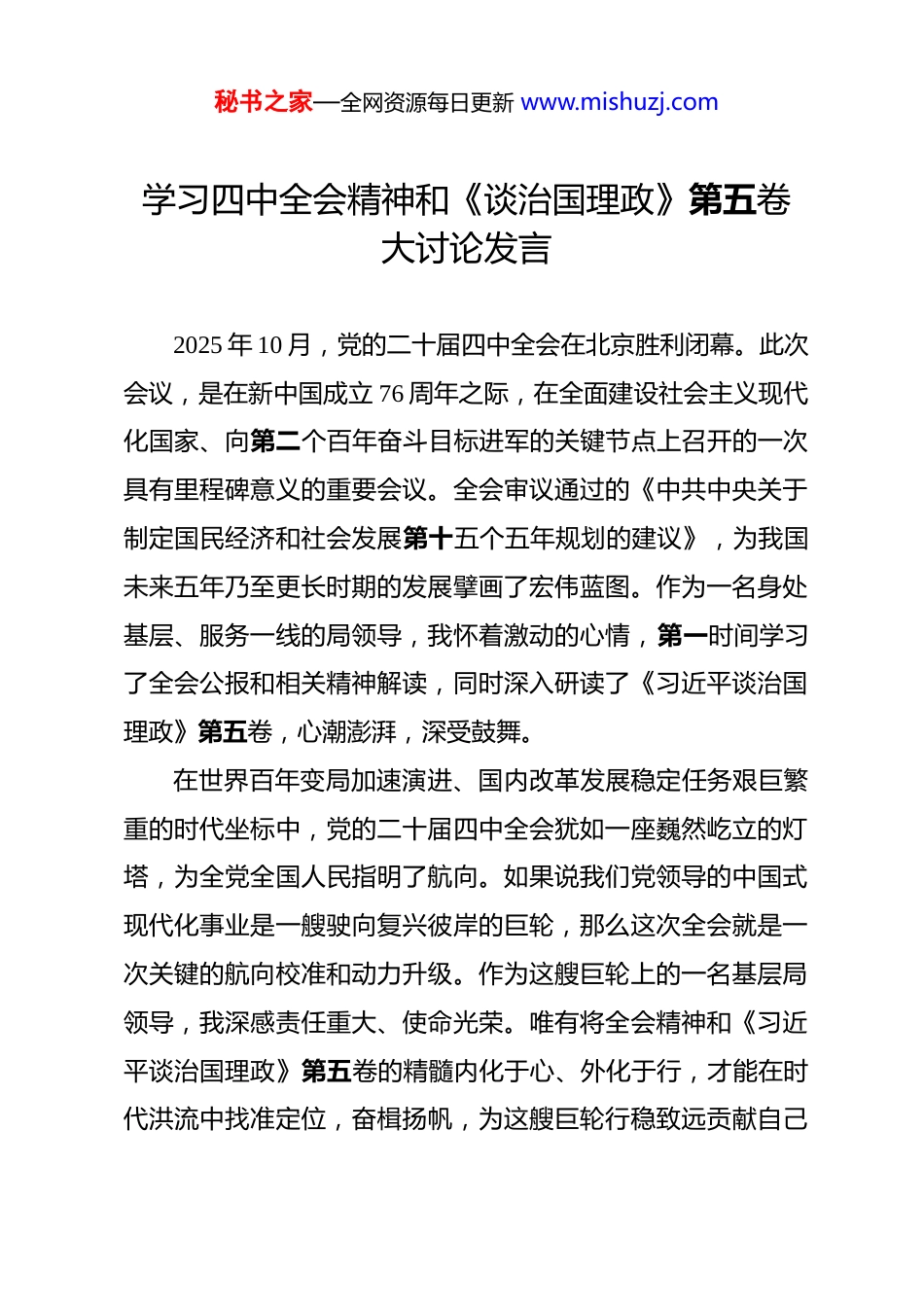 秘书之家—全网资源每日更新 www.mishuzj.com学习四中全会精神和《谈治国理政》第五卷大讨论发言 2025 年 10 月,党的二十届四中全会在北京胜利闭幕。此次会议,是在新中国成立 76 周年之际,在全面建设社会主义现代化国家、向第二个百年奋斗目标进军的关键节点上召开的一次具有里程碑意义的重要会议。全会审议通过的《中共中央关于制定国民经济和社会发展第十五个五年规划的建议》,为我国未来五年乃至更长时期的发展擘画了宏伟蓝图。作为一名身处基层、服务一线的局领导,我怀着激动的心情,第一时间学习了全会公报和相关精神解读,同时深入研读了《习近平谈治国理政》第五卷,心潮澎湃,深受鼓舞。在世界百年变局加速演进、国内改革发展稳定任务艰巨繁重的时代坐标中,党的二十届四中全会犹如一座巍然屹立的灯塔,为全党全国人民指明了航向。如果说我们党领导的中国式现代化事业是一艘驶向复兴彼岸的巨轮,那么这次全会就是一次关键的航向校准和动力升级。作为这艘巨轮上的一名基层局领导,我深感责任重大、使命光荣。唯有将全会精神和《习近平谈治国理政》第五卷的精髓内化于心、外化于行,才能在时代洪流中找准定位,奋楫扬帆,为这艘巨轮行稳致远贡献自己秘书之家—全网资源每日更新 www.mishuzj.com的力量。一、高扬“思想之帆”,在深学细悟中校准航向航船出海,首在定向。方向明,则不怕路远;方向正则不惧风高浪急。党的二十届四中全会精神和《习近平谈治国理政》第五卷中的重要论述,是我们当前和今后一个时期工作的根本遵循和行动指南。只有把思想的“帆”高高扬起,才能在复杂的形势变化中保持战略定力,确保航向不偏。(一)学透全会精髓,明晰前进方向。全会公报内容博大精深,是指导“十五五”时期发展的纲领性文件。我逐字逐句研读公报,并结合《习近平谈治国理政》第五卷中关于国家发展战略的论述,深刻认识到,全会作出的各项决策部署,充分体现了党中央高瞻远瞩的战略眼光和深厚的为民情怀。全会强调,“十五五”时期是基本实现社会主义现代化的关键阶段,必须坚持高质量发展这一硬道理,坚持以经济建设为中心,统筹发展和安全。这为我们基层工作划定了重点,指明了靶心。作为局领导,我清醒地认识到,我们不能再满足于传统的工作模式,必须将发展的重心转移到提质增效上来,将工作的着力点放到解决发展不平衡不充分的问题上来。我们要以全会精神为指引,结合本局的职能和实际工作,思考如何更好地服务于国家发展大局,如何推动本地区相关领域的高质量发展。秘书之家—全网资源每日更新 www.mishuzj.com(二)悟透核心要义,坚定理想信念。学习不能停留在表面,更要悟透其核心要义。全会提出的“六大原则”——坚持党的全面领导、坚持人民至上、坚持高质量发展、坚持全面深化改革、坚持有效市场与有为政府相结合、坚持统筹发展和安全,与《习近平谈治国理政》第五卷中关于国家治理的重要理念一脉相承,是我们想问题、作决策、办事情的“罗盘”。在实际工作中,这就要求我们在任何项目推进前,首先要考量是否符合高质量发展要求;任何政策制定时,首先要评估是否能让人民群众真正受益;在处理市场与政府关系时,既要放活市场,优化营商环境,又要主动作为,弥补市场失灵。这个“罗盘”帮助我们时刻校准自己的位置,确保我们的工作始终沿着正确的政治方向前进。(三)吃透政策部署,规划发展航程。全会部署了涵盖现代化产业体系、科技自立自强、全面深化改革等 12 项重大任务。这不仅是国家的宏观布局,更是我们地方发展的具体“海图”。我反复研究这些任务,并结合《习近平谈治国理政》第五卷中关于经济社会发展的具体思路,同时紧密结合本局工作实际进行思考。比如,在推动科技创新方面,我们如何利用政策引导和支持本地企业加大研发投入,如何为企业与高等院校、科研院所牵线搭桥,推动新质生产力的形成和发展;在建设现代化秘书之家—全网资源每日更新 www.mishuzj.com产业体系方面,我们如何引导传统产业转型升级,培育新兴产业,打造具有竞争力的产业集群。将这些宏观政策部署转化为本地可操作、可落地的具体项目和行动方案,是我们当前最为紧...
