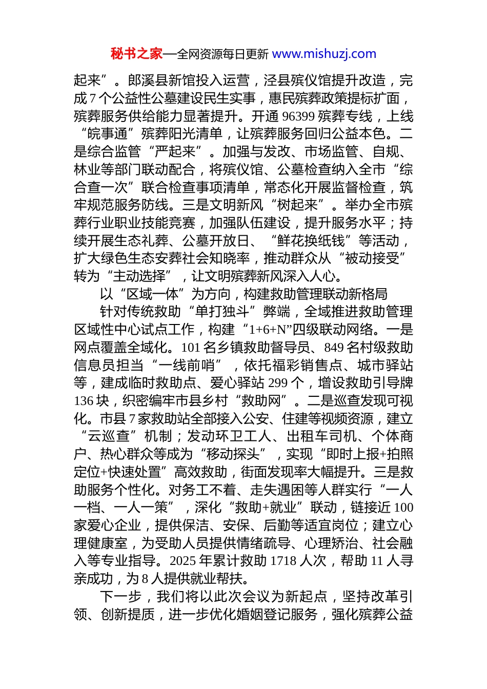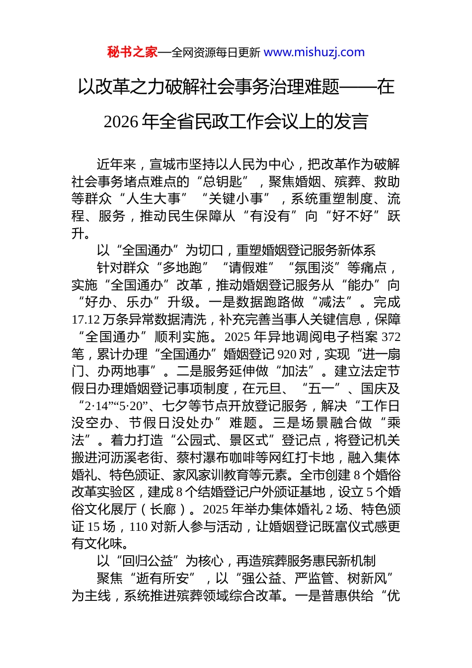 秘书之家—全网资源每日更新 www.mishuzj.com以改革之力破解社会事务治理难题——在2026 年全省民政工作会议上的发言近年来,宣城市坚持以人民为中心,把改革作为破解社会事务堵点难点的“总钥匙”,聚焦婚姻、殡葬、救助等群众“人生大事”“关键小事”,系统重塑制度、流程、服务,推动民生保障从“有没有”向“好不好”跃升。以“全国通办”为切口,重塑婚姻登记服务新体系针对群众“多地跑”“请假难”“氛围淡”等痛点,实施“全国通办”改革,推动婚姻登记服务从“能办”向“好办、乐办”升级。一是数据跑路做“减法”。完成17.12 万条异常数据清洗,补充完善当事人关键信息,保障“全国通办”顺利实施。2025 年异地调阅电子档案 372笔,累计办理“全国通办”婚姻登记 920 对,实现“进一扇门、办两地事”。二是服务延伸做“加法”。建立法定节假日办理婚姻登记事项制度,在元旦、“五一”、国庆及“2·14”“5·20”、七夕等节点开放登记服务,解决“工作日没空办、节假日没处办”难题。三是场景融合做“乘法”。着力打造“公园式、景区式”登记点,将登记机关搬进河沥溪老街、蔡村瀑布咖啡等网红打卡地,融入集体婚礼、特色颁证、家风家训教育等元素。全市创建 8 个婚俗改革实验区,建成 8 个结婚登记户外颁证基地,设立 5 个婚俗文化展厅(长廊)。2025 年举办集体婚礼 2 场、特色颁证 15 场,110 对新人参与活动,让婚姻登记既富仪式感更有文化味。以“回归公益”为核心,再造殡葬服务惠民新机制聚焦“逝有所安”,以“强公益、严监管、树新风”为主线,系统推进殡葬领域综合改革。一是普惠供给“优秘书之家—全网资源每日更新 www.mishuzj.com起来”。郎溪县新馆投入运营,泾县殡仪馆提升改造,完成 7 个公益性公墓建设民生实事,惠民殡葬政策提标扩面,殡葬服务供给能力显著提升。开通 96399 殡葬专线,上线“皖事通”殡葬阳光清单,让殡葬服务回归公益本色。二是综合监管“严起来”。加强与发改、市场监管、自规、林业等部门联动配合,将殡仪馆、公墓检查纳入全市“综合查一次”联合检查事项清单,常态化开展监督检查,筑牢规范服务防线。三是文明新风“树起来”。举办全市殡葬行业职业技能竞赛,加强队伍建设,提升服务水平;持续开展生态礼葬、公墓开放日、“鲜花换纸钱”等活动,扩大绿色生态安葬社会知晓率,推动群众从“被动接受”转为“主动选择”,让文明殡葬新风深入人心。以“区域一体”为方向,构建救助管理联动新格局针对传统救助“单打独斗”弊端,全域推进救助管理区域性中心试点工作,构建“1+6+N”四级联动网络。一是网点覆盖全域化。101 名乡镇救助督导员、849 名村级救助信息员担当“一线前哨”,依托福彩销售点、城市驿站等,建成临时救助点、爱心驿站 299 个,增设救助引导牌136 块,织密编牢市县乡村“救助网”。二是巡查发现可视化。市县 7 家救助站全部接入公安、住建等视频资源,建立“云巡查”机制;发动环卫工人、出租车司机、个体商户、热心群众等成为“移动探头”,实现“即时上报+拍照定位+快速处置”高效救助,街面发现率大幅提升。三是救助服务个性化。对务工不着、走失遇困等人群实行“一人一档、一人一策”,深化“救助+就业”联动,链接近 100家爱心企业,提供保洁、安保、后勤等适宜岗位;建立心理健康室,为受助人员提供情绪疏导、心理矫治、社会融入等专业指导。2025 年累计救助 1718 人次,帮助 11 人寻亲成功,为 8 人提供就业帮扶。下一步,我们将以此次会议为新起点,坚持改革引领、创新提质,进一步优化婚姻登记服务,强化殡葬公益秘书之家—全网资源每日更新 www.mishuzj.com属性,深化救助管理试点,推动民政社会事务高质量发展。