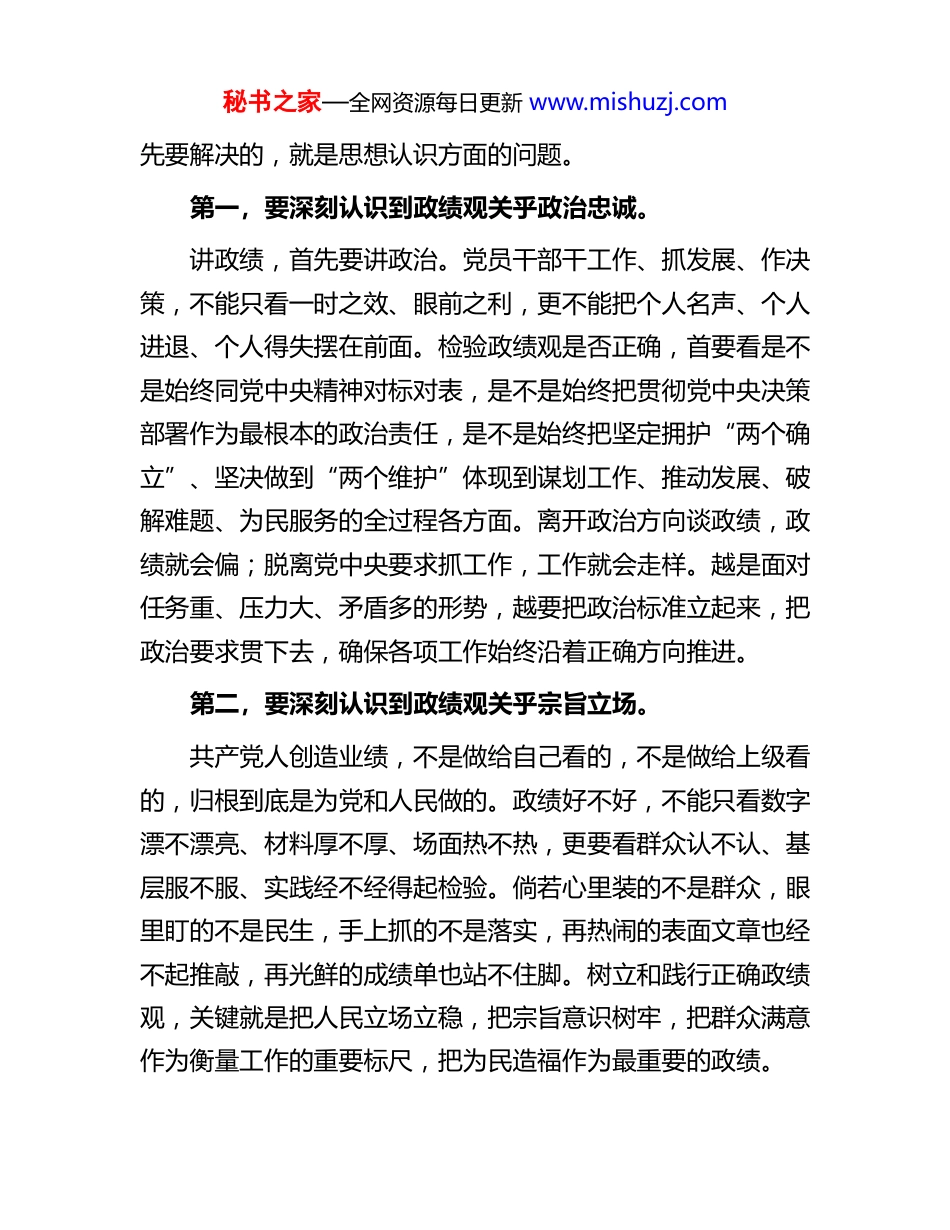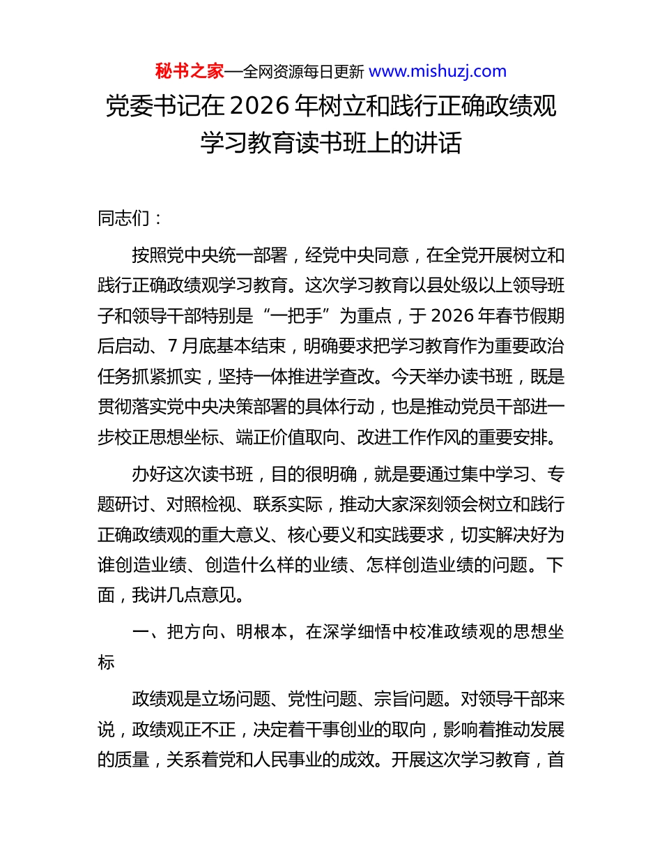 秘书之家—全网资源每日更新 www.mishuzj.com党委书记在 2026 年树立和践行正确政绩观学习教育读书班上的讲话同志们:按照党中央统一部署,经党中央同意,在全党开展树立和践行正确政绩观学习教育。这次学习教育以县处级以上领导班子和领导干部特别是“一把手”为重点,于 2026 年春节假期后启动、7 月底基本结束,明确要求把学习教育作为重要政治任务抓紧抓实,坚持一体推进学查改。今天举办读书班,既是贯彻落实党中央决策部署的具体行动,也是推动党员干部进一步校正思想坐标、端正价值取向、改进工作作风的重要安排。办好这次读书班,目的很明确,就是要通过集中学习、专题研讨、对照检视、联系实际,推动大家深刻领会树立和践行正确政绩观的重大意义、核心要义和实践要求,切实解决好为谁创造业绩、创造什么样的业绩、怎样创造业绩的问题。下面,我讲几点意见。一、把方向、明根本,在深学细悟中校准政绩观的思想坐标政绩观是立场问题、党性问题、宗旨问题。对领导干部来说,政绩观正不正,决定着干事创业的取向,影响着推动发展的质量,关系着党和人民事业的成效。开展这次学习教育,首秘书之家—全网资源每日更新 www.mishuzj.com先要解决的,就是思想认识方面的问题。第一,要深刻认识到政绩观关乎政治忠诚。讲政绩,首先要讲政治。党员干部干工作、抓发展、作决策,不能只看一时之效、眼前之利,更不能把个人名声、个人进退、个人得失摆在前面。检验政绩观是否正确,首要看是不是始终同党中央精神对标对表,是不是始终把贯彻党中央决策部署作为最根本的政治责任,是不是始终把坚定拥护“两个确立”、坚决做到“两个维护”体现到谋划工作、推动发展、破解难题、为民服务的全过程各方面。离开政治方向谈政绩,政绩就会偏;脱离党中央要求抓工作,工作就会走样。越是面对任务重、压力大、矛盾多的形势,越要把政治标准立起来,把政治要求贯下去,确保各项工作始终沿着正确方向推进。第二,要深刻认识到政绩观关乎宗旨立场。共产党人创造业绩,不是做给自己看的,不是做给上级看的,归根到底是为党和人民做的。政绩好不好,不能只看数字漂不漂亮、材料厚不厚、场面热不热,更要看群众认不认、基层服不服、实践经不经得起检验。倘若心里装的不是群众,眼里盯的不是民生,手上抓的不是落实,再热闹的表面文章也经不起推敲,再光鲜的成绩单也站不住脚。树立和践行正确政绩观,关键就是把人民立场立稳,把宗旨意识树牢,把群众满意作为衡量工作的重要标尺,把为民造福作为最重要的政绩。秘书之家—全网资源每日更新 www.mishuzj.com第三,要深刻认识到政绩观关乎事业发展。政绩观端正,发展就能行稳致远;政绩观偏了,工作就容易急功近利。实践反复证明,有的工作之所以反复折腾,有的项目之所以留下后遗症,有的决策之所以难以持续,根源在于政绩观出了偏差。只图眼前、不顾长远,只重显绩、不重潜绩,只重速度、不重质量,只看结果、不讲规律,看似是工作方法问题,实则是价值取向问题。抓发展不能违背规律,抓工作不能脱离实际,抓落实不能不计成本。只有把正确政绩观树牢,才能把握好当前和长远、局部和全局、发展和安全、显绩和潜绩的关系,推动事业走得更稳、更远。二、照镜子、找偏差,在对标对表中把问题根源挖深找准学习教育不能停留在一般表态上,不能满足于泛泛而谈,必须坚持把自己摆进去、把职责摆进去、把工作摆进去,真正做到见人见事见思想。查摆问题查得准不准、深不深,直接关系学习教育的质量,关系整改整治的成色。第一,要从思想深处查一查,看看宗旨意识牢不牢。有的同志谋划工作,习惯先想上级怎么看,再想群众怎么感受;推动任务,习惯先看有没有亮点、能不能出经验,而不是先看群众需要不需要、基层承受承受得住;研究事情,关注的是形式上是否“有动作”,而不是效果上是否“真落地”。这些现象看似是工作导向问题,实则反映的是宗旨意识不够秘书之家—全网资源每日更新 www.mishuzj.com牢、群众观点不够强。查摆问题,就要从这些思想症结查起,看看是不是还存在对群众感情不深、对基层情况掌握不透、对群众急难愁盼解决不力的问题,真正把“...