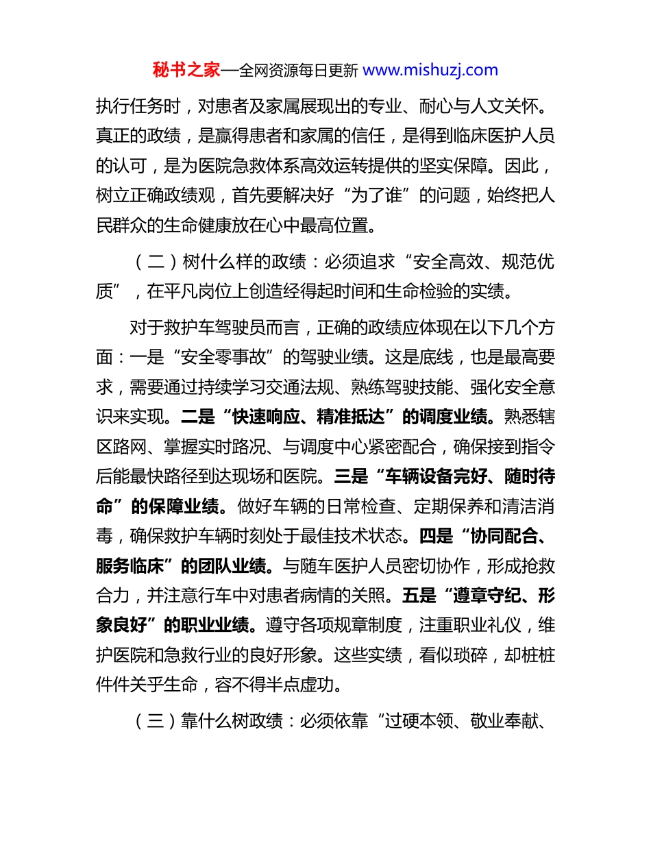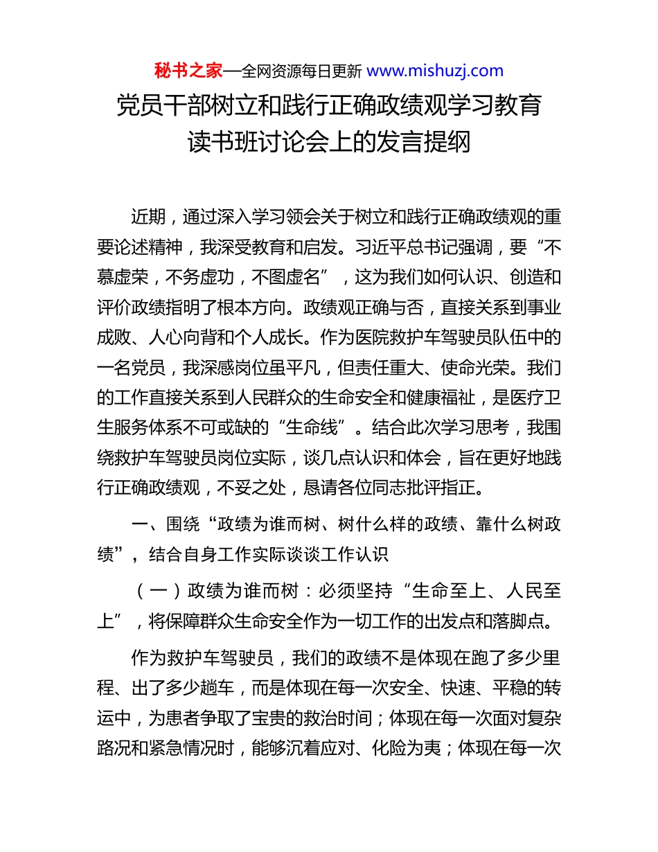 秘书之家—全网资源每日更新 www.mishuzj.com党员干部树立和践行正确政绩观学习教育读书班讨论会上的发言提纲近期,通过深入学习领会关于树立和践行正确政绩观的重要论述精神,我深受教育和启发。习近平总书记强调,要“不慕虚荣,不务虚功,不图虚名”,这为我们如何认识、创造和评价政绩指明了根本方向。政绩观正确与否,直接关系到事业成败、人心向背和个人成长。作为医院救护车驾驶员队伍中的一名党员,我深感岗位虽平凡,但责任重大、使命光荣。我们的工作直接关系到人民群众的生命安全和健康福祉,是医疗卫生服务体系不可或缺的“生命线”。结合此次学习思考,我围绕救护车驾驶员岗位实际,谈几点认识和体会,旨在更好地践行正确政绩观,不妥之处,恳请各位同志批评指正。一、围绕“政绩为谁而树、树什么样的政绩、靠什么树政绩”,结合自身工作实际谈谈工作认识(一)政绩为谁而树:必须坚持“生命至上、人民至上”,将保障群众生命安全作为一切工作的出发点和落脚点。作为救护车驾驶员,我们的政绩不是体现在跑了多少里程、出了多少趟车,而是体现在每一次安全、快速、平稳的转运中,为患者争取了宝贵的救治时间;体现在每一次面对复杂路况和紧急情况时,能够沉着应对、化险为夷;体现在每一次秘书之家—全网资源每日更新 www.mishuzj.com执行任务时,对患者及家属展现出的专业、耐心与人文关怀。真正的政绩,是赢得患者和家属的信任,是得到临床医护人员的认可,是为医院急救体系高效运转提供的坚实保障。因此,树立正确政绩观,首先要解决好“为了谁”的问题,始终把人民群众的生命健康放在心中最高位置。(二)树什么样的政绩:必须追求“安全高效、规范优质”,在平凡岗位上创造经得起时间和生命检验的实绩。对于救护车驾驶员而言,正确的政绩应体现在以下几个方面:一是“安全零事故”的驾驶业绩。这是底线,也是最高要求,需要通过持续学习交通法规、熟练驾驶技能、强化安全意识来实现。二是“快速响应、精准抵达”的调度业绩。熟悉辖区路网、掌握实时路况、与调度中心紧密配合,确保接到指令后能最快路径到达现场和医院。三是“车辆设备完好、随时待命”的保障业绩。做好车辆的日常检查、定期保养和清洁消毒,确保救护车辆时刻处于最佳技术状态。四是“协同配合、服务临床”的团队业绩。与随车医护人员密切协作,形成抢救合力,并注意行车中对患者病情的关照。五是“遵章守纪、形象良好”的职业业绩。遵守各项规章制度,注重职业礼仪,维护医院和急救行业的良好形象。这些实绩,看似琐碎,却桩桩件件关乎生命,容不得半点虚功。(三)靠什么树政绩:必须依靠“过硬本领、敬业奉献、秘书之家—全网资源每日更新 www.mishuzj.com团结协作”,夯实履职尽责的根基。一是靠精湛过硬的专业本领。不仅要掌握高超的驾驶技术,特别是特种车辆驾驶、应急处突技能,还要学习基本的急救常识、医疗设备使用和疫情防控知识,成为“驾驶员”兼“急救辅助员”。二是靠极端负责的敬业精神。时刻保持“车轮上的战斗”状态,24 小时待命,风雨无阻,分秒必争,甘于在平凡岗位上默默坚守、无私奉献。三是靠遵规守纪的过硬作风。严格遵守道路交通安全法规、医院规章制度和急救操作规程,做到令行禁止,确保行车安全和任务规范。四是靠团结协作的大局意识。牢固树立“一盘棋”思想,与调度、医护、维修等环节无缝衔接,共同保障急救链条畅通高效。五是靠不断学习进取的态度。主动学习新知识、新技术,适应智慧急救、信息化调度等发展要求,提升综合服务能力。二、存在的问题对照正确政绩观的要求和岗位职责,反思自身,还存在一些不足:(一)理论联系实际不够紧密。对正确政绩观的内涵理解有时还停留在概念层面,如何将其更深刻、更具体地融入到每一次出车、每一次服务中的思考和实践还不够深入,存在“知”与“行”结合不够紧密的情况。(二)本领恐慌意识有待加强。面对日益复杂的城市交通秘书之家—全网资源每日更新 www.mishuzj.com环境、新型救护车辆设备以及多样化的急救任务,有时满足于现有经验和技能,在主动钻研更高要求的驾驶技术、学习前沿急救知识方面积极性、系统性还...