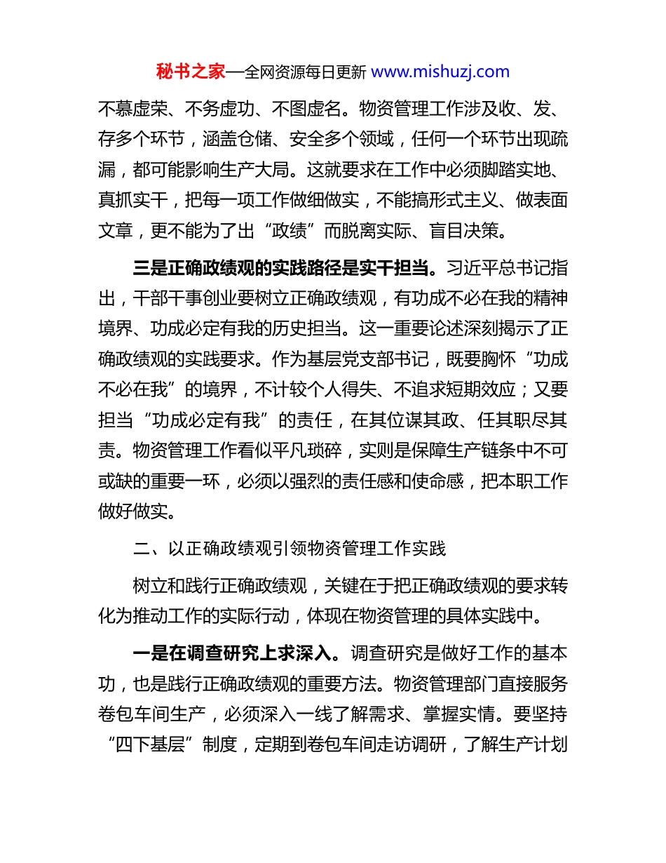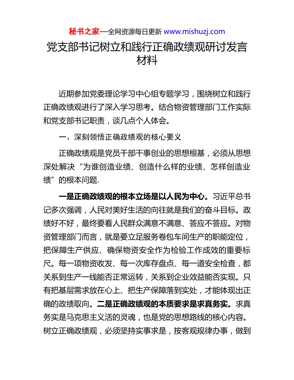 秘书之家—全网资源每日更新 www.mishuzj.com党支部书记树立和践行正确政绩观研讨发言材料近期参加党委理论学习中心组专题学习,围绕树立和践行正确政绩观进行了深入学习思考。结合物资管理部门工作实际和党支部书记职责,谈几点个人体会。一、深刻领悟正确政绩观的核心要义正确政绩观是党员干部干事创业的思想根基,必须从思想深处解决“为谁创造业绩、创造什么样的业绩、怎样创造业绩”的根本问题.一是正确政绩观的根本立场是以人民为中心。习近平总书记多次强调,人民对美好生活的向往就是我们的奋斗目标。政绩好不好,最终要看人民群众满意不满意、答应不答应。对物资管理部门而言,就是要立足服务卷包车间生产的职能定位,把保障生产供应、确保物资安全作为检验工作成效的重要标尺。每一项物资收发、每一次库存盘点、每一道安全检查,都关系到生产一线能否正常运转,关系到企业效益能否实现。只有把基层需求放在心上、把生产保障落到实处,才能体现出正确的政绩取向。二是正确政绩观的本质要求是求真务实。求真务实是马克思主义活的灵魂,也是党的思想路线的核心内容。树立正确政绩观,必须坚持实事求是,按客观规律办事,做到秘书之家—全网资源每日更新 www.mishuzj.com不慕虚荣、不务虚功、不图虚名。物资管理工作涉及收、发、存多个环节,涵盖仓储、安全多个领域,任何一个环节出现疏漏,都可能影响生产大局。这就要求在工作中必须脚踏实地、真抓实干,把每一项工作做细做实,不能搞形式主义、做表面文章,更不能为了出“政绩”而脱离实际、盲目决策。三是正确政绩观的实践路径是实干担当。习近平总书记指出,干部干事创业要树立正确政绩观,有功成不必在我的精神境界、功成必定有我的历史担当。这一重要论述深刻揭示了正确政绩观的实践要求。作为基层党支部书记,既要胸怀“功成不必在我”的境界,不计较个人得失、不追求短期效应;又要担当“功成必定有我”的责任,在其位谋其政、任其职尽其责。物资管理工作看似平凡琐碎,实则是保障生产链条中不可或缺的重要一环,必须以强烈的责任感和使命感,把本职工作做好做实。二、以正确政绩观引领物资管理工作实践树立和践行正确政绩观,关键在于把正确政绩观的要求转化为推动工作的实际行动,体现在物资管理的具体实践中。一是在调查研究上求深入。调查研究是做好工作的基本功,也是践行正确政绩观的重要方法。物资管理部门直接服务卷包车间生产,必须深入一线了解需求、掌握实情。要坚持“四下基层”制度,定期到卷包车间走访调研,了解生产计划秘书之家—全网资源每日更新 www.mishuzj.com安排、物资消耗规律、紧急需求情况,把基层的声音听进去、把一线的诉求带回来。2025 年下半年以来,物资管理部门通过建立定期走访机制,收集生产一线意见建议多条,针对辅料配送时效、库存预警机制等问题进行了优化调整。这些工作看似平常,却是正确政绩观在日常工作中的具体体现。只有把身子沉下去、把情况摸清楚,才能制定出符合实际的工作措施,避免“拍脑袋”决策、“想当然”办事。二是在安全管理上求实效。安全是物资管理的底线和红线,也是检验政绩观是否正确的重要标准。树立正确政绩观,必须把安全管理摆在突出位置,做到真抓真管、实抓实管。要严格落实安全生产责任制,完善安全管理制度,加强安全教育培训,强化安全隐患排查治理。2026 年是《安全生产治本攻坚三年行动方案》的收官之年,行业对安全生产标准化建设提出了更高要求。物资管理部门要以正确政绩观为引领,扎实推进安全管理工作,不为“出成绩”而搞花架子,不为“交差事”而走过场,把每一项安全措施落到实处、见到实效。特别是在仓储安全管理中,要运用物联网、智能监控等技术手段,提升安全管控水平,实现从“被动应对”向“主动预防”转变。三是在服务保障上求精准。物资管理的核心职能是为卷包车间提供生产所需的辅料物资,服务保障的质量直接关系到生产效率和经济效益。践行正确政绩观,就要把服务保障工作做秘书之家—全网资源每日更新 www.mishuzj.com精做细,做到精准对接、精准供应、精准管理。要优化物资收发流程,提高周转效率,降低库存成本...