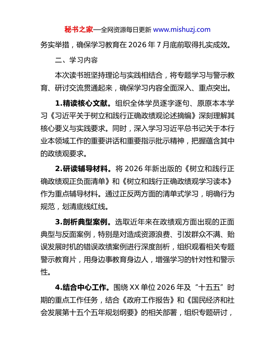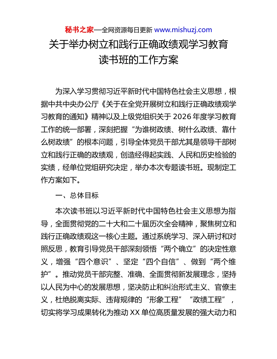 秘书之家—全网资源每日更新 www.mishuzj.com关于举办树立和践行正确政绩观学习教育读书班的工作方案为深入学习贯彻习近平新时代中国特色社会主义思想,根据中共中央办公厅《关于在全党开展树立和践行正确政绩观学习教育的通知》精神以及上级党组织关于 2026 年度学习教育工作的统一部署,深刻把握“为谁树政绩、树什么政绩、靠什么树政绩”的根本问题,引导全体党员干部尤其是领导干部树立和践行正确的政绩观,创造经得起实践、人民和历史检验的实绩,经单位党组研究决定,举办本次专题读书班。现制定工作方案如下。一、总体目标本次读书班以习近平新时代中国特色社会主义思想为指导,全面贯彻党的二十大和二十届历次全会精神,聚焦树立和践行正确政绩观这一核心主题。通过系统学习、深入研讨和对照反思,教育引导党员干部深刻领悟“两个确立”的决定性意义,增强“四个意识”、坚定“四个自信”、做到“两个维护”。推动党员干部完整、准确、全面贯彻新发展理念,坚持以人民为中心的发展思想,坚决防止和纠治形式主义、官僚主义,杜绝脱离实际、违背规律的“形象工程”“政绩工程”,切实将学习成果转化为推动 XX 单位高质量发展的强大动力和秘书之家—全网资源每日更新 www.mishuzj.com务实举措,确保学习教育在 2026 年 7 月底前取得扎实成效。二、学习内容本次读书班坚持理论与实践相结合,将专题学习与警示教育、研讨交流贯通起来,确保学习内容全面深入、重点突出。1.精读核心文献。组织全体学员逐字逐句、原原本本学习《习近平关于树立和践行正确政绩观论述摘编》深刻理解其核心要义与实践要求。同时,深入学习习近平总书记关于本行业本领域工作的重要讲话和重要指示批示精神,把握蕴含其中的政绩观要求。2.研读辅导材料。将 2026 年新出版的《树立和践行正确政绩观正负面清单》和《树立和践行正确政绩观学习读本》作为重点辅导材料。通过正反两方面的清单式学习,明确行为规范,划清底线红线。3.剖析典型案例。选取近年来在政绩观方面出现的正面典型与反面案例,特别是对造成资源浪费、引发群众不满、贻误发展时机的错误政绩案例进行深度剖析,组织观看相关专题警示教育片,用身边事教育身边人,增强学习的针对性和警示性。4.结合中心工作。围绕 XX 单位 2026 年及“十五五”时期的重点工作任务,结合《政府工作报告》和《国民经济和社会发展第十五个五年规划纲要》的相关部署,组织专题研讨,秘书之家—全网资源每日更新 www.mishuzj.com探讨如何在具体工作中贯彻落实正确的政绩观。三、时间地点与参加人员学习时间:2026 年 X 月 15 日至 X 月 17 日,学制三天。学习地点:XX 单位 XX 会议室。参加人员:XX 单位县处级以上领导班子成员和领导干部,特别是各部门、各下属单位的“一把手”;各关键岗位负责人;近三年新提拔或新入职的干部。四、方法与日程安排本次读书班采取集中领学、个人自学、专题辅导、分组研讨、总结交流相结合的方式进行。第一天(X 月 15 日)专题学习与思想动员上午:1.开班式。由 XX 单位党组书记作开班动员讲话,阐明举办本次读书班的重要意义,并就学习纪律和学习要求作出部署。2.精神传达。传达学习中共中央办公厅关于在全党开展树立和践行正确政绩观学习教育的通知精神及上级相关会议要求。3.书记领学。党组书记带头领学《习近平关于树立和践行正确政绩观论述摘编》中的重点篇章。秘书之家—全网资源每日更新 www.mishuzj.com下午:1.班子领学。领导班子其他成员分专题领学《论述摘编》其余内容,并结合分管工作分享初步学习体会。2.个人自学。学员围绕学习内容进行个人自学,重点阅读《树立和践行正确政绩观学习读本》,并开始撰写学习心得。第二天(X 月 16 日)深度辅导与警示教育上午:1.专题辅导。邀请 XX 市委党校专家教授,围绕“新时代如何树立和践行正确的政绩观”作专题辅导报告,系统解读政绩观的理论内涵与时代要求。2.案例教学。结合《树立和践行正确政绩观正负面清单》,组织对两个典型案例(一正一反)进行深入剖析和课堂讨论。下午:1.观看警示教育片。集中观看关于错误政绩观导...