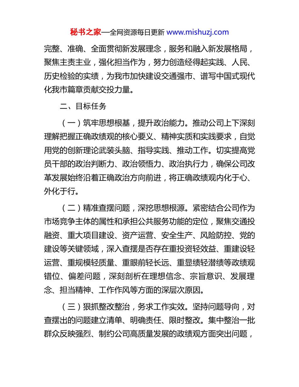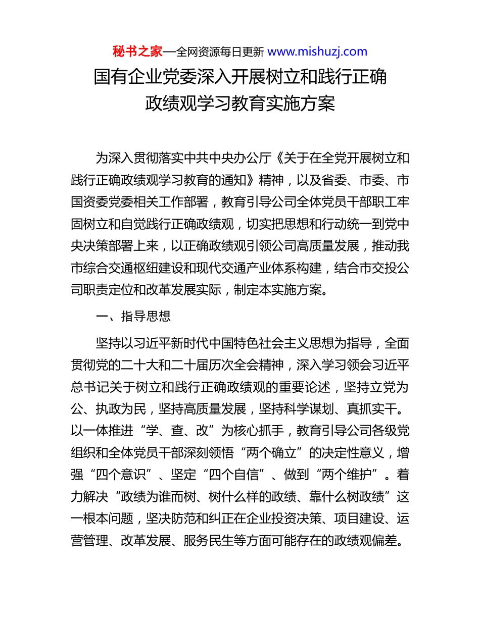 秘书之家—全网资源每日更新 www.mishuzj.com国有企业党委深入开展树立和践行正确政绩观学习教育实施方案为深入贯彻落实中共中央办公厅《关于在全党开展树立和践行正确政绩观学习教育的通知》精神,以及省委、市委、市国资委党委相关工作部署,教育引导公司全体党员干部职工牢固树立和自觉践行正确政绩观,切实把思想和行动统一到党中央决策部署上来,以正确政绩观引领公司高质量发展,推动我市综合交通枢纽建设和现代交通产业体系构建,结合市交投公司职责定位和改革发展实际,制定本实施方案。一、指导思想坚持以习近平新时代中国特色社会主义思想为指导,全面贯彻党的二十大和二十届历次全会精神,深入学习领会习近平总书记关于树立和践行正确政绩观的重要论述,坚持立党为公、执政为民,坚持高质量发展,坚持科学谋划、真抓实干。以一体推进“学、查、改”为核心抓手,教育引导公司各级党组织和全体党员干部深刻领悟“两个确立”的决定性意义,增强“四个意识”、坚定“四个自信”、做到“两个维护”。着力解决“政绩为谁而树、树什么样的政绩、靠什么树政绩”这一根本问题,坚决防范和纠正在企业投资决策、项目建设、运营管理、改革发展、服务民生等方面可能存在的政绩观偏差。秘书之家—全网资源每日更新 www.mishuzj.com完整、准确、全面贯彻新发展理念,服务和融入新发展格局,聚焦主责主业,强化担当作为,努力创造经得起实践、人民、历史检验的实绩,为我市加快建设交通强市、谱写中国式现代化我市篇章贡献交投力量。二、目标任务(一)筑牢思想根基,提升政治能力。推动公司上下深刻理解把握正确政绩观的核心要义、精神实质和实践要求,自觉用党的创新理论武装头脑、指导实践、推动工作。切实提高党员干部的政治判断力、政治领悟力、政治执行力,确保公司改革发展始终沿着正确政治方向前进,将正确政绩观内化于心、外化于行。(二)精准查摆问题,深挖思想根源。紧密结合公司作为市场竞争主体的属性和承担公共服务功能的定位,聚焦交通投融资、重大项目建设、资产运营、安全生产、风险防控、党的建设等关键领域,深入查摆是否存在重投资轻效益、重建设轻运营、重规模轻质量、重眼前轻长远、重显绩轻潜绩等政绩观错位、偏差问题,深刻剖析在理想信念、宗旨意识、发展理念、担当精神、工作作风等方面的深层次原因。(三)狠抓整改整治,务求工作实效。坚持问题导向,对查摆出的问题建立清单、明确责任、限时整改。集中整治一批群众反映强烈、制约公司高质量发展的政绩观方面突出问题,秘书之家—全网资源每日更新 www.mishuzj.com特别是防范“形象工程”、“政绩工程”、数据造假、盲目扩张、风险累积等现象。以整改实效推动解决一批发展难题、办好一批民生实事、完善一批制度机制。(四)健全长效机制,巩固深化成果。将实践中行之有效的经验做法及时以制度形式固定下来,健全完善符合正确政绩观要求、适应现代企业制度特点的决策机制、考核评价体系、监督管理体系和激励约束机制,从源头上防范政绩观偏差,推动树立和践行正确政绩观常态化、长效化。(五)激励担当作为,推动高质量发展。把学习教育的成果转化为攻坚克难、干事创业的强大动力,引导全体干部职工立足岗位作贡献,在推进重大交通基础设施投融资建设、提升运营服务品质、深化企业改革创新、防范化解重大风险、履行社会责任中展现新担当新作为,营造求真务实、奋发有为、清正廉洁的浓厚氛围,以新气象新作为推动公司高质量发展取得新成效。三、基本原则(一)坚持聚焦主题、服务大局。紧紧围绕树立和践行正确政绩观这一主题,紧密联系公司服务全市交通发展战略、实现国有资产保值增值、履行国企经济责任、政治责任、社会责任的使命任务,不搞形式主义,不做表面文章,确保学习教育与中心工作深度融合、相互促进。秘书之家—全网资源每日更新 www.mishuzj.com(二)坚持一体推进、贯通融合。不分批次、不划阶段,将理论学习、调查研究、推动发展、检视整改、建章立制等重点措施有机融合、一体推进,做到边学习、边对照、边检视、边整改,推动学习教育走深走实。(三)坚持以上率下、全员覆盖。以公司党委...
