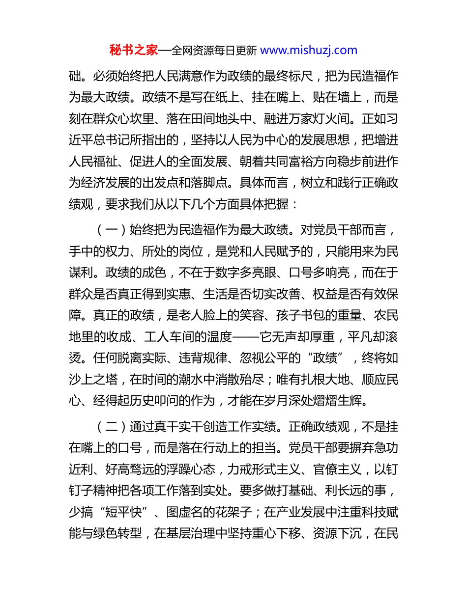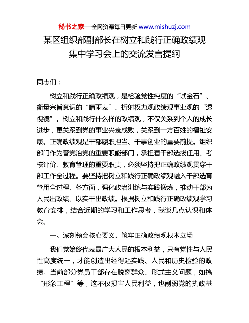 秘书之家—全网资源每日更新 www.mishuzj.com某区组织部副部长在树立和践行正确政绩观集中学习会上的交流发言提纲同志们:树立和践行正确政绩观,是检验党性纯度的“试金石”、衡量宗旨意识的“晴雨表”、折射权力观政绩观事业观的“透视镜”。树立和践行什么样的政绩观,不仅关系到个人的成长进步,更关系到党的事业兴衰成败,关系到一方百姓的福祉安康。正确政绩观是干部履职担当、干事创业的重要前提。组织部门作为管党治党的重要职能部门,承担着干部选拔任用、考核评价、教育管理的重要职责,必须坚持把正确政绩观贯穿干部工作全过程。要坚持把树立和践行正确政绩观融入干部选育管用全过程、各方面,强化政治训练与实践锻炼,推动干部为人民出政绩、以实干出政绩。根据树立和践行正确政绩观学习教育安排,结合近期的学习和工作思考,我谈几点认识和体会。一、深刻领会核心要义,筑牢正确政绩观根本立场我们党始终代表最广大人民的根本利益,只有党性与人民性高度统一,才能创造出经得起实践、人民和历史检验的政绩。当前部分党员干部存在脱离群众、形式主义问题,如搞“形象工程”等,这不仅损害人民利益,也削弱党的执政基秘书之家—全网资源每日更新 www.mishuzj.com础。必须始终把人民满意作为政绩的最终标尺,把为民造福作为最大政绩。政绩不是写在纸上、挂在嘴上、贴在墙上,而是刻在群众心坎里、落在田间地头中、融进万家灯火间。正如习近平总书记所指出的,坚持以人民为中心的发展思想,把增进人民福祉、促进人的全面发展、朝着共同富裕方向稳步前进作为经济发展的出发点和落脚点。具体而言,树立和践行正确政绩观,要求我们从以下几个方面具体把握:(一)始终把为民造福作为最大政绩。对党员干部而言,手中的权力、所处的岗位,是党和人民赋予的,只能用来为民谋利。政绩的成色,不在于数字多亮眼、口号多响亮,而在于群众是否真正得到实惠、生活是否切实改善、权益是否有效保障。真正的政绩,是老人脸上的笑容、孩子书包的重量、农民地里的收成、工人车间的温度——它无声却厚重,平凡却滚烫。任何脱离实际、违背规律、忽视公平的“政绩”,终将如沙上之塔,在时间的潮水中消散殆尽;唯有扎根大地、顺应民心、经得起历史叩问的作为,才能在岁月深处熠熠生辉。(二)通过真干实干创造工作实绩。正确政绩观,不是挂在嘴上的口号,而是落在行动上的担当。党员干部要摒弃急功近利、好高骛远的浮躁心态,力戒形式主义、官僚主义,以钉钉子精神把各项工作落到实处。要多做打基础、利长远的事,少搞“短平快”、图虚名的花架子;在产业发展中注重科技赋能与绿色转型,在基层治理中坚持重心下移、资源下沉,在民秘书之家—全网资源每日更新 www.mishuzj.com生保障上聚焦“一老一小一困”,以“功成不必在我”的境界和“功成必定有我”的担当,把每一件小事都办成群众心头的大事。(三)正确处理好“显功”与“潜功”的关系。既要做让老百姓看得见、摸得着、得实惠的实事,也要做能为后人铺路、奠基、谋长远的好事。不可急功近利、杀鸡取卵,一味追求立竿见影的“显绩”,而忽略打基础、利长远的“潜绩”。要自觉将本地区、本部门的工作置于党和国家事业发展全局之中去思考、去谋划、去推进。坚决反对地方保护主义、本位主义,防止搞“上有政策、下有对策”,确保党中央的决策部署不折不扣落到实处,以一域之光为全局添彩。要完整、准确、全面贯彻新发展理念,把发展质量问题摆在更为突出的位置,着力推动创新发展、协调发展、绿色发展、开放发展、共享发展,努力实现更高质量、更有效率、更加公平、更可持续、更为安全的发展。二、全面对照检视不足,倡导实干担当的正确导向树立和践行正确政绩观,核心在于坚持知行合一,既要强化思想自觉筑牢根基,也要锤炼行动自觉落地见效。对照正确政绩观的要求,我们必须清醒地认识到,在实际工作中,一些党员干部在政绩观上还存在这样那样的问题,需要我们高度重视、深刻反思、切实加以纠正。必须以刀刃向内的勇气开展自秘书之家—全网资源每日更新 www.mishuzj.com我检视,把群众满意作为第一标尺,把实践成效作为根本检验,在解...