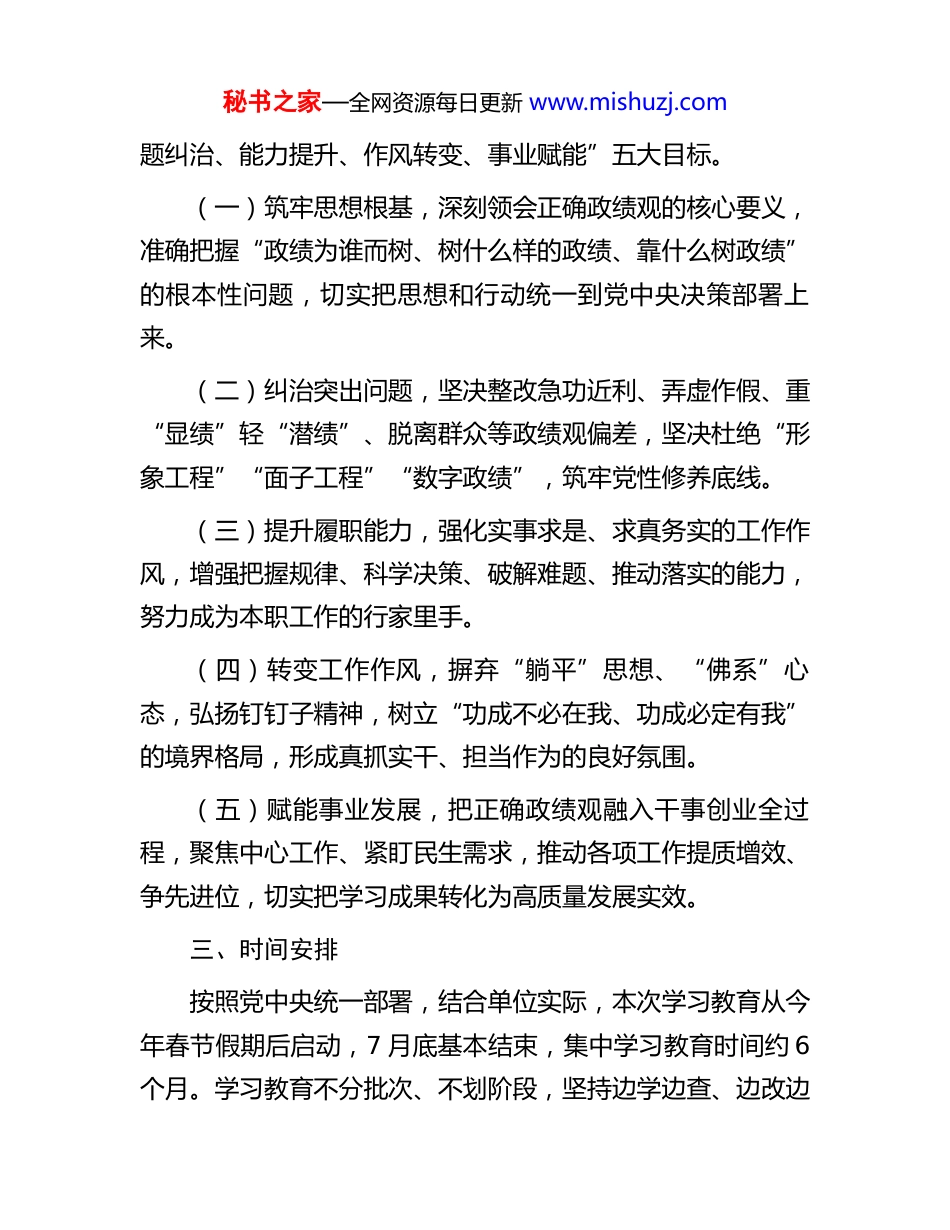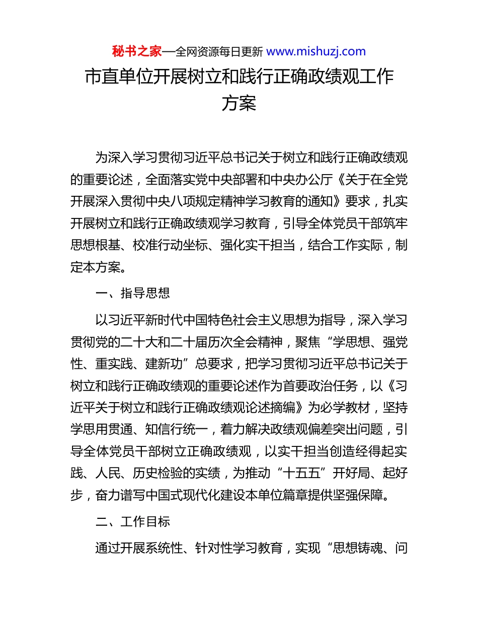 秘书之家—全网资源每日更新 www.mishuzj.com市直单位开展树立和践行正确政绩观工作方案为深入学习贯彻习近平总书记关于树立和践行正确政绩观的重要论述,全面落实党中央部署和中央办公厅《关于在全党开展深入贯彻中央八项规定精神学习教育的通知》要求,扎实开展树立和践行正确政绩观学习教育,引导全体党员干部筑牢思想根基、校准行动坐标、强化实干担当,结合工作实际,制定本方案。一、指导思想以习近平新时代中国特色社会主义思想为指导,深入学习贯彻党的二十大和二十届历次全会精神,聚焦“学思想、强党性、重实践、建新功”总要求,把学习贯彻习近平总书记关于树立和践行正确政绩观的重要论述作为首要政治任务,以《习近平关于树立和践行正确政绩观论述摘编》为必学教材,坚持学思用贯通、知信行统一,着力解决政绩观偏差突出问题,引导全体党员干部树立正确政绩观,以实干担当创造经得起实践、人民、历史检验的实绩,为推动“十五五”开好局、起好步,奋力谱写中国式现代化建设本单位篇章提供坚强保障。二、工作目标通过开展系统性、针对性学习教育,实现“思想铸魂、问秘书之家—全网资源每日更新 www.mishuzj.com题纠治、能力提升、作风转变、事业赋能”五大目标。(一)筑牢思想根基,深刻领会正确政绩观的核心要义,准确把握“政绩为谁而树、树什么样的政绩、靠什么树政绩”的根本性问题,切实把思想和行动统一到党中央决策部署上来。(二)纠治突出问题,坚决整改急功近利、弄虚作假、重“显绩”轻“潜绩”、脱离群众等政绩观偏差,坚决杜绝“形象工程”“面子工程”“数字政绩”,筑牢党性修养底线。(三)提升履职能力,强化实事求是、求真务实的工作作风,增强把握规律、科学决策、破解难题、推动落实的能力,努力成为本职工作的行家里手。(四)转变工作作风,摒弃“躺平”思想、“佛系”心态,弘扬钉钉子精神,树立“功成不必在我、功成必定有我”的境界格局,形成真抓实干、担当作为的良好氛围。(五)赋能事业发展,把正确政绩观融入干事创业全过程,聚焦中心工作、紧盯民生需求,推动各项工作提质增效、争先进位,切实把学习成果转化为高质量发展实效。三、时间安排按照党中央统一部署,结合单位实际,本次学习教育从今年春节假期后启动,7 月底基本结束,集中学习教育时间约 6个月。学习教育不分批次、不划阶段,坚持边学边查、边改边秘书之家—全网资源每日更新 www.mishuzj.com立,统筹推进、一体落实,确保学习教育走深走实、见行见效。四、主要学习内容聚焦树立和践行正确政绩观核心要求,突出重点、系统学习,重点抓好以下四个方面内容学习,确保学深悟透、融会贯通。(一)深化理论武装。把《习近平关于树立和践行正确政绩观论述摘编》作为必学教材、核心教材,逐篇研读、逐句领会,深刻把握习近平总书记关于正确政绩观的新思想、新观点、新论断。同步学习习近平总书记关于本领域本行业的重要讲话和重要指示精神,学习党的二十大和二十届历次全会精神、四中全会部署,学习《中共中央关于制定国民经济和社会发展第十五个五年规划的建议》及《规划》,不断提升政治判断力、政治领悟力、政治执行力。(二)强化政策文件学习。深入学习党中央关于开展树立和践行正确政绩观学习教育的相关部署要求,认真研读中办印发的《通知》,学习上级党委关于学习教育的工作安排和具体要求。结合工作实际,学习党章党规党纪、宪法法律,学习高质量发展相关政策、民生保障相关规定,不断规范履职行为、提升政策执行力。(三)加强典型案例学习。坚持正面引导与反面警示相结秘书之家—全网资源每日更新 www.mishuzj.com合,选取践行正确政绩观、真抓实干、实绩突出的先进典型案例,组织开展专题学习,汲取经验、凝聚力量;选取政绩观偏差、搞“形象工程”“虚假政绩”等反面典型案例,开展警示教育,以案为鉴、以案明纪,引导党员干部知敬畏、存戒惧、守底线。(四)突出实践锻炼。结合单位工作实际,学习借鉴兄弟单位开展学习教育的好做法、好经验,学习基层一线践行正确政绩观、办好民生实事的实践成果。立足本职岗位,学习业务知识、专业技能,深入学习调查研究...