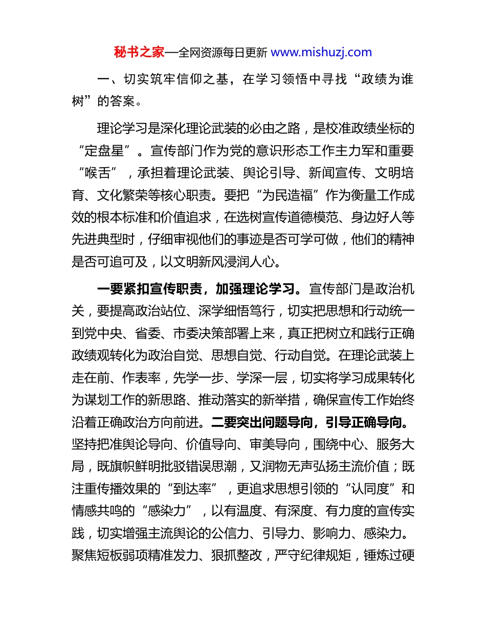 秘书之家—全网资源每日更新 www.mishuzj.com宣传部副部长树立和践行正确政绩观学习教育读书班交流发言提纲各位领导、同志们:习近平总书记指出,政绩观问题是一个根本性问题,关乎立党为公、执政为民。只有党性坚强、摒弃私心杂念,才能保证政绩观不出偏差。根据树立和践行正确政绩观学习教育读书班安排,近期重点学习了《习近平关于树立和践行正确政绩观论述摘编》《论党的宣传思想工作》等重要文献,对“政绩为谁树、树什么政绩、如何树政绩”这一根本命题有了更深刻的认识。作为宣传部门领导干部,必须始终把人民放在心中最高位置,把宣传思想文化工作的出发点和落脚点锚定在人民群众的获得感、幸福感、安全感上,以“时时放心不下”的责任感回应群众关切、解决急难愁盼、传递党的声音。结合分管工作,我将将认真写好每一篇报道、组织好每一场活动、选树好每一个典型,把镜头对准田间地头、社区小院、车间一线,让笔触饱含泥土温度、时代气息与百姓心声;在策划主题宣传时,反复叩问“群众想听什么”“基层需要什么”“实效体现在哪里”,坚决杜绝“自说自话”“闭门造车”“重形式轻内容”的倾向。下面,结合近期的学习收获,联系实际工作,与大家交流学习体会,恳请各位领导、同志们批评指正。秘书之家—全网资源每日更新 www.mishuzj.com一、切实筑牢信仰之基,在学习领悟中寻找“政绩为谁树”的答案。理论学习是深化理论武装的必由之路,是校准政绩坐标的“定盘星”。宣传部门作为党的意识形态工作主力军和重要“喉舌”,承担着理论武装、舆论引导、新闻宣传、文明培育、文化繁荣等核心职责。要把“为民造福”作为衡量工作成效的根本标准和价值追求,在选树宣传道德模范、身边好人等先进典型时,仔细审视他们的事迹是否可学可做,他们的精神是否可追可及,以文明新风浸润人心。一要紧扣宣传职责,加强理论学习。宣传部门是政治机关,要提高政治站位、深学细悟笃行,切实把思想和行动统一到党中央、省委、市委决策部署上来,真正把树立和践行正确政绩观转化为政治自觉、思想自觉、行动自觉。在理论武装上走在前、作表率,先学一步、学深一层,切实将学习成果转化为谋划工作的新思路、推动落实的新举措,确保宣传工作始终沿着正确政治方向前进。二要突出问题导向,引导正确导向。坚持把准舆论导向、价值导向、审美导向,围绕中心、服务大局,既旗帜鲜明批驳错误思潮,又润物无声弘扬主流价值;既注重传播效果的“到达率”,更追求思想引领的“认同度”和情感共鸣的“感染力”,以有温度、有深度、有力度的宣传实践,切实增强主流舆论的公信力、引导力、影响力、感染力。聚焦短板弱项精准发力、狠抓整改,严守纪律规矩,锤炼过硬秘书之家—全网资源每日更新 www.mishuzj.com作风,树立宣传干部良好形象。三要坚持学用结合,提升工作质效。作为宣传干部,宣传能力是履职尽责的基本功、硬本领、试金石。要以“脚力”丈量民情,在田间地头、社区小院、车间一线察实情、听真话;以“眼力”洞察民意,从群众表情、网络留言、来信来访中捕捉关切点、找准切入点;以“脑力”研判民需,把零散信息升华为规律认知,把基层呼声转化为政策建议;以“笔力”回应民盼,用沾泥土、带露珠、冒热气的语言讲好百姓故事、传递党的声音,真正让宣传工作可感可知、可亲可敬、可信可用。必须坚持守正不守旧、创新不离宗,把准时代脉搏、回应现实关切,在文明创建中破解“如何干”,切实以内容之实、形式之新、传播之效,推动党的创新理论“飞入寻常百姓家”、主流价值“润物细无声”、文化服务“精准滴灌到心坎”。二、切实担当时代之责,在守正创新中解决“树什么政绩”的问题党的新闻舆论工作是党的一项重要工作,是治国理政、定国安邦的大事。面对当前媒体融合的深刻变革,主动拥抱新技术、新载体,以群众喜闻乐见的方式讲好中国故事、传播好中国声音。把基层文化阵地建好用活,让群众在家门口共享文化盛宴。立足地方资源禀赋和发展阶段,坚持守正创新、因地制宜,以改革创新精神破解发展瓶颈,创造既利当前又惠长远的潜绩。秘书之家—全网资源每日更新 www.mishuzj.com一是筑牢思想根基,把...
