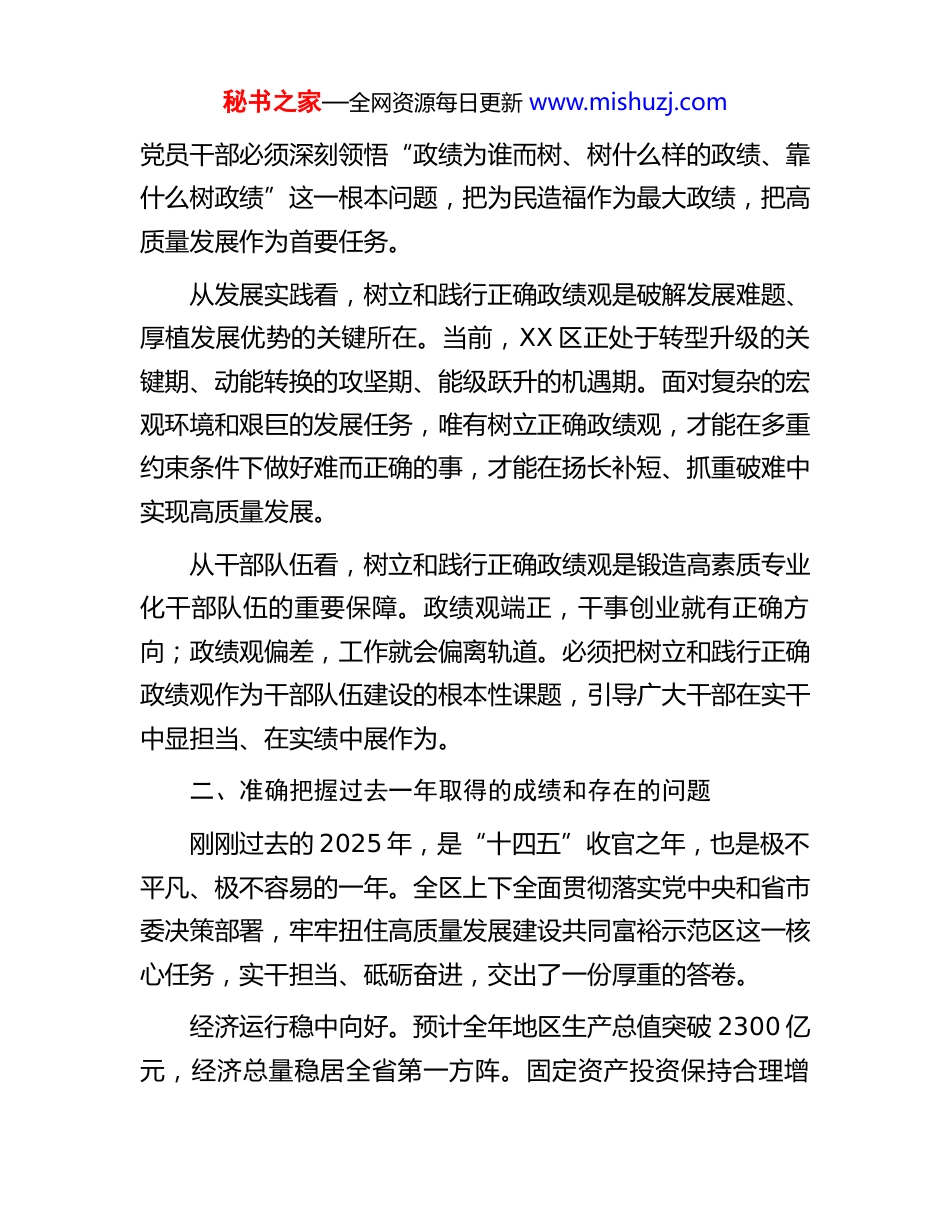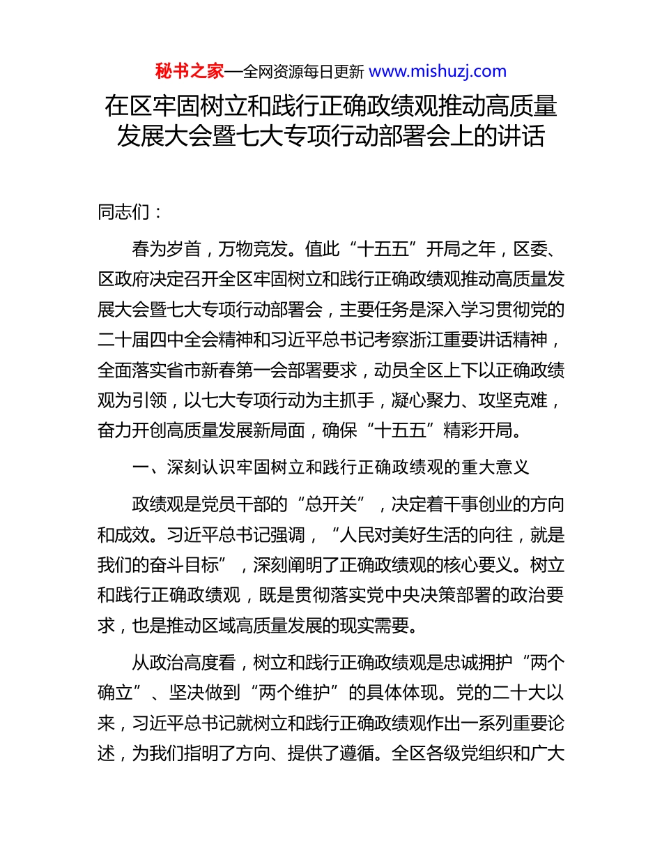 秘书之家—全网资源每日更新 www.mishuzj.com在区牢固树立和践行正确政绩观推动高质量发展大会暨七大专项行动部署会上的讲话同志们:春为岁首,万物竞发。值此“十五五”开局之年,区委、区政府决定召开全区牢固树立和践行正确政绩观推动高质量发展大会暨七大专项行动部署会,主要任务是深入学习贯彻党的二十届四中全会精神和习近平总书记考察浙江重要讲话精神,全面落实省市新春第一会部署要求,动员全区上下以正确政绩观为引领,以七大专项行动为主抓手,凝心聚力、攻坚克难,奋力开创高质量发展新局面,确保“十五五”精彩开局。一、深刻认识牢固树立和践行正确政绩观的重大意义政绩观是党员干部的“总开关”,决定着干事创业的方向和成效。习近平总书记强调,“人民对美好生活的向往,就是我们的奋斗目标”,深刻阐明了正确政绩观的核心要义。树立和践行正确政绩观,既是贯彻落实党中央决策部署的政治要求,也是推动区域高质量发展的现实需要。从政治高度看,树立和践行正确政绩观是忠诚拥护“两个确立”、坚决做到“两个维护”的具体体现。党的二十大以来,习近平总书记就树立和践行正确政绩观作出一系列重要论述,为我们指明了方向、提供了遵循。全区各级党组织和广大秘书之家—全网资源每日更新 www.mishuzj.com党员干部必须深刻领悟“政绩为谁而树、树什么样的政绩、靠什么树政绩”这一根本问题,把为民造福作为最大政绩,把高质量发展作为首要任务。从发展实践看,树立和践行正确政绩观是破解发展难题、厚植发展优势的关键所在。当前,XX 区正处于转型升级的关键期、动能转换的攻坚期、能级跃升的机遇期。面对复杂的宏观环境和艰巨的发展任务,唯有树立正确政绩观,才能在多重约束条件下做好难而正确的事,才能在扬长补短、抓重破难中实现高质量发展。从干部队伍看,树立和践行正确政绩观是锻造高素质专业化干部队伍的重要保障。政绩观端正,干事创业就有正确方向;政绩观偏差,工作就会偏离轨道。必须把树立和践行正确政绩观作为干部队伍建设的根本性课题,引导广大干部在实干中显担当、在实绩中展作为。二、准确把握过去一年取得的成绩和存在的问题刚刚过去的 2025 年,是“十四五”收官之年,也是极不平凡、极不容易的一年。全区上下全面贯彻落实党中央和省市委决策部署,牢牢扭住高质量发展建设共同富裕示范区这一核心任务,实干担当、砥砺奋进,交出了一份厚重的答卷。经济运行稳中向好。预计全年地区生产总值突破 2300 亿元,经济总量稳居全省第一方阵。固定资产投资保持合理增秘书之家—全网资源每日更新 www.mishuzj.com长,社会消费品零售总额连续四年位居全市前列。主要经济指标较好完成预期目标,为“十五五”开局奠定了坚实基础。产业转型蹄疾步稳。“1+4”现代产业体系持续优化,数字经济、生命健康、电竞文娱等新兴产业蓬勃发展。高新技术产业投资、制造业投资年均增速分别达到 14%、23.3%,创新动能持续增强。城市品质持续提升。大运河国家文化公园建设深入推进,城市有机更新取得阶段性成效。基础设施不断完善,城市综合承载能力显著增强。民生福祉日益增进。公共服务更加优质均衡,教育、医疗、养老等事业取得新进步。“平安 XX”建设纵深推进,社会大局和谐稳定。党的建设全面加强。扎实开展学习贯彻习近平新时代中国特色社会主义思想主题教育,干部队伍精气神有效提振,政治生态持续向好。在肯定成绩的同时,也要清醒认识到工作中存在的短板和不足。一是经济回升向好的基础还不够稳固,部分行业和企业经营困难依然存在;二是新旧动能转换还需加速,战略性新兴产业比重有待提高;三是城市精细化管理水平有待提升,部分区域环境面貌仍需改善;四是少数干部担当意识不强、能力不足的问题依然存在。对于这些问题,必须高度重视、切实加以秘书之家—全网资源每日更新 www.mishuzj.com解决。三、全力以赴抓好七大专项行动落实落地为深入贯彻落实中央和省市部署要求,区委、区政府决定在全区开展七大专项行动,作为“十五五”开局之年的主抓手、主引擎,以重点突破带动整体提升。第一,深入实施抓项目促投资专项行动。项目是发展的生命线,投资是...
