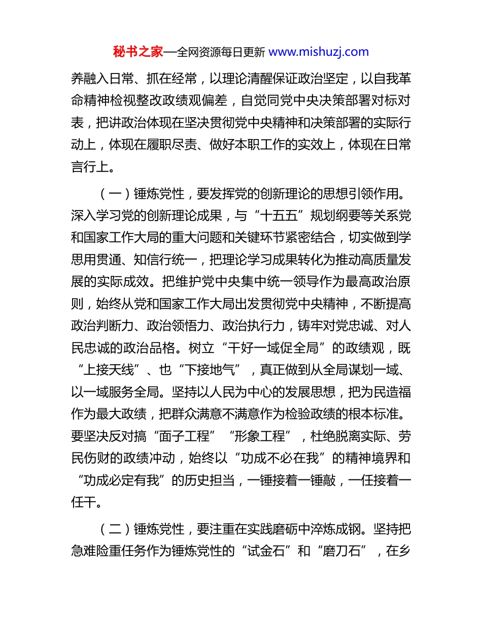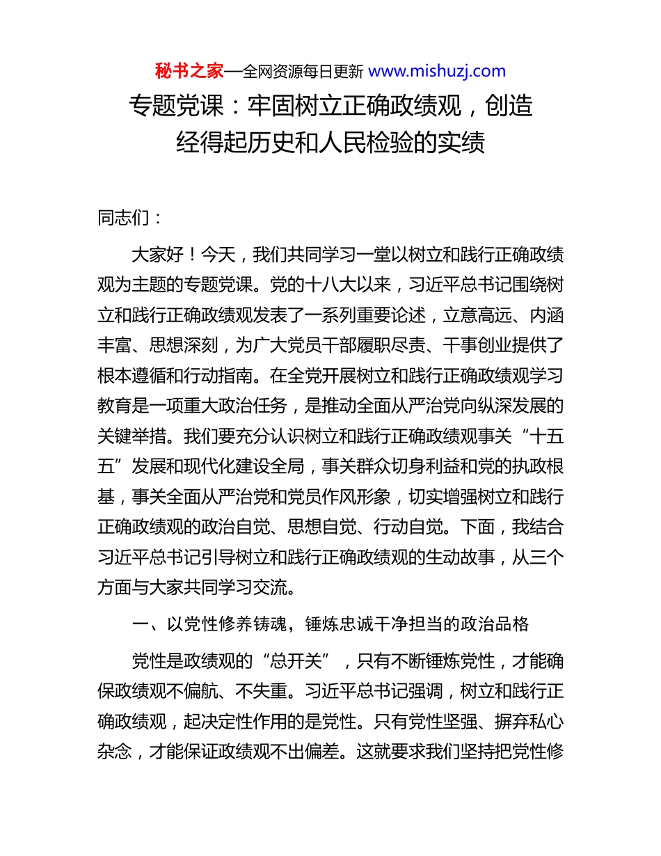 秘书之家—全网资源每日更新 www.mishuzj.com专题党课:牢固树立正确政绩观,创造经得起历史和人民检验的实绩同志们:大家好!今天,我们共同学习一堂以树立和践行正确政绩观为主题的专题党课。党的十八大以来,习近平总书记围绕树立和践行正确政绩观发表了一系列重要论述,立意高远、内涵丰富、思想深刻,为广大党员干部履职尽责、干事创业提供了根本遵循和行动指南。在全党开展树立和践行正确政绩观学习教育是一项重大政治任务,是推动全面从严治党向纵深发展的关键举措。我们要充分认识树立和践行正确政绩观事关“十五五”发展和现代化建设全局,事关群众切身利益和党的执政根基,事关全面从严治党和党员作风形象,切实增强树立和践行正确政绩观的政治自觉、思想自觉、行动自觉。下面,我结合习近平总书记引导树立和践行正确政绩观的生动故事,从三个方面与大家共同学习交流。一、以党性修养铸魂,锤炼忠诚干净担当的政治品格党性是政绩观的“总开关”,只有不断锤炼党性,才能确保政绩观不偏航、不失重。习近平总书记强调,树立和践行正确政绩观,起决定性作用的是党性。只有党性坚强、摒弃私心杂念,才能保证政绩观不出偏差。这就要求我们坚持把党性修秘书之家—全网资源每日更新 www.mishuzj.com养融入日常、抓在经常,以理论清醒保证政治坚定,以自我革命精神检视整改政绩观偏差,自觉同党中央决策部署对标对表,把讲政治体现在坚决贯彻党中央精神和决策部署的实际行动上,体现在履职尽责、做好本职工作的实效上,体现在日常言行上。(一)锤炼党性,要发挥党的创新理论的思想引领作用。深入学习党的创新理论成果,与“十五五”规划纲要等关系党和国家工作大局的重大问题和关键环节紧密结合,切实做到学思用贯通、知信行统一,把理论学习成果转化为推动高质量发展的实际成效。把维护党中央集中统一领导作为最高政治原则,始终从党和国家工作大局出发贯彻党中央精神,不断提高政治判断力、政治领悟力、政治执行力,铸牢对党忠诚、对人民忠诚的政治品格。树立“干好一域促全局”的政绩观,既“上接天线”、也“下接地气”,真正做到从全局谋划一域、以一域服务全局。坚持以人民为中心的发展思想,把为民造福作为最大政绩,把群众满意不满意作为检验政绩的根本标准。要坚决反对搞“面子工程”“形象工程”,杜绝脱离实际、劳民伤财的政绩冲动,始终以“功成不必在我”的精神境界和“功成必定有我”的历史担当,一锤接着一锤敲,一任接着一任干。(二)锤炼党性,要注重在实践磨砺中淬炼成钢。坚持把急难险重任务作为锤炼党性的“试金石”和“磨刀石”,在乡秘书之家—全网资源每日更新 www.mishuzj.com村振兴一线、改革发展前沿、基层治理现场经风雨、见世面、壮筋骨、长才干。严格落实中央八项规定及其实施细则精神,驰而不息纠治形式主义、官僚主义,以严实作风保障正确政绩观落地见效。常态化开展党性分析和政绩观检视,用好批评与自我批评武器,及时校准偏差、纠偏正向。深入基层一线和重大斗争前线,问政于民、问需于民、问计于民,敢于斗争、善于斗争,提升应急处突和风险应对能力,自觉运用法治思维和法治方式处理问题。克服“盲目乱干”的乱作为,“事事甩锅”的不作为,“机械执行”的不敢为,“方法老旧”的不善为问题,把人民对美好生活的向往作为奋斗目标,在为民造福中砥砺党性。(三)锤炼党性,要始终把纪律规矩挺在前面。党性不会自然保质保鲜,缺乏纪律规矩刚性约束,权力就容易脱缰,政绩观就会扭曲。把党规党纪作为政绩创造的底线,明确“形象工程”“政绩工程”“数据造假”等行为纪律红线,使铁的纪律转化为日常习惯和自觉遵循。坚持用党章党规党纪校正思想和行动,常态化开展警示教育,以案为鉴、以案促改,让党员干部知敬畏、存戒惧、守底线。常警物欲贪欲之祸,慎独慎微慎始慎终,主动对标新时代好干部标准找差距,自觉抵制形式主义、官僚主义、享乐主义和奢靡之风,筑牢拒腐防变的思想堤坝。要始终把纪律教育融入日常、抓在经常,坚持严管与厚爱结合、激励与约束并重,推动形成能者上、优者奖、庸者秘书之家—全网资源每日更新 www.mishuzj.com下...