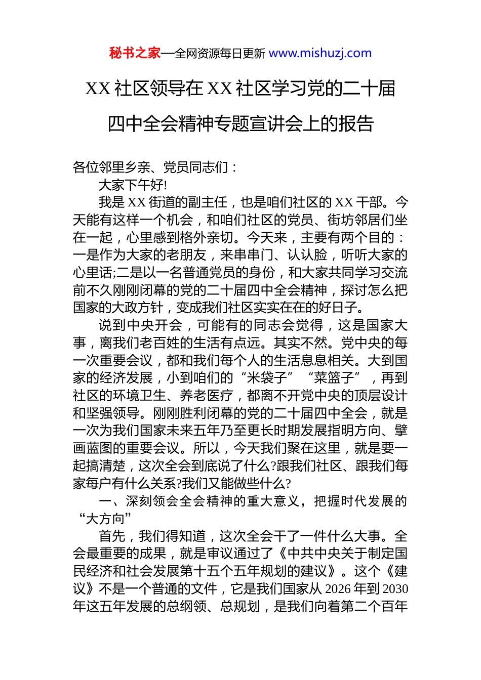 秘书之家—全网资源每日更新 www.mishuzj.comXX 社区领导在 XX 社区学习党的二十届四中全会精神专题宣讲会上的报告各位邻里乡亲、党员同志们:大家下午好!我是 XX 街道的副主任,也是咱们社区的 XX 干部。今天能有这样一个机会,和咱们社区的党员、街坊邻居们坐在一起,心里感到格外亲切。今天来,主要有两个目的:一是作为大家的老朋友,来串串门、认认脸,听听大家的心里话;二是以一名普通党员的身份,和大家共同学习交流前不久刚刚闭幕的党的二十届四中全会精神,探讨怎么把国家的大政方针,变成我们社区实实在在的好日子。说到中央开会,可能有的同志会觉得,这是国家大事,离我们老百姓的生活有点远。其实不然。党中央的每一次重要会议,都和我们每个人的生活息息相关。大到国家的经济发展,小到咱们的“米袋子”“菜篮子”,再到社区的环境卫生、养老医疗,都离不开党中央的顶层设计和坚强领导。刚刚胜利闭幕的党的二十届四中全会,就是一次为我们国家未来五年乃至更长时期发展指明方向、擘画蓝图的重要会议。所以,今天我们聚在这里,就是要一起搞清楚,这次全会到底说了什么?跟我们社区、跟我们每家每户有什么关系?我们又能做些什么?一、深刻领会全会精神的重大意义,把握时代发展的“大方向”首先,我们得知道,这次全会干了一件什么大事。全会最重要的成果,就是审议通过了《中共中央关于制定国民经济和社会发展第十五个五年规划的建议》。这个《建议》不是一个普通的文件,它是我们国家从 2026 年到 2030年这五年发展的总纲领、总规划,是我们向着第二个百年秘书之家—全网资源每日更新 www.mishuzj.com奋斗目标进军的关键一步的行动指南。为什么说它这么重要?第一,这次全会召开于一个关键的历史节点。大家想一想,现在是 2025 年底,“十四五”即将收官,“十五五”马上就要开启。我们正处在全面建设社会主义现代化国家、向第二个百年奋斗目标进军的新征程上。前面的路怎么走,发展的重点在哪里,面临的挑战怎么应对,都需要党中央给我们一个明确的指引。二十届四中全会就承担了这样一个“承前启后、继往开来”的重大历史使命。它为我们描绘了未来五年的发展蓝图,让我们每个人都对未来有了更清晰的预期和更坚定的信心。第二,这次全会的核心成果关系到我们每个人的切身利益。“五年规划”听起来宏大,但它最终要落实在一个个具体的项目、一项项具体的政策上。比如,未来五年国家要重点发展哪些产业,可能会影响到我们子女的就业选择;国家要在社会保障方面投入多少,直接关系到我们的养老金能不能涨、医保报销比例高不高;国家要如何推进城市更新和乡村振兴,决定了我们社区的环境会不会更美、生活会不会更便利。可以说,《建议》中的每一条,都与我们的衣食住行、安危冷暖紧密相连。第三,这次全会进一步彰显了我们制度的巨大优势。世界上很少有哪个国家、哪个政党能够像我们这样,制定出如此长远、系统、科学的发展规划,并且一茬接着一茬干,一张蓝图绘到底。这背后,就是中国特色社会主义制度的优越性,就是坚持党的全面领导这个“定海神针”。习近平总书记在全会上的重要讲话,高屋建瓴、思想深邃,是我们理解和把握全会精神的“纲”和“魂”为我们指明了前进的方向。正是因为有党的坚强领导,我们才能集中力量办大事,战胜各种风险挑战,推动经济社会持续健康发展。所以说,学习二十届四中全会精神,绝不是一句空秘书之家—全网资源每日更新 www.mishuzj.com话,而是帮助我们看清大势、明确方向,把我们个人的奋斗、社区的发展,融入到国家发展的宏伟蓝图之中,让我们走得更稳、更有劲。二、深入解读全会精神的核心要义,明确未来发展的“路线图”搞清楚了全会的重大意义,我们再来一起看看,《建议》这份“路线图”里,到底画了些什么,和我们社区的发展有什么紧密的联系。虽然《建议》全文内容非常丰富,但我们可以从几个和我们基层感受最深的方面来理解。(一)高质量发展是首要任务,为社区繁荣注入新动能全会《建议》肯定会继续强调,发展是硬道理,但新时代的发展,必须是高质量的发展。这意味着不能再走过去那种粗放式增长的老路,而是要依...