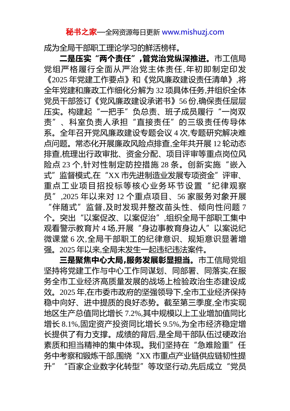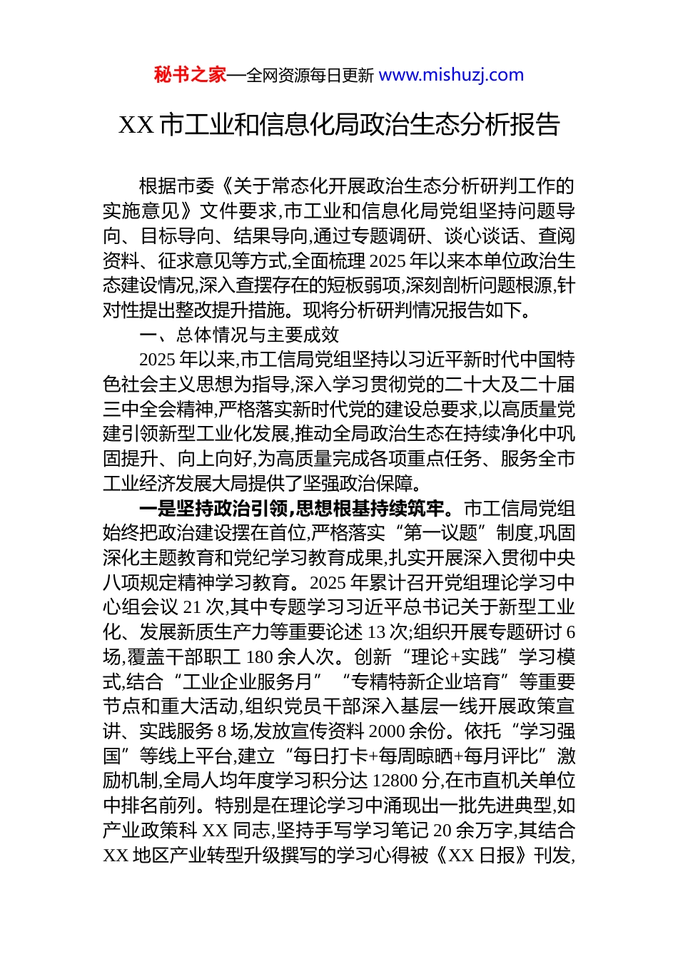 秘书之家—全网资源每日更新 www.mishuzj.comXX 市工业和信息化局政治生态分析报告根据市委《关于常态化开展政治生态分析研判工作的实施意见》文件要求,市工业和信息化局党组坚持问题导向、目标导向、结果导向,通过专题调研、谈心谈话、查阅资料、征求意见等方式,全面梳理 2025 年以来本单位政治生态建设情况,深入查摆存在的短板弱项,深刻剖析问题根源,针对性提出整改提升措施。现将分析研判情况报告如下。一、总体情况与主要成效2025 年以来,市工信局党组坚持以习近平新时代中国特色社会主义思想为指导,深入学习贯彻党的二十大及二十届三中全会精神,严格落实新时代党的建设总要求,以高质量党建引领新型工业化发展,推动全局政治生态在持续净化中巩固提升、向上向好,为高质量完成各项重点任务、服务全市工业经济发展大局提供了坚强政治保障。一是坚持政治引领,思想根基持续筑牢。市工信局党组始终把政治建设摆在首位,严格落实“第一议题”制度,巩固深化主题教育和党纪学习教育成果,扎实开展深入贯彻中央八项规定精神学习教育。2025 年累计召开党组理论学习中心组会议 21 次,其中专题学习习近平总书记关于新型工业化、发展新质生产力等重要论述 13 次;组织开展专题研讨 6场,覆盖干部职工 180 余人次。创新“理论+实践”学习模式,结合“工业企业服务月”“专精特新企业培育”等重要节点和重大活动,组织党员干部深入基层一线开展政策宣讲、实践服务 8 场,发放宣传资料 2000 余份。依托“学习强国”等线上平台,建立“每日打卡+每周晾晒+每月评比”激励机制,全局人均年度学习积分达 12800 分,在市直机关单位中排名前列。特别是在理论学习中涌现出一批先进典型,如产业政策科 XX 同志,坚持手写学习笔记 20 余万字,其结合XX 地区产业转型升级撰写的学习心得被《XX 日报》刊发,秘书之家—全网资源每日更新 www.mishuzj.com成为全局干部职工理论学习的鲜活榜样。二是压实“两个责任”,管党治党纵深推进。市工信局党组严格履行全面从严治党主体责任,年初即制定印发《2025 年党建工作要点》和《党风廉政建设责任清单》,将全年党建和廉政工作细化分解为 32 项具体任务,并组织全体党员干部签订《党风廉政建设承诺书》56 份,确保责任层层压实。构建起“一把手”负总责、班子成员履行“一岗双责”、科室负责人承担“直接责任”的三级责任传导体系。全年召开党风廉政建设专题会议 4 次,专题研究解决难点问题。常态化开展廉政风险点排查,全年共开展 12 轮动态排查,梳理出行政审批、资金分配、项目评审等重点岗位风险点 23 个,针对性制定防控措施 28 条。创新实施“嵌入式”监督模式,在“XX 市先进制造业发展专项资金”评审、重点工业项目招投标等核心业务环节设置“纪律观察员”,2025 年以来对 12 个重点项目、56 家服务对象开展“伴随式”监督,及时发现并整改苗头性、倾向性问题 7个。突出“以案促改、以案促治”,组织全局干部职工集中观看警示教育片 4 场,开展“身边事教育身边人”以案说纪微课堂 6 次,全局干部职工的纪律意识、规矩意识显著增强。2025 年以来,全局未发生一起违纪违法案件。三是聚焦中心大局,服务发展彰显担当。市工信局党组坚持将党建工作与中心工作同谋划、同部署、同落实,在服务全市工业经济高质量发展的战场上检验政治生态建设成效。2025 年,在市委市政府的坚强领导下,全市工业经济保持稳中向好、进中提质的良好态势。截至第三季度,全市实现地区生产总值同比增长 7.2%,其中规模以上工业增加值同比增长 8.1%,固定资产投资同比增长 9.5%,为全市经济稳定增长提供了有力支撑。成绩的背后,是全局干部队伍过硬政治素质和担当精神的集中体现。我们坚持在“急难险重”任务中考察和锻炼干部,围绕“XX 市重点产业链供应链韧性提升”“百家企业数字化转型”等攻坚行动,先后成立“党员秘书之家—全网资源每日更新 www.mishuzj.com突击队”7 支,设立“党员先锋岗”15 个。在推进 XX 老工业基地产业转型升级专项工作中,相关党员干部连续奋战 60余天,深入企业摸排情况、协调解决用能、用地、融资等突出问题 28 个,有力保障了项...