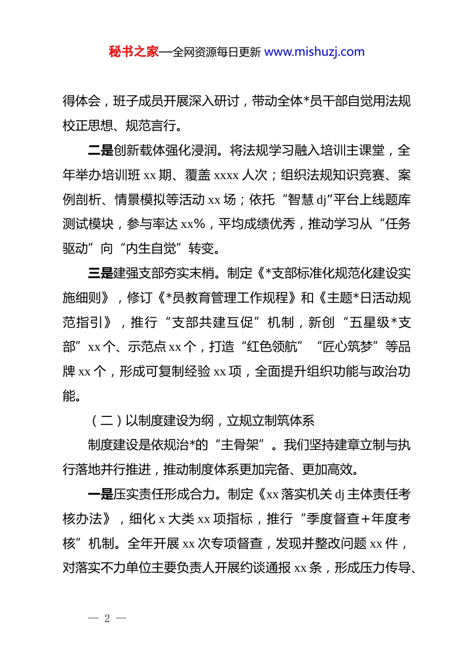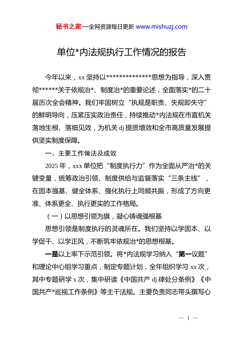 秘书之家—全网资源每日更新 www.mishuzj.com单位*内法规执行工作情况的报告今年以来,xx 坚持以**************思想为指导,深入贯彻******关于依规治*、制度治*的重要论述,全面落实*的二十届历次全会精神。我们牢固树立“执规是职责、失规即失守”的鲜明导向,压紧压实政治责任,持续推动*内法规在市直机关落地生根、落细见效,为机关 dj 提质增效和全市高质量发展提供坚实制度保障。一、主要工作做法及成效2025 年,xxx 单位把“制度执行力”作为全面从严治*的关键变量,统筹政治引领、制度供给与监督落实“三条主线”,在固本强基、健全体系、强化执行上同频共振,形成了方向更准、体系更全、执行更实的工作格局。(一)以思想引领为旗,凝心铸魂强根基思想引领是制度执行的灵魂所在。我们坚持以学固本、以学促干、以学正风,不断筑牢依规治*的思想根基。一是以上率下示范引领。将*内法规学习纳入“第一议题”和理论中心组学习重点,制定专题计划,全年组织学习 xx 次,其中专题研学 x 次,集中研读《中国共产 dj 律处分条例》《中国共产*巡视工作条例》等主干法规。主要负责同志带头撰写心— 1 —秘书之家—全网资源每日更新 www.mishuzj.com得体会,班子成员开展深入研讨,带动全体*员干部自觉用法规校正思想、规范言行。二是创新载体强化浸润。将法规学习融入培训主课堂,全年举办培训班 xx 期、覆盖 xxxx 人次;组织法规知识竞赛、案例剖析、情景模拟等活动 xx 场;依托“智慧 dj”平台上线题库测试模块,参与率达 xx%,平均成绩优秀,推动学习从“任务驱动”向“内生自觉”转变。三是建强支部夯实末梢。制定《*支部标准化规范化建设实施细则》,修订《*员教育管理工作规程》和《主题*日活动规范指引》,推行“支部共建互促”机制,新创“五星级*支部”xx 个、示范点 xx 个,打造“红色领航”“匠心筑梦”等品牌 xx 个,形成可复制经验 xx 项,全面提升组织功能与政治功能。(二)以制度建设为纲,立规立制筑体系制度建设是依规治*的“主骨架”。我们坚持建章立制与执行落地并行推进,推动制度体系更加完备、更加高效。一是压实责任形成合力。制定《xx 落实机关 dj 主体责任考核办法》,细化 x 大类 xx 项指标,推行“季度督查+年度考核”机制。全年开展 xx 次专项督查,发现并整改问题 xx 件,对落实不力单位主要负责人开展约谈通报 xx 条,形成压力传导、— 2 —秘书之家—全网资源每日更新 www.mishuzj.com整改落实、跟踪评估的闭环链条。二是健全机制完善约束。修订监督执纪实施细则,新增风险防控条款 xx 条;编制履职指引、细化流程 xx 项,明确职责边界与操作标准;推行纪检干部“一人一档”履职台账管理,建立交叉检查机制,促进监督工作制度化、精准化。三是闭环管理动态更新。制定《关于加强和改进新时代机关思想政治工作的实施办法》及 x 项配套细则,修订制度 xx 项、新立制度 x 项,组织开展制度执行“回头看”,自查整改 xx 项,实行“半年评估、动态修订”,让制度“建得成、立得住、用得好”。(三)以监督执行为要,从严从实树权威监督是制度执行的生命线。我们以精准监督促规范、以刚性问责促落实,推动制度真正落地见效。一是实训赋能强本领。全年举办法规执行专题培训 xx 期、培训骨干 xxxx 人;推行“师徒结对”、组织经验交流 xx 场;建设实训基地 x 个、模拟案卷评查 xx 次、情景处置演练 xx 次,通过“以训带练、以练促干”,全面提升干部依规履职能力。二是精准监督提质效。开展专项检查 x 次、抽查单位 xx 个、整改问题 xx 个;运用数字化监督模型开展交叉检查 x 次、发现线索 xx 条;在重大项目、重要资金、关键环节推行“嵌入式监— 3 —秘书之家—全网资源每日更新 www.mishuzj.com督”,实现监督前置、风险前移、问题前控。三是严肃问责树威信。处置问题线索 xx 件、立案 xx 件、处分 xx 人;精准运用“四种形态”xx 人次,其中第一种形态占比 xx%,做到抓早抓小、防微杜渐;召开警示教育大会 x 场、通报典型案例 xx 起,推动“查处一案、...