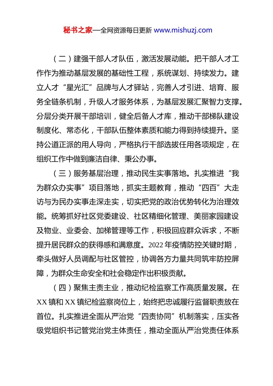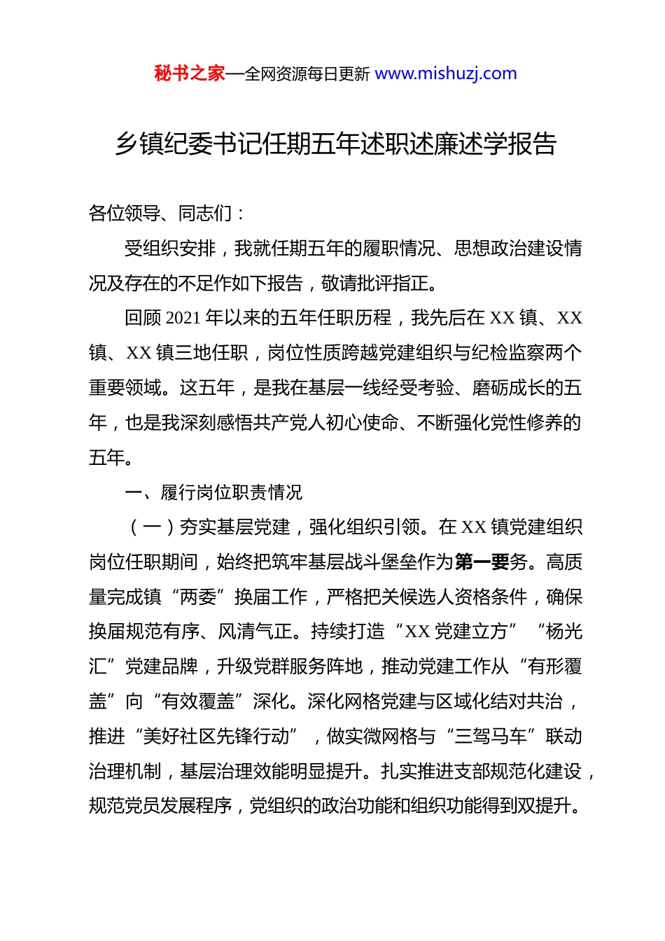 秘书之家—全网资源每日更新 www.mishuzj.com乡镇纪委书记任期五年述职述廉述学报告 各位领导、同志们:受组织安排,我就任期五年的履职情况、思想政治建设情况及存在的不足作如下报告,敬请批评指正。回顾 2021 年以来的五年任职历程,我先后在 XX 镇、XX镇、XX 镇三地任职,岗位性质跨越党建组织与纪检监察两个重要领域。这五年,是我在基层一线经受考验、磨砺成长的五年,也是我深刻感悟共产党人初心使命、不断强化党性修养的五年。一、履行岗位职责情况(一)夯实基层党建,强化组织引领。在 XX 镇党建组织岗位任职期间,始终把筑牢基层战斗堡垒作为第一要务。高质量完成镇“两委”换届工作,严格把关候选人资格条件,确保换届规范有序、风清气正。持续打造“XX 党建立方”“杨光汇”党建品牌,升级党群服务阵地,推动党建工作从“有形覆盖”向“有效覆盖”深化。深化网格党建与区域化结对共治,推进“美好社区先锋行动”,做实微网格与“三驾马车”联动治理机制,基层治理效能明显提升。扎实推进支部规范化建设,规范党员发展程序,党组织的政治功能和组织功能得到双提升。秘书之家—全网资源每日更新 www.mishuzj.com(二)建强干部人才队伍,激活发展动能。把干部人才工作作为推动基层发展的基础性工程,系统谋划、持续发力。建立人才“星光汇”品牌与人才驿站,完善人才引进、培育、服务全链条机制,升级人才服务体系,为基层发展汇聚智力支撑。分层分类开展干部培训,健全后备人才库,推动干部梯队建设制度化、常态化,干部队伍整体素质和能力得到持续提升。坚持公道正派的用人导向,严格执行干部选拔任用各项规定,在组织工作中做到廉洁自律、秉公办事。(三)服务基层治理,推动民生实事落地。扎实推进“我为群众办实事”项目落地,抓实主题教育,推动“四百”大走访与为民办实事走深走实,切实把党的政治优势转化为治理效能。统筹抓好社区党委建设、社区精细化管理、美丽家园建设及物业、业委会、加梯管理等工作,积极回应群众诉求,不断提升居民群众的获得感和满意度。2022 年疫情防控关键时期,牵头做好人员调配与社区管控,协调各方力量共同筑牢防控屏障,为群众生命安全和社会稳定作出积极贡献。(四)聚焦主责主业,推动纪检监察工作高质量发展。在XX 镇和 XX 镇纪检监察岗位上,始终把忠诚履行监督职责放在首位。扎实推进全面从严治党“四责协同”机制落实,压实各级党组织书记管党治党主体责任,推动全面从严治党责任体系秘书之家—全网资源每日更新 www.mishuzj.com在基层有效运转。保持惩腐肃贪高压态势,严格落实“有腐必反、有贪必肃”要求,对问题线索认真甄别、依规处置,强化案后治理,以案促改、以案促建,实现查处一案、警示一片、治理一域的综合效果。按照中央纪委国家监委关于开展群众身边不正之风和腐败问题集中整治的统一部署,聚焦“三资”管理、惠民资金发放、工程项目建设等重点领域开展专项监督检查,切实维护群众切身利益。扎实推进“清廉 XX”和清廉单元建设,创新廉洁教育载体,强化警示教育,推动廉洁文化入脑入心,营造风清气正的政治生态。二、思想政治建设情况(一)坚定理想信念,强化政治引领。五年来,我始终把政治建设摆在首位,深刻领悟“两个确立”的决定性意义,增强“四个意识”、坚定“四个自信”、做到“两个维护”。认真学习贯彻习近平新时代中国特色社会主义思想,深入学习党的二十大和二十届历次全会精神,特别是对党的二十届三中、四中全会关于全面从严治党、推进纪检监察工作高质量发展的重大部署,做到深学细悟、融会贯通。坚持参加党委理论学习中心组学习,撰写学习笔记和心得体会,做到学思用贯通、知信行统一。(二)锤炼党性修养,涵养廉洁品格。在纪检监察岗位上,秘书之家—全网资源每日更新 www.mishuzj.com我深知“打铁必须自身硬”的深刻内涵。工作中严格遵守党纪国法,认真落实中央八项规定精神,自觉抵制各类“四风”问题。生活中保持艰苦朴素的作风,不搞特殊化,不接受可能影响公正执行公务的礼品礼金,做到廉洁用权、廉洁齐家。在党建组织岗位任职期间,同样严格执行干部选拔任用各项...