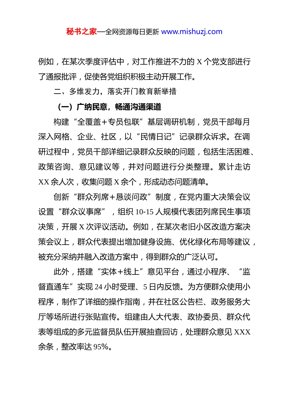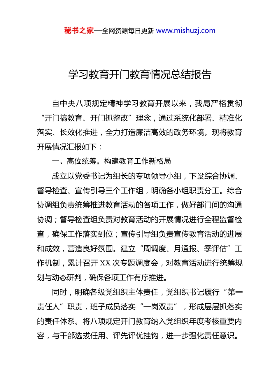 秘书之家—全网资源每日更新 www.mishuzj.com学习教育开门教育情况总结报告自中央八项规定精神学习教育开展以来,我局严格贯彻“开门搞教育、开门抓整改”理念,通过系统化部署、精准化落实、长效化推进,全力打造廉洁高效的政务环境。现将教育开展情况汇报如下:一、高位统筹,构建教育工作新格局成立以党委书记为组长的专项领导小组,下设综合协调、督导检查、宣传引导三个工作组,明确各小组职责分工。综合协调组负责统筹推进教育活动的各项工作,做好部门间的沟通协调;督导检查组负责对教育活动的开展情况进行全程监督检查,确保工作落实到位;宣传引导组负责宣传教育活动的进展和成效,营造良好氛围。建立“周调度、月通报、季评估”工作机制,累计召开 XX 次专题调度会,对教育活动进行统筹规划与动态研判,确保各项工作有序推进。同时,明确各级党组织主体责任,党组织书记履行“第一责任人”职责,班子成员落实“一岗双责”,形成层层抓落实的责任体系。将八项规定开门教育纳入党组织年度考核重要内容,与干部选拔任用、评先评优挂钩,进一步强化责任意识。秘书之家—全网资源每日更新 www.mishuzj.com例如,在某次季度评估中,对工作推进不力的 X 个党支部进行了通报批评,促使各党组织积极主动开展工作。二、多维发力,落实开门教育新举措(一)广纳民意,畅通沟通渠道构建“全覆盖+专员包联”基层调研机制,党员干部每月深入网格、企业、社区,以“民情日记”记录群众诉求。在调研过程中,党员干部详细记录群众反映的问题,包括生活困难、政策咨询、意见建议等,并对问题进行分类整理。累计走访XX 余人次,收集问题 X 余个,形成动态问题清单。创新“群众列席+恳谈问政”制度,在党内重大决策会议设置“群众议事席”,组织 10-15 人规模代表团列席民生事项决策,开展 X 次评议活动。例如,在某次老旧小区改造方案决策会议上,群众代表提出增加健身设施、优化绿化布局等建议,被充分采纳并融入改造方案中,得到群众的广泛认可。此外,搭建“实体+线上”意见平台,通过小程序、“监督直通车”实现 24 小时受理、5 日内反馈。为方便群众使用小程序,制作了详细的操作指南,并在社区公告栏、政务服务大厅等场所进行张贴宣传。组建由人大代表、政协委员、群众代表等组成的多元监督员队伍开展抽查回访,处理群众意见 XXX余条,整改率达 95%。秘书之家—全网资源每日更新 www.mishuzj.com(二)靶向整改,强化责任落实实行问题清单“动态更新+三色预警”制度,设立“整改进度红绿灯”,对红灯预警问题进行责任约谈,黄灯问题专班督办,绿灯事项由群众验收,并在政务公开平台实时更新。例如,针对群众反映强烈的某审批事项流程繁琐问题,因整改不力被列为红灯预警,对相关责任人进行了约谈,促使其加快整改进度。发布预警 XX 次,完成整改事项 XXX 个。常态化开展以案促改,通过内部通报、官网公示、案例宣讲,实施“一案三查”分析制度漏洞。选取近年来发生的典型案例,如某工作人员违规收受礼品礼金案件,组织全局干部职工开展警示教育,深入剖析案件发生的原因、暴露的问题以及制度漏洞。发布案例 XX 起,完善制度 XX 项。建立“纪检+媒体+群众”联合监督机制,围绕重点领域开展“靶向暗访”,拍摄问题视频 X 部。例如,针对工程建设领域开展暗访,发现个别项目存在违规转包问题,通过媒体曝光后,相关部门迅速介入调查,推动问题限期整改并销号归档。(三)优化服务,提升办事效能制定年度《民生实事项目表》,推行“一项目一领导一专班”,设立 XXX 万元“微实事”专项资金,30 日内响应群众秘书之家—全网资源每日更新 www.mishuzj.com需求。在实施某社区道路硬化项目时,专班人员积极协调各方资源,确保项目按时开工、顺利推进,完成民生项目 XX 个。开展“百名党员领办百件微心愿”活动,党员亮身份、作承诺,设立“党员先锋岗”,将群众评分纳入考核。党员干部积极认领群众微心愿,帮助困难群众解决生活难题,如为孤寡老人购买生活用品、为贫困学生辅导功课等。评选先锋党员XX 名。实施“墩苗计划”“攻坚计划”,选派 XX 名干...