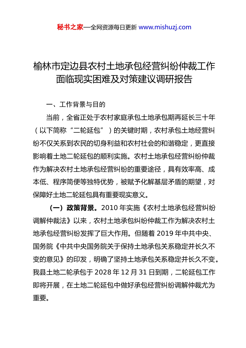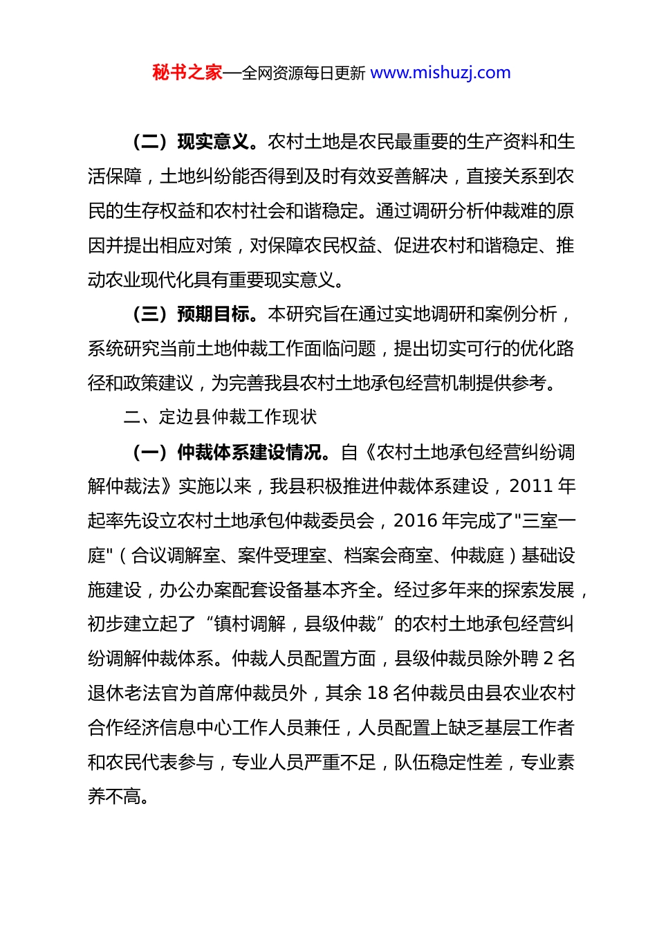 秘书之家—全网资源每日更新 www.mishuzj.com榆林市定边县农村土地承包经营纠纷仲裁工作面临现实困难及对策建议调研报告一、工作背景与目的当前,全省正处于农村家庭承包土地承包期再延长三十年(以下简称“二轮延包”)的关键时期,农村承包土地经营纠纷不仅关系到农民的切身利益和农村社会的和谐稳定,更直接影响着土地二轮延包的顺利实施。农村土地承包经营纠纷仲裁作为解决农村土地承包经营纠纷的重要途径,具有效率高、成本低、程序简便等独特优势,被赋予化解基层矛盾的期望,对保障好土地二轮延包具有重要现实意义。(一)政策背景。2010 年实施《农村土地承包经营纠纷调解仲裁法》以来,农村土地承包纠纷仲裁工作为解决农村土地承包经营纠纷发挥了巨大作用。但随着 2019 年中共中央、国务院《中共中央国务院关于保持土地承包关系稳定并长久不变的意见》的印发,明确了坚持土地承包关系稳定并长久不变。我县土地二轮承包于 2028 年 12 月 31 日到期,二轮延包工作即将开展,在土地二轮延包中做好承包经营纠纷调解仲裁尤为重要。秘书之家—全网资源每日更新 www.mishuzj.com(二)现实意义。农村土地是农民最重要的生产资料和生活保障,土地纠纷能否得到及时有效妥善解决,直接关系到农民的生存权益和农村社会和谐稳定。通过调研分析仲裁难的原因并提出相应对策,对保障农民权益、促进农村和谐稳定、推动农业现代化具有重要现实意义。(三)预期目标。本研究旨在通过实地调研和案例分析,系统研究当前土地仲裁工作面临问题,提出切实可行的优化路径和政策建议,为完善我县农村土地承包经营机制提供参考。二、定边县仲裁工作现状(一)仲裁体系建设情况。自《农村土地承包经营纠纷调解仲裁法》实施以来,我县积极推进仲裁体系建设,2011 年起率先设立农村土地承包仲裁委员会,2016 年完成了"三室一庭"(合议调解室、案件受理室、档案会商室、仲裁庭)基础设施建设,办公办案配套设备基本齐全。经过多年来的探索发展,初步建立起了“镇村调解,县级仲裁”的农村土地承包经营纠纷调解仲裁体系。仲裁人员配置方面,县级仲裁员除外聘 2 名退休老法官为首席仲裁员外,其余 18 名仲裁员由县农业农村合作经济信息中心工作人员兼任,人员配置上缺乏基层工作者和农民代表参与,专业人员严重不足,队伍稳定性差,专业素养不高。秘书之家—全网资源每日更新 www.mishuzj.com(二)仲裁案件受理情况。从案件数量看,2011 年至今,定边县(市、区)仲裁委员会共受理纠纷 370 余件,其中调解230 多件,裁决 140 多件,案件办理位居全省前列,榆林市首位。从案件类型分布看,农村土地承包经营纠纷主要集中在土地确权遗留问题、外嫁女土地权益、征地补偿分配、承包经营权及土地流转合同纠纷等方面。三、仲裁工作面临的主要困境(一)承包经营纠纷成因复杂裁决困难的问题。定边县地处陕西省西北角,地广人稀,耕地保有量大,人均耕地达到13.2 亩,土地承包管理粗放,由于一轮、二轮承包政策落地不实、承包档案严重缺失、确权遗留问题,加之近年来由于油气新能源开发、滩水地价值飙升等原因,导致土地承包经营纠纷层出不穷,矛盾异常突出,不仅申请仲裁数量大,而且由于成因复杂、证据缺失给仲裁造成较大困难。(二)程序衔接不畅和标准不统一的问题。一方面,仲裁与诉讼的衔接机制不健全,导致案件在处理过程中出现程序空转和资源浪费。定边县近年来裁决的案件中,当事人不服裁决,向县级人民法院提起诉讼,有很大部分被县级人民法院以受案范围等为由,裁定驳回诉讼请求,导致土地承包纠纷长期无法得到有效化解。另一方面,仲裁机构与法院在裁判标准上存在秘书之家—全网资源每日更新 www.mishuzj.com较大差异。农村土地承包跨度近四十年,纠纷类型复杂多样,由于法律理解和政策把握的不同,仲裁裁决和法院判决往往出现分歧,导致同案不同判(裁决)。(三)仲裁工作面临专业人才缺乏的问题。自 2000 年机构改革后,县级农经机构编制缩减,乡镇农经机构撤销,县级农经工作人员承担兼任仲裁员、调解员,存在人力不足、能力不够,难以胜任日益复杂的仲裁工作。同时兼...