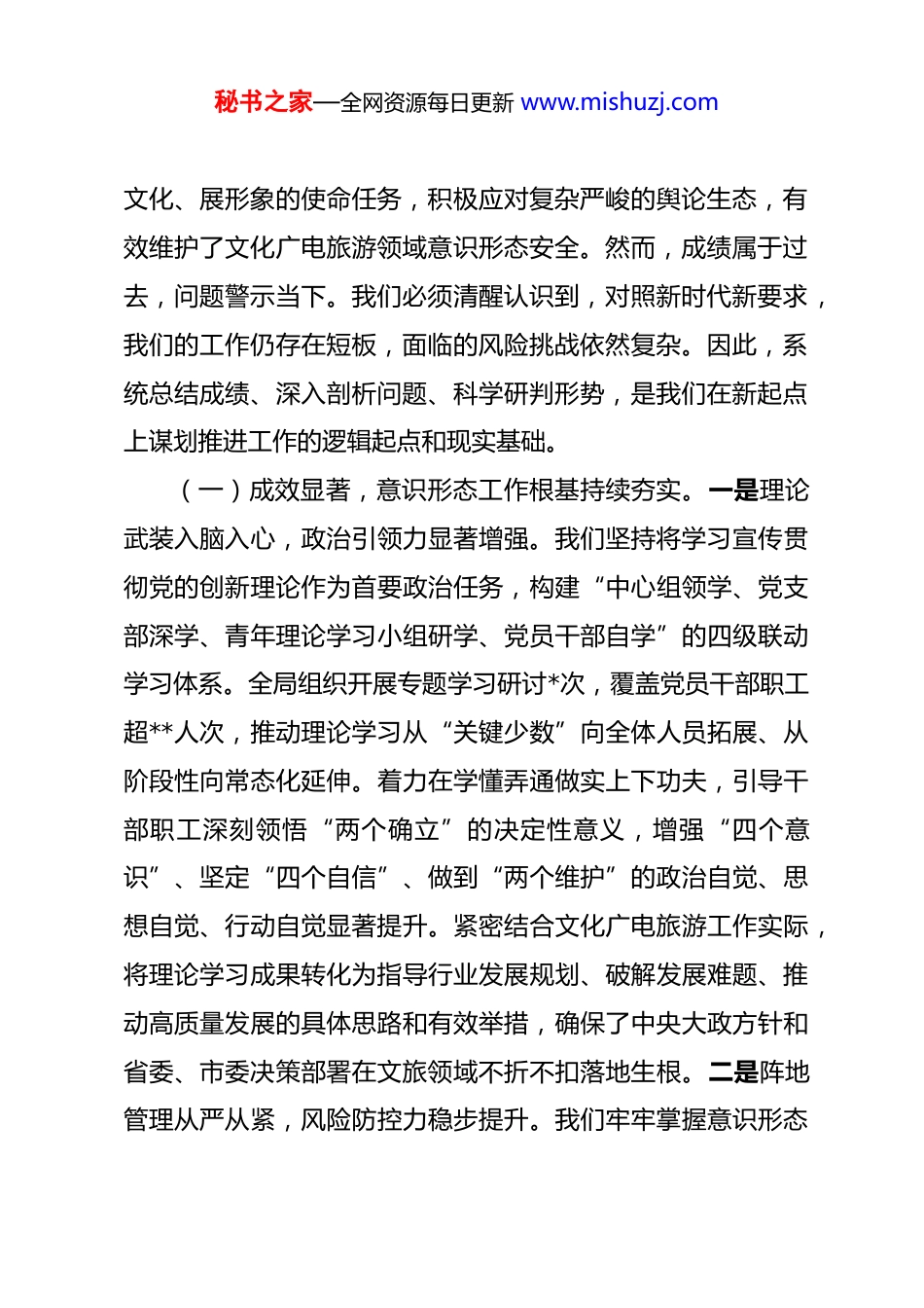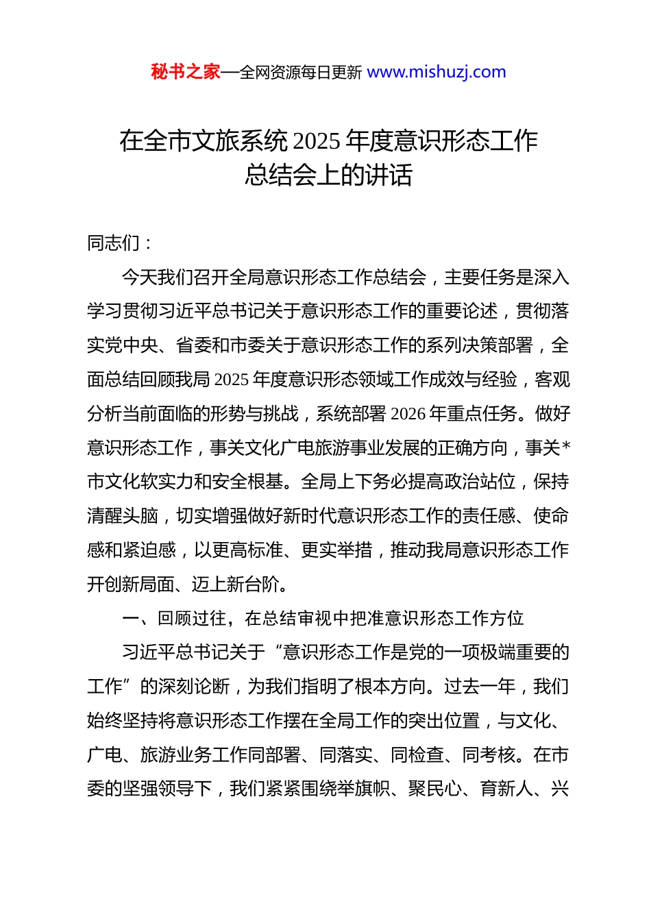 秘书之家—全网资源每日更新 www.mishuzj.com在全市文旅系统 2025 年度意识形态工作总结会上的讲话 同志们:今天我们召开全局意识形态工作总结会,主要任务是深入学习贯彻习近平总书记关于意识形态工作的重要论述,贯彻落实党中央、省委和市委关于意识形态工作的系列决策部署,全面总结回顾我局 2025 年度意识形态领域工作成效与经验,客观分析当前面临的形势与挑战,系统部署 2026 年重点任务。做好意识形态工作,事关文化广电旅游事业发展的正确方向,事关*市文化软实力和安全根基。全局上下务必提高政治站位,保持清醒头脑,切实增强做好新时代意识形态工作的责任感、使命感和紧迫感,以更高标准、更实举措,推动我局意识形态工作开创新局面、迈上新台阶。一、回顾过往,在总结审视中把准意识形态工作方位习近平总书记关于“意识形态工作是党的一项极端重要的工作”的深刻论断,为我们指明了根本方向。过去一年,我们始终坚持将意识形态工作摆在全局工作的突出位置,与文化、广电、旅游业务工作同部署、同落实、同检查、同考核。在市委的坚强领导下,我们紧紧围绕举旗帜、聚民心、育新人、兴秘书之家—全网资源每日更新 www.mishuzj.com文化、展形象的使命任务,积极应对复杂严峻的舆论生态,有效维护了文化广电旅游领域意识形态安全。然而,成绩属于过去,问题警示当下。我们必须清醒认识到,对照新时代新要求,我们的工作仍存在短板,面临的风险挑战依然复杂。因此,系统总结成绩、深入剖析问题、科学研判形势,是我们在新起点上谋划推进工作的逻辑起点和现实基础。(一)成效显著,意识形态工作根基持续夯实。一是理论武装入脑入心,政治引领力显著增强。我们坚持将学习宣传贯彻党的创新理论作为首要政治任务,构建“中心组领学、党支部深学、青年理论学习小组研学、党员干部自学”的四级联动学习体系。全局组织开展专题学习研讨*次,覆盖党员干部职工超**人次,推动理论学习从“关键少数”向全体人员拓展、从阶段性向常态化延伸。着力在学懂弄通做实上下功夫,引导干部职工深刻领悟“两个确立”的决定性意义,增强“四个意识”、坚定“四个自信”、做到“两个维护”的政治自觉、思想自觉、行动自觉显著提升。紧密结合文化广电旅游工作实际,将理论学习成果转化为指导行业发展规划、破解发展难题、推动高质量发展的具体思路和有效举措,确保了中央大政方针和省委、市委决策部署在文旅领域不折不扣落地生根。二是阵地管理从严从紧,风险防控力稳步提升。我们牢牢掌握意识形态秘书之家—全网资源每日更新 www.mishuzj.com工作领导权管理权话语权,严格落实主管主办和属地管理原则。对所属图书馆、文化馆、博物馆、美术馆等公共文化场馆,以及广播电视台、融媒体中心、各类节庆活动、文艺演出、展览展示、旅游推介等线上线下阵地,实施全流程、全要素、全覆盖的内容审核与风险排查机制。全年累计开展专项巡查检查*次,发现并督促整改潜在风险点*个。加强广播电视播出安全、网络视听节目内容监管,确保播出传输安全和内容导向正确。强化对各类研讨会、讲座、论坛的审批管理,规范合作项目意识形态审查流程,守好了各类意识形态阵地,未发生重大意识形态安全事件,行业整体态势平稳可控。三是行业引导有力有效,价值传播力不断彰显。我们充分发挥文化广电旅游行业浸润人心、成风化俗的独特优势,将主流价值融入文艺创作、公共服务、广电节目、旅游发展各环节。围绕重大主题,策划推出一批弘扬主旋律、传播正能量的精品力作和文旅活动。公共文化服务机构年均开展社会主义核心价值观主题教育活动超**场次,服务群众超*万人次。广电媒体精心制作播出一系列专题节目、公益广告,生动讲好*故事。在旅游线路设计、景区讲解、宣传推广中融入红色文化、优秀传统文化和时代精神内涵,推动文旅融合成为传播先进文化、弘扬时代新风的重要载体。通过潜移默化的引导,行业在巩固壮大积极健康向上的主流思想舆论秘书之家—全网资源每日更新 www.mishuzj.com方面发挥了积极作用。(二)正视不足,意识形态工作短板依然存在。一是责任压力传导存在“温差”,协同落实机制有待强化。尽管...