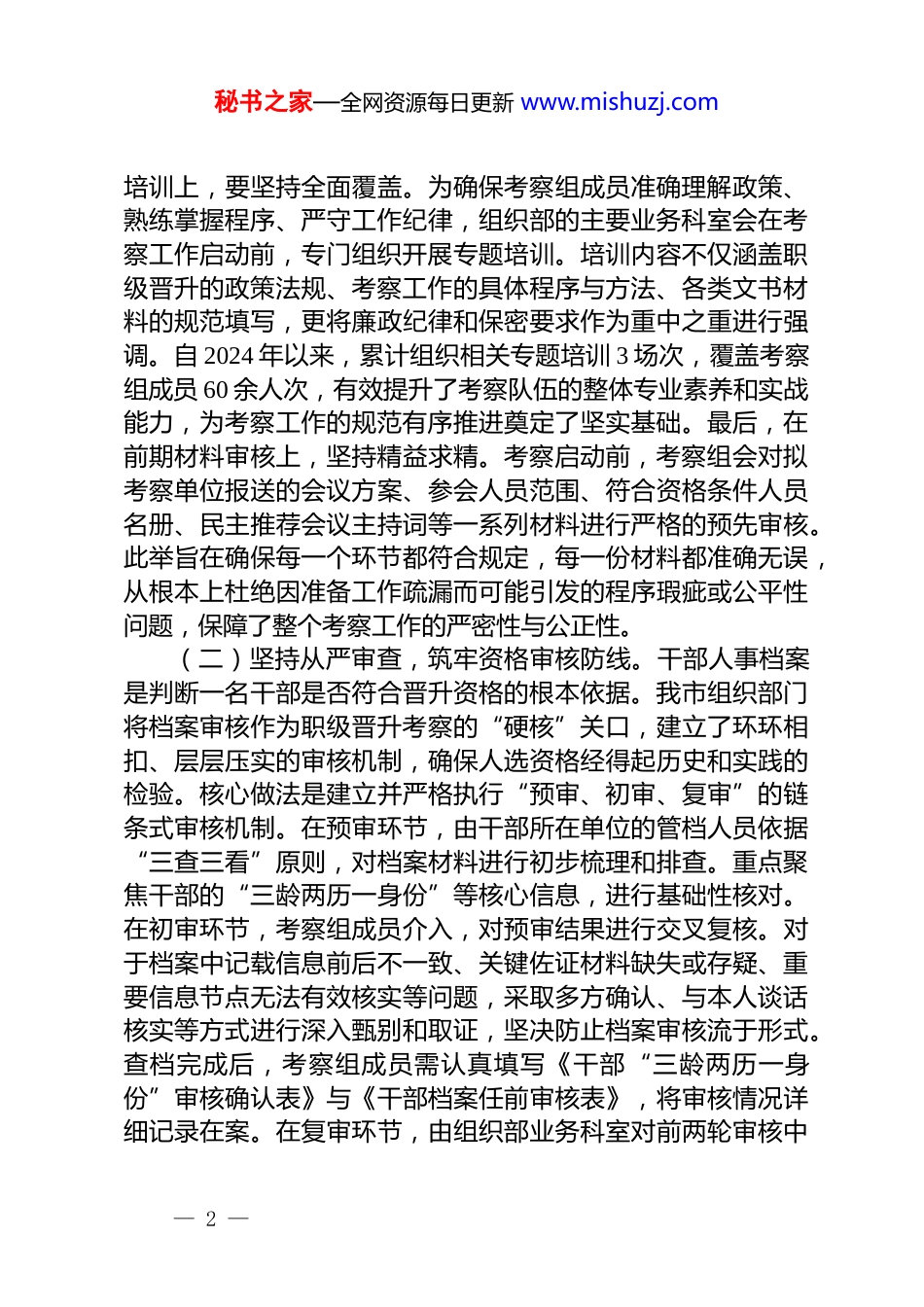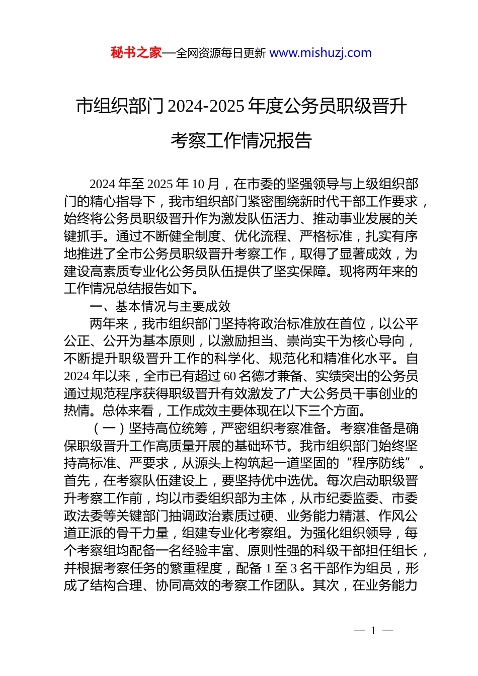 秘书之家—全网资源每日更新 www.mishuzj.com市组织部门 2024-2025 年度公务员职级晋升考察工作情况报告2024 年至 2025 年 10 月,在市委的坚强领导与上级组织部门的精心指导下,我市组织部门紧密围绕新时代干部工作要求,始终将公务员职级晋升作为激发队伍活力、推动事业发展的关键抓手。通过不断健全制度、优化流程、严格标准,扎实有序地推进了全市公务员职级晋升考察工作,取得了显著成效,为建设高素质专业化公务员队伍提供了坚实保障。现将两年来的工作情况总结报告如下。一、基本情况与主要成效两年来,我市组织部门坚持将政治标准放在首位,以公平公正、公开为基本原则,以激励担当、崇尚实干为核心导向,不断提升职级晋升工作的科学化、规范化和精准化水平。自2024 年以来,全市已有超过 60 名德才兼备、实绩突出的公务员通过规范程序获得职级晋升有效激发了广大公务员干事创业的热情。总体来看,工作成效主要体现在以下三个方面。(一)坚持高位统筹,严密组织考察准备。考察准备是确保职级晋升工作高质量开展的基础环节。我市组织部门始终坚持高标准、严要求,从源头上构筑起一道坚固的“程序防线”。首先,在考察队伍建设上,要坚持优中选优。每次启动职级晋升考察工作前,均以市委组织部为主体,从市纪委监委、市委政法委等关键部门抽调政治素质过硬、业务能力精湛、作风公道正派的骨干力量,组建专业化考察组。为强化组织领导,每个考察组均配备一名经验丰富、原则性强的科级干部担任组长,并根据考察任务的繁重程度,配备 1 至 3 名干部作为组员,形成了结构合理、协同高效的考察工作团队。其次,在业务能力— 1 —秘书之家—全网资源每日更新 www.mishuzj.com培训上,要坚持全面覆盖。为确保考察组成员准确理解政策、熟练掌握程序、严守工作纪律,组织部的主要业务科室会在考察工作启动前,专门组织开展专题培训。培训内容不仅涵盖职级晋升的政策法规、考察工作的具体程序与方法、各类文书材料的规范填写,更将廉政纪律和保密要求作为重中之重进行强调。自 2024 年以来,累计组织相关专题培训 3 场次,覆盖考察组成员 60 余人次,有效提升了考察队伍的整体专业素养和实战能力,为考察工作的规范有序推进奠定了坚实基础。最后,在前期材料审核上,坚持精益求精。考察启动前,考察组会对拟考察单位报送的会议方案、参会人员范围、符合资格条件人员名册、民主推荐会议主持词等一系列材料进行严格的预先审核。此举旨在确保每一个环节都符合规定,每一份材料都准确无误,从根本上杜绝因准备工作疏漏而可能引发的程序瑕疵或公平性问题,保障了整个考察工作的严密性与公正性。(二)坚持从严审查,筑牢资格审核防线。干部人事档案是判断一名干部是否符合晋升资格的根本依据。我市组织部门将档案审核作为职级晋升考察的“硬核”关口,建立了环环相扣、层层压实的审核机制,确保人选资格经得起历史和实践的检验。核心做法是建立并严格执行“预审、初审、复审”的链条式审核机制。在预审环节,由干部所在单位的管档人员依据“三查三看”原则,对档案材料进行初步梳理和排查。重点聚焦干部的“三龄两历一身份”等核心信息,进行基础性核对。在初审环节,考察组成员介入,对预审结果进行交叉复核。对于档案中记载信息前后不一致、关键佐证材料缺失或存疑、重要信息节点无法有效核实等问题,采取多方确认、与本人谈话核实等方式进行深入甄别和取证,坚决防止档案审核流于形式。查档完成后,考察组成员需认真填写《干部“三龄两历一身份”审核确认表》与《干部档案任前审核表》,将审核情况详细记录在案。在复审环节,由组织部业务科室对前两轮审核中— 2 —秘书之家—全网资源每日更新 www.mishuzj.com发现的问题进行集中研判和最终确认。对于经过反复核查,档案信息的真实性、准确性和完整性依然存疑,无法做出明确结论的,坚决不予提交会议讨论。这种“凡疑必核、凡缺必补、凡错必纠”的严谨态度,有效维护了职级晋升工作的严肃性。自 2025 年以来,已有 19 名同志因个人档案信息存疑或相关材料缺失,经研究决定暂缓其职级晋升程序,彰显了组...