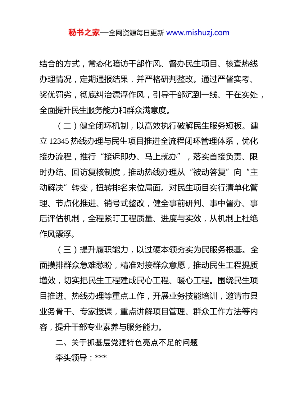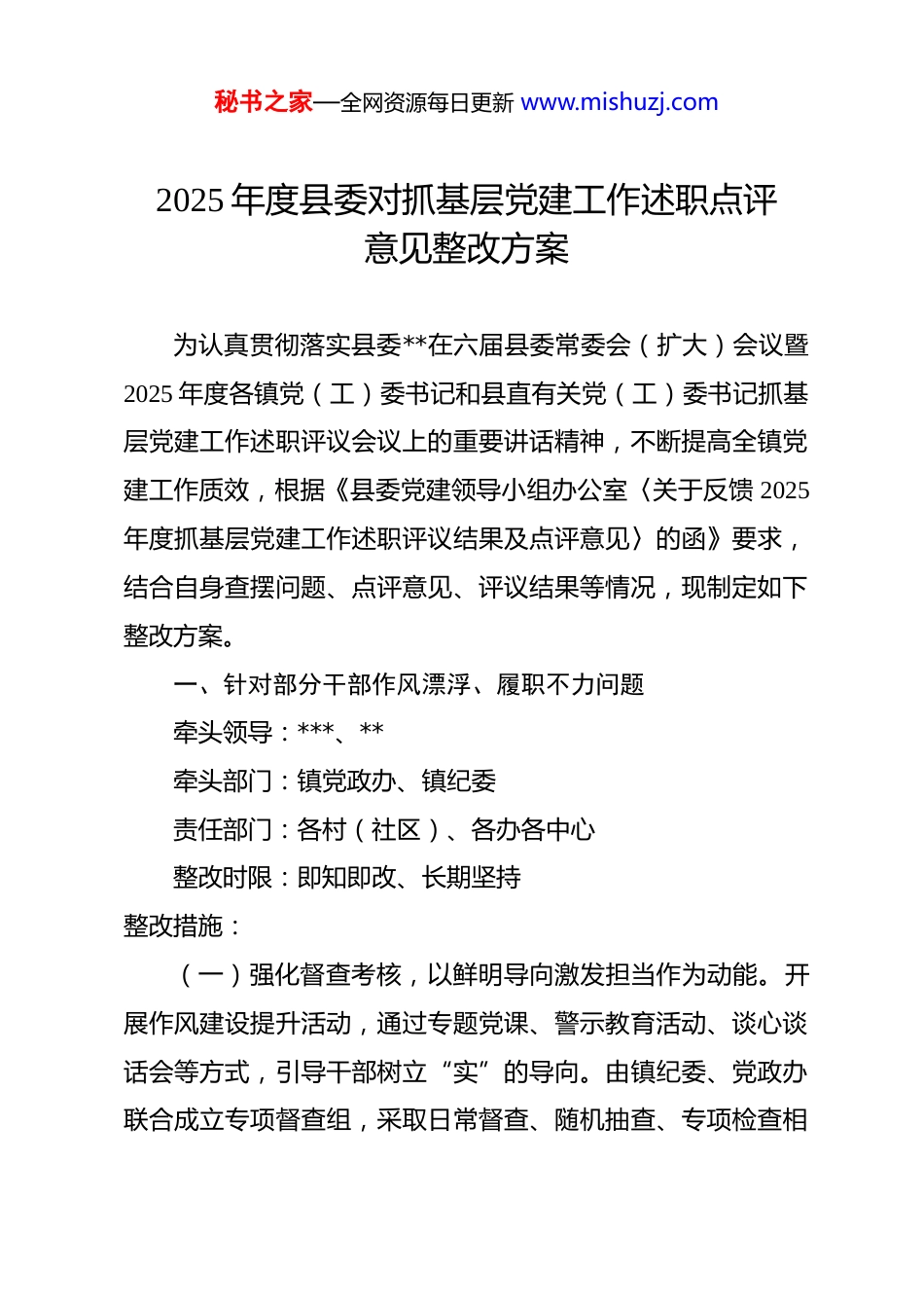 秘书之家—全网资源每日更新 www.mishuzj.com2025 年度县委对抓基层党建工作述职点评意见整改方案 为认真贯彻落实县委**在六届县委常委会(扩大)会议暨2025 年度各镇党(工)委书记和县直有关党(工)委书记抓基层党建工作述职评议会议上的重要讲话精神,不断提高全镇党建工作质效,根据《县委党建领导小组办公室〈关于反馈 2025年度抓基层党建工作述职评议结果及点评意见〉的函》要求,结合自身查摆问题、点评意见、评议结果等情况,现制定如下整改方案。一、针对部分干部作风漂浮、履职不力问题牵头领导:***、**牵头部门:镇党政办、镇纪委责任部门:各村(社区)、各办各中心整改时限:即知即改、长期坚持整改措施:(一)强化督查考核,以鲜明导向激发担当作为动能。开展作风建设提升活动,通过专题党课、警示教育活动、谈心谈话会等方式,引导干部树立“实”的导向。由镇纪委、党政办联合成立专项督查组,采取日常督查、随机抽查、专项检查相秘书之家—全网资源每日更新 www.mishuzj.com结合的方式,常态化暗访干部作风、督办民生项目、核查热线办理情况,定期通报结果,并严格研判整改。通过严督实考、奖优罚劣,彻底纠治漂浮作风,引导干部沉到一线、干在实处,全面提升民生服务能力和群众满意度。(二)健全闭环机制,以高效执行破解民生服务短板。建立 12345 热线办理与民生项目推进全流程闭环管理体系,优化接办流程,推行“接诉即办、马上就办”,落实首接负责、限时办结、回访复核制度,推动热线办理从“被动答复”向“主动解决”转变,扭转排名末位局面。对民生项目实行清单化管理、节点化推进、销号式整改,健全事前研判、事中督办、事后评估机制,全程紧盯工程质量、进度与实效,从机制上杜绝作风漂浮。(三)提升履职能力,以过硬本领夯实为民服务根基。全面摸排群众急难愁盼,精准对接群众意愿,推动民生工程提质增效,切实把民生工程建成民心工程、暖心工程。围绕民生项目推进、热线办理等重点工作,开展业务技能培训,邀请市县业务骨干、专家授课,重点讲解项目管理、群众工作方法等内容,提升干部专业素养与服务能力。二、关于抓基层党建特色亮点不足的问题牵头领导:***秘书之家—全网资源每日更新 www.mishuzj.com牵头部门:镇党建办责任部门:各村(社区)党总支、支部,机关党支部整改时限:即知即改、长期坚持整改措施:(一)强化党建品牌打造,提升工作辨识度。围绕中心工作和本镇实际,系统梳理党建资源优势,结合**特色与产业基础,明确党建品牌创建主题与方向,打造“党建+乡村治理”“党建+农文旅融合”等特色党建品牌。通过常态化培育、精细化打造,形成可复制、可推广的基层党建特色做法,改变党建工作“平推平拥、亮点不亮”的局面。(二)抓实星级阵地提质升级,增强示范引领力。镇党建办深入为干屏村调研,梳理阵地现有资源、师资力量、培训需求等情况,对照市级党员干部教育培训星级阵地评定标准,优化阵地功能、丰富教学内容、创新培训形式,每年开发不少于一门高品质特色党课,邀请本土致富带头人、优秀基层干部授课,增强培训的针对性和吸引力。同时整合特色文化资源、乡村振兴实践基地等,丰富阵地培训载体,切实把阵地优势转化为党建亮点和工作实效。(三)健全总结宣传机制,扩大党建影响力。建立党建工作定期梳理、提炼总结、对外宣传机制,及时挖掘优秀基层党秘书之家—全网资源每日更新 www.mishuzj.com组织典型案例、经验做法和优秀党员先进事迹,通过上报宣传信息、“****”视频号等多渠道加强宣传展示,推动基层党建从“做了”向“做好、做特、做优”转变,不断提升**镇党建工作知名度和影响力。三、关于农文旅融合发展后劲不足的问题牵头领导:**、**牵头部门:镇党建办、镇农业综合服务中心责任部门:各村(社区)整改时限:即知即改、长期坚持整改措施:(一)盘活资源要素,激发融合活力。统筹盐、宋、桃核心要素,构建“赏花+文旅+产业”农文旅融合模式,重塑宋文化体验与消费新场景。配合县文化广电体育旅游局,加快推进**遗址公园提档升级。对镇域范围内的民宿进行全面摸排,实现“一宿一档”动态管理,盘活...