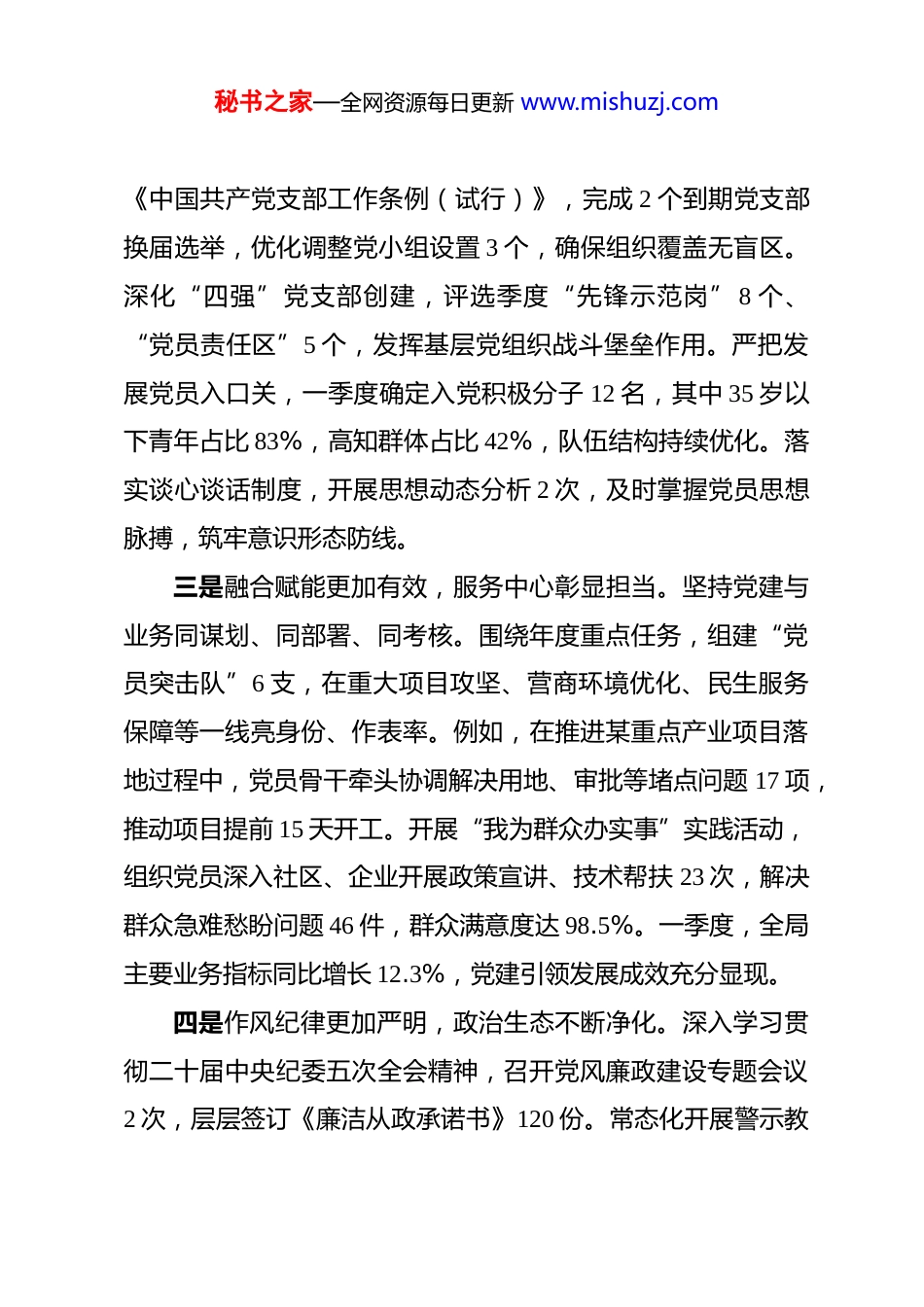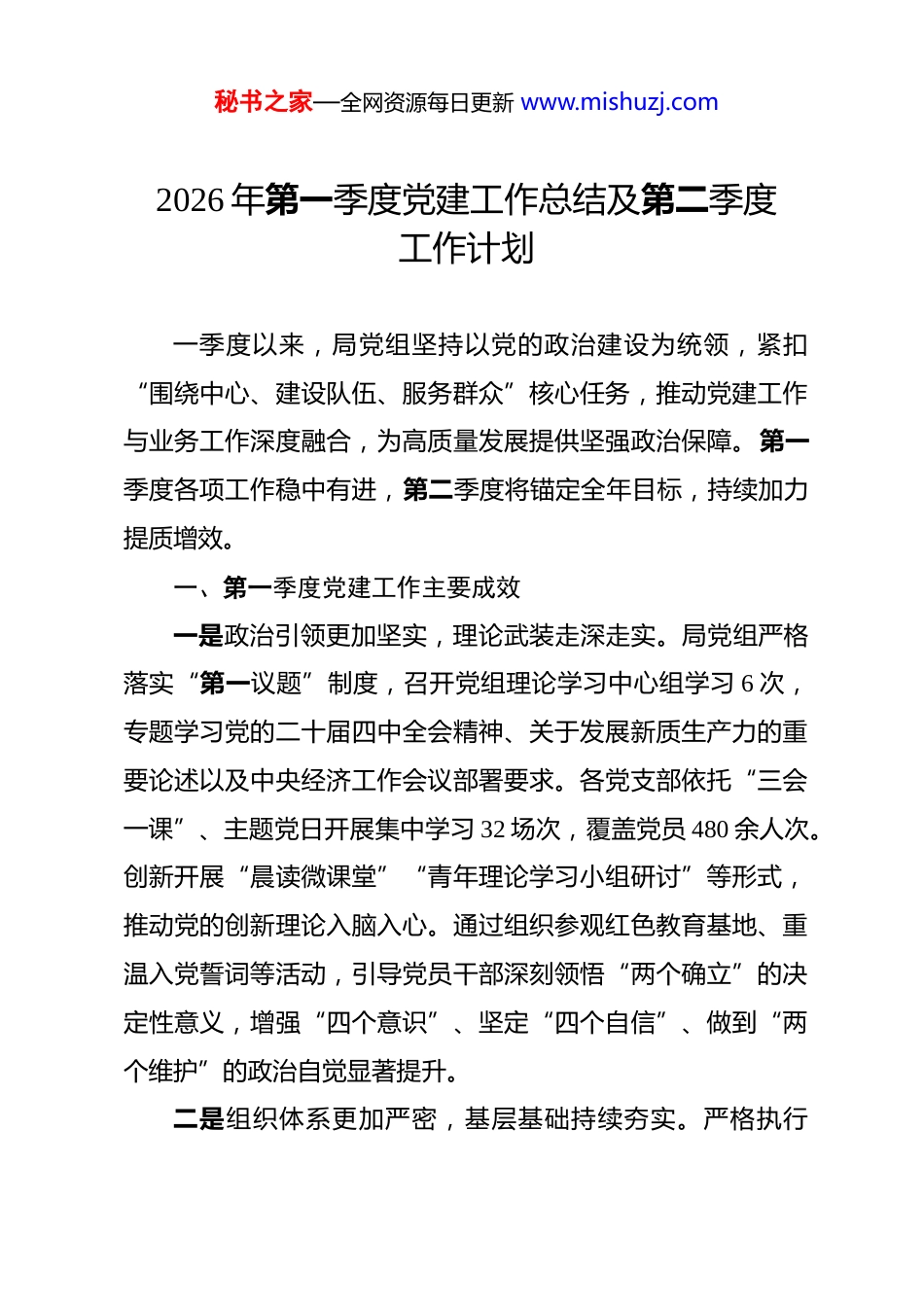 秘书之家—全网资源每日更新 www.mishuzj.com2026 年第一季度党建工作总结及第二季度工作计划 一季度以来,局党组坚持以党的政治建设为统领,紧扣“围绕中心、建设队伍、服务群众”核心任务,推动党建工作与业务工作深度融合,为高质量发展提供坚强政治保障。第一季度各项工作稳中有进,第二季度将锚定全年目标,持续加力提质增效。一、第一季度党建工作主要成效一是政治引领更加坚实,理论武装走深走实。局党组严格落实“第一议题”制度,召开党组理论学习中心组学习 6 次,专题学习党的二十届四中全会精神、关于发展新质生产力的重要论述以及中央经济工作会议部署要求。各党支部依托“三会一课”、主题党日开展集中学习 32 场次,覆盖党员 480 余人次。创新开展“晨读微课堂”“青年理论学习小组研讨”等形式,推动党的创新理论入脑入心。通过组织参观红色教育基地、重温入党誓词等活动,引导党员干部深刻领悟“两个确立”的决定性意义,增强“四个意识”、坚定“四个自信”、做到“两个维护”的政治自觉显著提升。二是组织体系更加严密,基层基础持续夯实。严格执行秘书之家—全网资源每日更新 www.mishuzj.com《中国共产党支部工作条例(试行)》,完成 2 个到期党支部换届选举,优化调整党小组设置 3 个,确保组织覆盖无盲区。深化“四强”党支部创建,评选季度“先锋示范岗” 8 个、“党员责任区”5 个,发挥基层党组织战斗堡垒作用。严把发展党员入口关,一季度确定入党积极分子 12 名,其中 35 岁以下青年占比 83%,高知群体占比 42%,队伍结构持续优化。落实谈心谈话制度,开展思想动态分析 2 次,及时掌握党员思想脉搏,筑牢意识形态防线。三是融合赋能更加有效,服务中心彰显担当。坚持党建与业务同谋划、同部署、同考核。围绕年度重点任务,组建“党员突击队”6 支,在重大项目攻坚、营商环境优化、民生服务保障等一线亮身份、作表率。例如,在推进某重点产业项目落地过程中,党员骨干牵头协调解决用地、审批等堵点问题 17 项,推动项目提前 15 天开工。开展“我为群众办实事”实践活动,组织党员深入社区、企业开展政策宣讲、技术帮扶 23 次,解决群众急难愁盼问题 46 件,群众满意度达 98.5%。一季度,全局主要业务指标同比增长 12.3%,党建引领发展成效充分显现。四是作风纪律更加严明,政治生态不断净化。深入学习贯彻二十届中央纪委五次全会精神,召开党风廉政建设专题会议2 次,层层签订《廉洁从政承诺书》120 份。常态化开展警示教秘书之家—全网资源每日更新 www.mishuzj.com育,组织观看专题片、通报典型案例 8 次,用“身边事”警醒“身边人”。紧盯重点领域和关键岗位,开展廉政风险排查,修订完善内控制度 5 项。畅通监督渠道,设立线上线下举报平台,一季度受理群众反映问题线索 3 件,均已按程序核查处置。干部作风持续向好,“勤快严实精细廉”成为普遍自觉。二、当前工作中存在的主要问题在肯定成绩的同时,也要清醒看到短板不足。一是党建业务融合的深度有待拓展。个别支部仍存在“两张皮”现象,党建活动与业务难点结合不够紧密,载体创新不足,实效性有待提升。二是党员教育管理的精准性有待加强。针对不同岗位、不同年龄段党员的差异化教育模式探索不够,部分年轻党员理论学习的主动性、系统性需进一步激发。三是党建品牌影响力有待扩大。虽有初步探索,但特色亮点不够突出,可复制、可推广的经验做法总结提炼不足,示范带动效应尚未充分释放。三、第二季度党建工作重点计划一是聚焦凝心铸魂,在深化理论武装上再发力。把学习党的二十届四中全会精神作为首要政治任务,精心组织专题读书班、辅导报告会,引导党员干部深刻把握其核心要义与实践要求。结合本局职能,围绕发展新质生产力、构建高水平社会主义市场经济体制等重大部署,开展“学思践悟·赋能发展”大讨秘书之家—全网资源每日更新 www.mishuzj.com论,推动学习成果转化为谋划工作的思路、促进发展的举措。强化青年理论武装,举办“青马工程”培训班,引导青年党员在改革一线、创新前沿经风雨、见世面、壮筋骨。二是聚焦强基固本,在建强...
