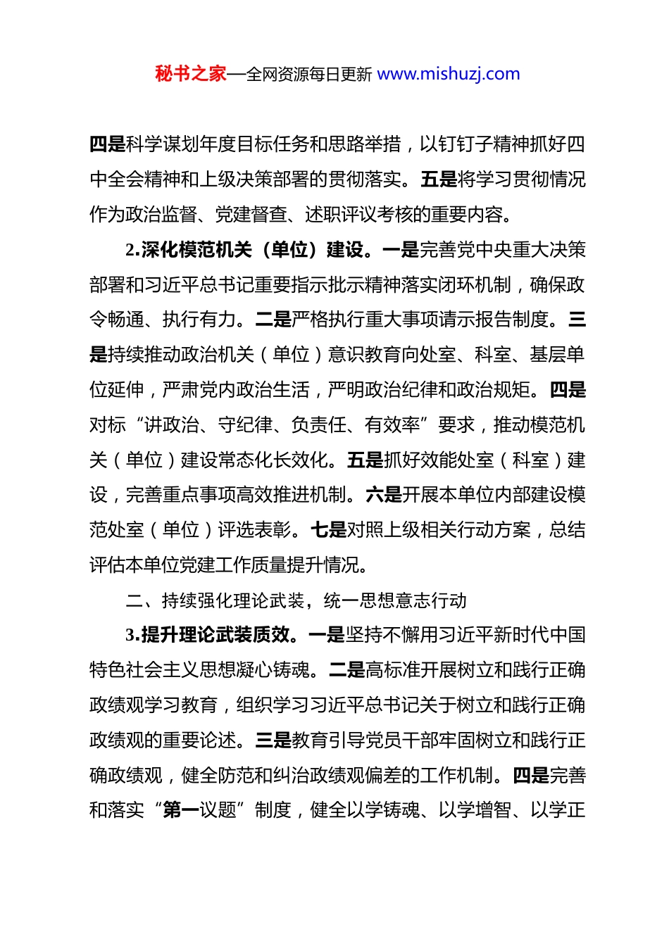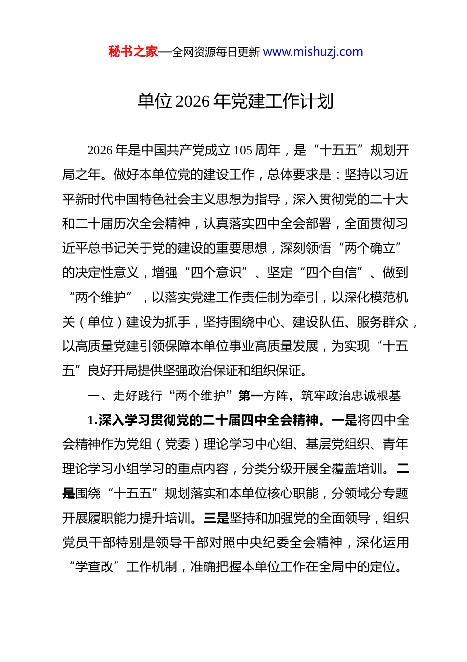 秘书之家—全网资源每日更新 www.mishuzj.com单位 2026 年党建工作计划 2026 年是中国共产党成立 105 周年,是“十五五”规划开局之年。做好本单位党的建设工作,总体要求是:坚持以习近平新时代中国特色社会主义思想为指导,深入贯彻党的二十大和二十届历次全会精神,认真落实四中全会部署,全面贯彻习近平总书记关于党的建设的重要思想,深刻领悟“两个确立”的决定性意义,增强“四个意识”、坚定“四个自信”、做到“两个维护”,以落实党建工作责任制为牵引,以深化模范机关(单位)建设为抓手,坚持围绕中心、建设队伍、服务群众,以高质量党建引领保障本单位事业高质量发展,为实现“十五五”良好开局提供坚强政治保证和组织保证。一、走好践行“两个维护”第一方阵,筑牢政治忠诚根基1.深入学习贯彻党的二十届四中全会精神。一是将四中全会精神作为党组(党委)理论学习中心组、基层党组织、青年理论学习小组学习的重点内容,分类分级开展全覆盖培训。二是围绕“十五五”规划落实和本单位核心职能,分领域分专题开展履职能力提升培训。三是坚持和加强党的全面领导,组织党员干部特别是领导干部对照中央纪委全会精神,深化运用“学查改”工作机制,准确把握本单位工作在全局中的定位。秘书之家—全网资源每日更新 www.mishuzj.com四是科学谋划年度目标任务和思路举措,以钉钉子精神抓好四中全会精神和上级决策部署的贯彻落实。五是将学习贯彻情况作为政治监督、党建督查、述职评议考核的重要内容。2.深化模范机关(单位)建设。一是完善党中央重大决策部署和习近平总书记重要指示批示精神落实闭环机制,确保政令畅通、执行有力。二是严格执行重大事项请示报告制度。三是持续推动政治机关(单位)意识教育向处室、科室、基层单位延伸,严肃党内政治生活,严明政治纪律和政治规矩。四是对标“讲政治、守纪律、负责任、有效率”要求,推动模范机关(单位)建设常态化长效化。五是抓好效能处室(科室)建设,完善重点事项高效推进机制。六是开展本单位内部建设模范处室(单位)评选表彰。七是对照上级相关行动方案,总结评估本单位党建工作质量提升情况。二、持续强化理论武装,统一思想意志行动3.提升理论武装质效。一是坚持不懈用习近平新时代中国特色社会主义思想凝心铸魂。二是高标准开展树立和践行正确政绩观学习教育,组织学习习近平总书记关于树立和践行正确政绩观的重要论述。三是教育引导党员干部牢固树立和践行正确政绩观,健全防范和纠治政绩观偏差的工作机制。四是完善和落实“第一议题”制度,健全以学铸魂、以学增智、以学正秘书之家—全网资源每日更新 www.mishuzj.com风、以学促干长效机制。五是在全面系统学的基础上,重点学习习近平总书记关于本领域本行业的重要讲话和重要指示精神。六是着力提高党组(党委)理论学习中心组集体研讨质量。七是围绕把握新时代党建工作规律、深化模范单位建设、激发干部队伍活力等课题开展研究。4.完善党员干部基本培训机制。一是落实健全干部、党员基本培训机制的要求,制定本单位实施方案。二是围绕学习贯彻习近平新时代中国特色社会主义思想,常态化开展党员集中学习培训。三是建好用好线上学习平台,推动优质培训资源下沉。四是推动中层干部、业务骨干基本培训全覆盖,探索关键岗位人员专项培训。五是充分发挥本单位党校(或培训中心)在基本培训中的主渠道作用。5.加强年轻干部教育引领。一是深入实施年轻干部教育引领计划。二是选树青年理论学习标兵,办好青年学习交流活动。三是持续深化党性教育和优良传统教育,开展“传承红色基因、担当时代使命”主题党日。四是深化基层调研实践和“我为群众办实事”活动,引导年轻干部在实践中增长才干。6.落实意识形态工作责任制。一是压实主管主办责任,加强对本单位网站、新媒体平台、内部刊物及讲座、论坛等意识形态阵地的建设和管理。二是坚持正确舆论导向,精准有效开秘书之家—全网资源每日更新 www.mishuzj.com展主题宣传、政策宣传、成就宣传、典型宣传。三是带头贯彻落实《中国共产党思想政治工作条例》,加强和改进思想政治工作。四是完善干部职工思想动态定...
