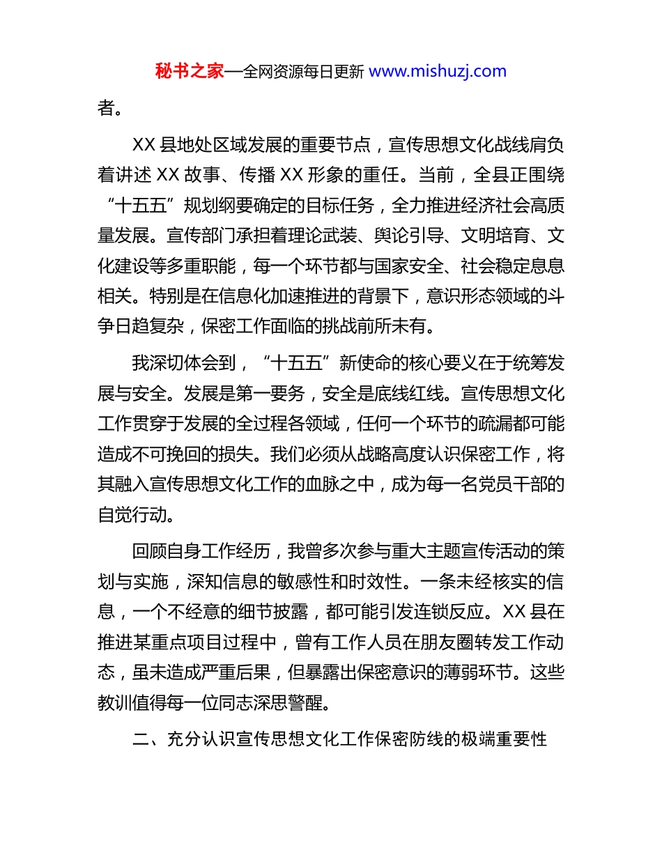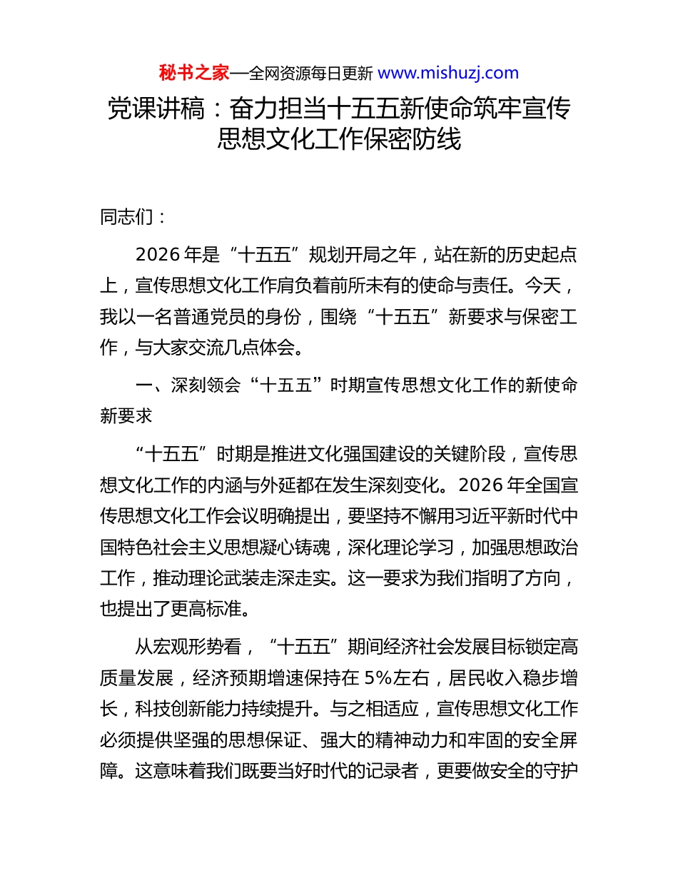 秘书之家—全网资源每日更新 www.mishuzj.com党课讲稿:奋力担当十五五新使命筑牢宣传思想文化工作保密防线同志们:2026 年是“十五五”规划开局之年,站在新的历史起点上,宣传思想文化工作肩负着前所未有的使命与责任。今天,我以一名普通党员的身份,围绕“十五五”新要求与保密工作,与大家交流几点体会。一、深刻领会“十五五”时期宣传思想文化工作的新使命新要求“十五五”时期是推进文化强国建设的关键阶段,宣传思想文化工作的内涵与外延都在发生深刻变化。2026 年全国宣传思想文化工作会议明确提出,要坚持不懈用习近平新时代中国特色社会主义思想凝心铸魂,深化理论学习,加强思想政治工作,推动理论武装走深走实。这一要求为我们指明了方向,也提出了更高标准。从宏观形势看,“十五五”期间经济社会发展目标锁定高质量发展,经济预期增速保持在 5%左右,居民收入稳步增长,科技创新能力持续提升。与之相适应,宣传思想文化工作必须提供坚强的思想保证、强大的精神动力和牢固的安全屏障。这意味着我们既要当好时代的记录者,更要做安全的守护秘书之家—全网资源每日更新 www.mishuzj.com者。XX 县地处区域发展的重要节点,宣传思想文化战线肩负着讲述 XX 故事、传播 XX 形象的重任。当前,全县正围绕“十五五”规划纲要确定的目标任务,全力推进经济社会高质量发展。宣传部门承担着理论武装、舆论引导、文明培育、文化建设等多重职能,每一个环节都与国家安全、社会稳定息息相关。特别是在信息化加速推进的背景下,意识形态领域的斗争日趋复杂,保密工作面临的挑战前所未有。我深切体会到,“十五五”新使命的核心要义在于统筹发展与安全。发展是第一要务,安全是底线红线。宣传思想文化工作贯穿于发展的全过程各领域,任何一个环节的疏漏都可能造成不可挽回的损失。我们必须从战略高度认识保密工作,将其融入宣传思想文化工作的血脉之中,成为每一名党员干部的自觉行动。回顾自身工作经历,我曾多次参与重大主题宣传活动的策划与实施,深知信息的敏感性和时效性。一条未经核实的信息,一个不经意的细节披露,都可能引发连锁反应。XX 县在推进某重点项目过程中,曾有工作人员在朋友圈转发工作动态,虽未造成严重后果,但暴露出保密意识的薄弱环节。这些教训值得每一位同志深思警醒。二、充分认识宣传思想文化工作保密防线的极端重要性秘书之家—全网资源每日更新 www.mishuzj.com保密工作是国家安全的基石,是机关运转的要害,更是宣传思想文化战线的生命线。2026 年 2 月召开的市委宣传部保密工作领导小组(扩大)会议强调,要依法治密、提升保密效能、抓好保密教育、强化日常管理,这些要求具有很强的针对性和指导性。从历史维度看,保密工作始终是党的优良传统和政治优势。革命战争年代,无数先烈用生命守护党的机密,铸就了永不褪色的红色保密基因。和平建设时期,保密工作依然是维护国家安全的重要保障。进入新时代,信息化浪潮汹涌而至,窃密与反窃密的斗争从未停歇,保密工作面临的形势更加严峻。宣传思想文化工作涉及意识形态、舆论导向、文化传承等核心领域,信息敏感度高、影响面广。一份未公开的政策文件、一场正在筹备的重大活动、一条待发布的新闻稿件,都承载着重要的政治意义和社会价值。一旦泄露,轻则影响工作推进,重则危及国家安全和社会稳定。从个人认识出发,我深感保密工作与党性修养密不可分。保密意识强弱,直接反映党员干部的政治觉悟和纪律观念。一个对党忠诚、党性坚定的党员干部,必然会把保守党的机密视为政治责任,像珍惜生命一样严守秘密。反观一些泄密案件,根源往往在于当事人党性不纯、纪律松弛,把保密规定当作耳旁风,把组织提醒当作走过场。秘书之家—全网资源每日更新 www.mishuzj.comXX 县委宣传部在日常工作中形成了一套保密管理制度,包括涉密文件登记传阅、信息发布“三审三校”、涉密载体规范管理等。制度的生命力在于执行,执行的保障在于每一名党员干部的自觉。我曾目睹个别同志在微信工作群中讨论涉密事项,有人将工作文件拍照留存手机,这些看似不经意的行为,实则埋下了重大隐患。从全国范围看,202...