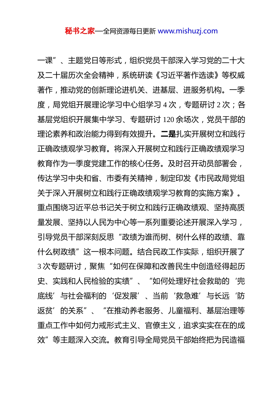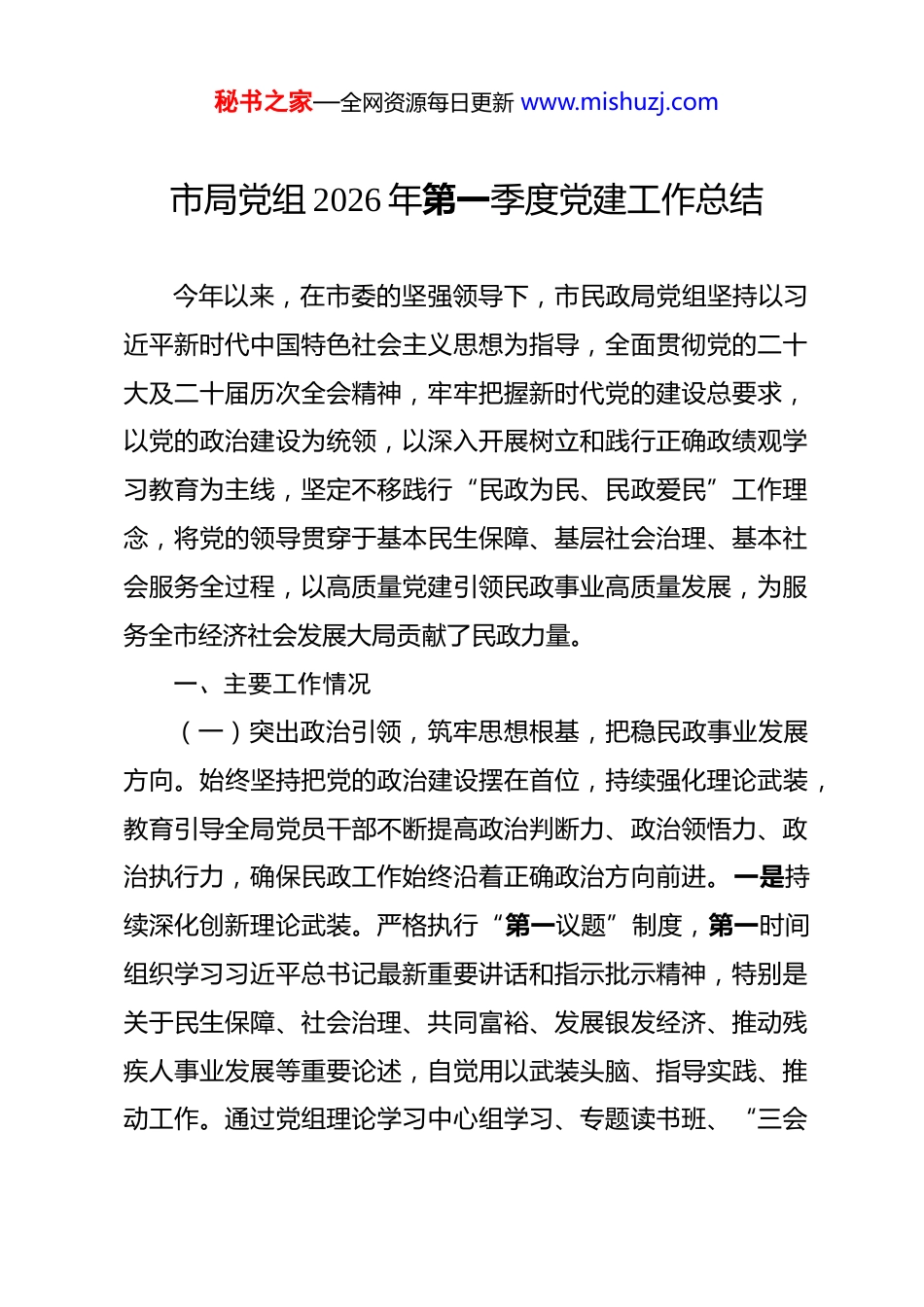 秘书之家—全网资源每日更新 www.mishuzj.com市局党组 2026 年第一季度党建工作总结 今年以来,在市委的坚强领导下,市民政局党组坚持以习近平新时代中国特色社会主义思想为指导,全面贯彻党的二十大及二十届历次全会精神,牢牢把握新时代党的建设总要求,以党的政治建设为统领,以深入开展树立和践行正确政绩观学习教育为主线,坚定不移践行“民政为民、民政爱民”工作理念,将党的领导贯穿于基本民生保障、基层社会治理、基本社会服务全过程,以高质量党建引领民政事业高质量发展,为服务全市经济社会发展大局贡献了民政力量。一、主要工作情况(一)突出政治引领,筑牢思想根基,把稳民政事业发展方向。始终坚持把党的政治建设摆在首位,持续强化理论武装,教育引导全局党员干部不断提高政治判断力、政治领悟力、政治执行力,确保民政工作始终沿着正确政治方向前进。一是持续深化创新理论武装。严格执行“第一议题”制度,第一时间组织学习习近平总书记最新重要讲话和指示批示精神,特别是关于民生保障、社会治理、共同富裕、发展银发经济、推动残疾人事业发展等重要论述,自觉用以武装头脑、指导实践、推动工作。通过党组理论学习中心组学习、专题读书班、“三会秘书之家—全网资源每日更新 www.mishuzj.com一课”、主题党日等形式,组织党员干部深入学习党的二十大及二十届历次全会精神,系统研读《习近平著作选读》等权威著作,推动党的创新理论进机关、进基层、进服务机构。一季度,局党组开展理论学习中心组学习 4 次,专题研讨 2 次;各基层党组织开展集中学习、专题研讨 120 余场次,党员干部的理论素养和政治能力得到有效提升。二是扎实开展树立和践行正确政绩观学习教育。将深入开展树立和践行正确政绩观学习教育作为一季度党建工作的核心任务。及时召开动员部署会,传达学习中央和省、市委有关精神,制定印发《市民政局党组关于深入开展树立和践行正确政绩观学习教育的实施方案》。重点围绕习近平总书记关于树立和践行正确政绩观、坚持高质量发展、坚持以人民为中心等一系列重要论述开展深入学习,引导党员干部深刻反思“政绩为谁而树、树什么样的政绩、靠什么树政绩”这一根本问题。结合民政工作实际,组织开展了3 次专题研讨,聚焦“如何在保障和改善民生中创造经得起历史、实践和人民检验的实绩”、“如何处理好社会救助的‘兜底线’与社会福利的‘促发展’、当前‘救急难’与长远‘防返贫’的关系”、“在推动养老服务、儿童福利、基层治理等重点工作中如何力戒形式主义、官僚主义,追求实实在在的成效”等主题深入交流。教育引导全局党员干部始终把为民造福秘书之家—全网资源每日更新 www.mishuzj.com作为最大政绩,完整、准确、全面贯彻新发展理念,坚决防止和纠正“重显绩轻潜绩”、“只顾数字好看、不顾群众冷暖”、“堆盆景、造亮点”等偏差,努力把正确政绩观体现到谋划民政项目、制定惠民政策、优化服务流程、解决群众“急难愁盼”的各项工作中。三是严明政治纪律和政治规矩。始终胸怀“国之大者”,确保中央大政方针和省、市委决策部署在民政领域不折不扣落实。严格执行重大事项请示报告制度,一季度就养老服务体系建设规划、困难群众救助保障标准调整、重大福利设施建设等事项,向市委、市政府及上级主管部门请示报告 8 次。持续巩固拓展风清气正的政治生态,教育引导党员干部始终做政治上的明白人、老实人。(二)聚焦中心任务,深化融合互促,彰显党建引领保障作用。坚持围绕中心、服务大局,推动党建工作与民政业务工作深度融合,以保障和改善民生的实际成效检验党建工作成果。一是党建引领重点民生项目落地。在推进市级示范性养老机构建设、街道综合养老服务中心全覆盖、智慧社区建设试点、“精康融合”行动、困境儿童“关爱之家”提升等重点民生项目和年度重点任务中,充分发挥党组织战斗堡垒和党员先锋模范作用。设立“党员先锋岗”45 个,组建“党员突击队”6 支,围绕项目审批、资金筹措、质量监管、服务提升等关键环节攻秘书之家—全网资源每日更新 www.mishuzj.com坚克难。一季度,推动新建街道综合养老服务中心 3 个,...