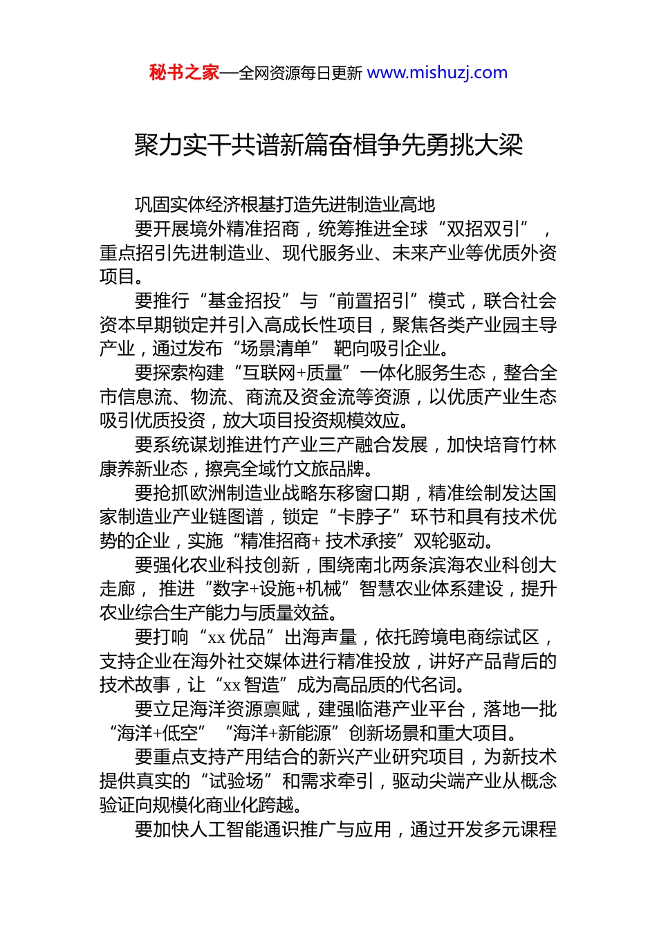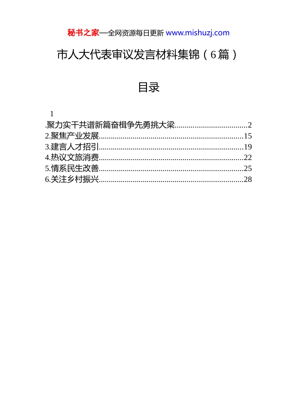 秘书之家—全网资源每日更新 www.mishuzj.com市人大代表审议发言材料集锦(6 篇)目录1.聚力实干共谱新篇奋楫争先勇挑大梁....................................22.聚焦产业发展........................................................................153.建言人才招引........................................................................194.热议文旅消费........................................................................225.情系民生改善........................................................................256.关注乡村振兴........................................................................28秘书之家—全网资源每日更新 www.mishuzj.com聚力实干共谱新篇奋楫争先勇挑大梁巩固实体经济根基打造先进制造业高地要开展境外精准招商,统筹推进全球“双招双引”,重点招引先进制造业、现代服务业、未来产业等优质外资项目。要推行“基金招投”与“前置招引”模式,联合社会资本早期锁定并引入高成长性项目,聚焦各类产业园主导产业,通过发布“场景清单” 靶向吸引企业。要探索构建“互联网+质量”一体化服务生态,整合全市信息流、物流、商流及资金流等资源,以优质产业生态吸引优质投资,放大项目投资规模效应。要系统谋划推进竹产业三产融合发展,加快培育竹林康养新业态,擦亮全域竹文旅品牌。要抢抓欧洲制造业战略东移窗口期,精准绘制发达国家制造业产业链图谱,锁定“卡脖子”环节和具有技术优势的企业,实施“精准招商+ 技术承接”双轮驱动。要强化农业科技创新,围绕南北两条滨海农业科创大走廊, 推进“数字+设施+机械”智慧农业体系建设,提升农业综合生产能力与质量效益。要打响“xx 优品”出海声量,依托跨境电商综试区,支持企业在海外社交媒体进行精准投放,讲好产品背后的技术故事,让“xx 智造”成为高品质的代名词。要立足海洋资源禀赋,建强临港产业平台,落地一批“海洋+低空”“海洋+新能源”创新场景和重大项目。要重点支持产用结合的新兴产业研究项目,为新技术提供真实的“试验场”和需求牵引,驱动尖端产业从概念验证向规模化商业化跨越。要加快人工智能通识推广与应用,通过开发多元课程秘书之家—全网资源每日更新 www.mishuzj.com资源、拓展多维培训渠道等方式构建特色化培训体系,推进人工智能应用场景示范落地。要鼓励金融机构聚焦新兴产业,创新特色化产品和服务, 支持符合条件的企业利用资本市场直接融资。要采取政府引导和市场化并举的方式,以少量财政资金撬动金融和社会资本,共同引进培育未来产业。要抢占新赛道发展先机,以前湾新区为核心培育智能网联汽车产业集群,巩固我市在精密传动、机器视觉等关键领域的供应链优势。要加快培育具身智能产业集群,建设具身智能公共训练与验证平台,实施具身智能专项人才计划,支持企业开展零部件小型化、轻量化等行业难题的技术攻关。要依托芯港小镇、机器人产业园、智能汽车软件园等特色园区,加速切入人形机器人、低空经济等产业链高度协同新赛道。冯江川代表说,要聚焦工业用地二次开发中的堵点,加快法规、规划与技术标准修订,构建高效审批与监管体系。要健全工业用地项目全生命周期管理,将新供地、存量用地转让纳入履约监管,优化亩均评价体系,强化对闲置土地、低效工业用地的管理。要建强低空经济产业园、未来能源科创园等新兴产业平台, 创新运营管理模式,完善公共服务配套,打造特色鲜明、功能完善的产业发展集群。要支持在甬高校与浙江人形机器人创新中心、均普智能等机构、企业开展深度合作,实施人形机器人人才联合培养计划,培养适配 xx 产业需求的专业人才。要以南高教园区院士公园文化轴和教育功能片区为依托, 整合高校资源,打造集人才培养、技术研发、成果转化于一体的省级市域产教融合示范区。秘书之家—全网资源每日更新 www.mishuzj.com要制订更加开放灵活的引才育才政策,推行“企业研究员” 等制度,完善民营企业人才评价与保障体系,健全产业人才智库。要统筹规划“产业校区+特色产业学院”矩阵,共享高校实 验室、...