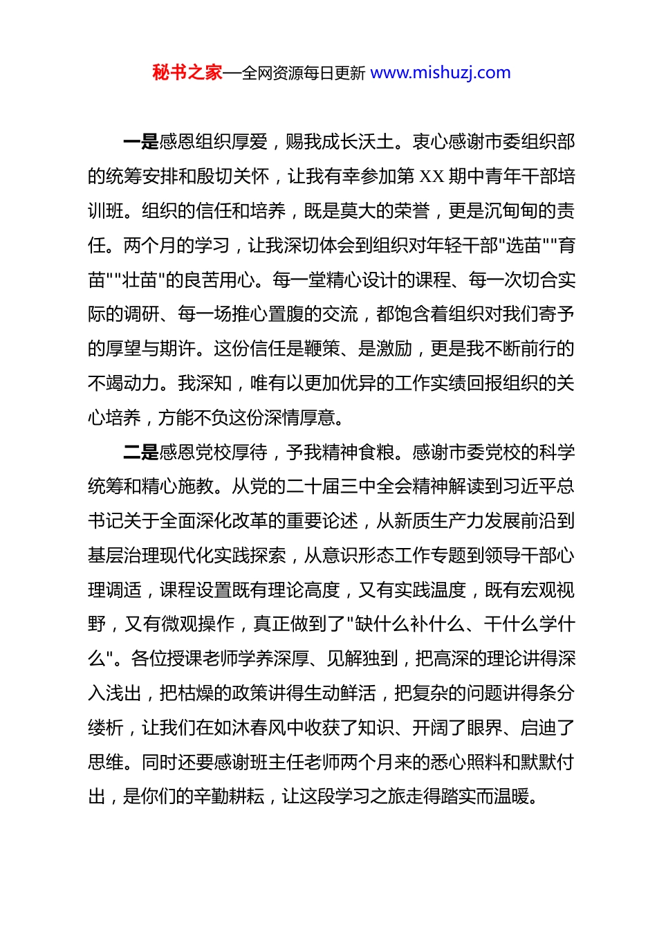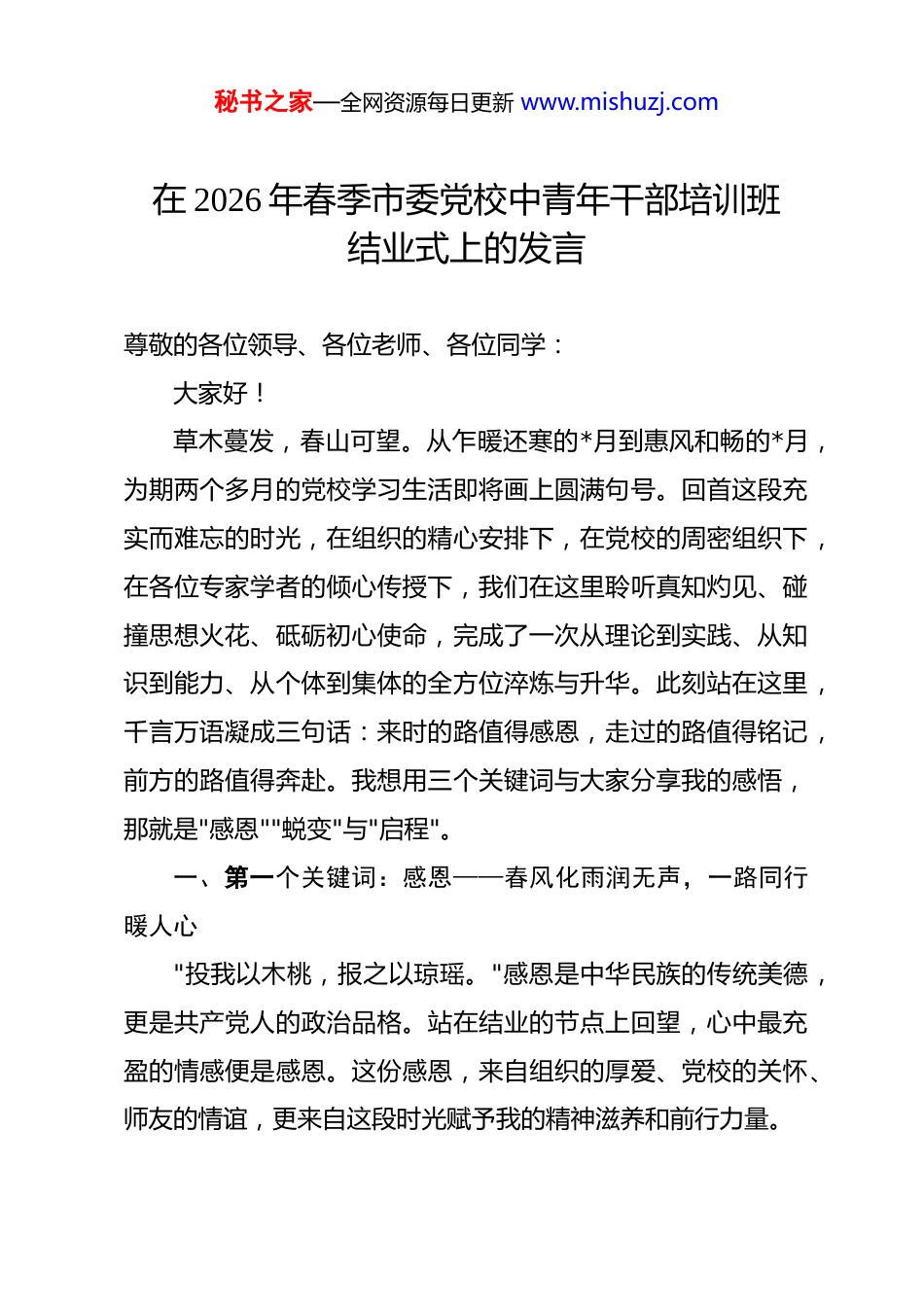 秘书之家—全网资源每日更新 www.mishuzj.com在 2026 年春季市委党校中青年干部培训班结业式上的发言 尊敬的各位领导、各位老师、各位同学:大家好!草木蔓发,春山可望。从乍暖还寒的*月到惠风和畅的*月,为期两个多月的党校学习生活即将画上圆满句号。回首这段充实而难忘的时光,在组织的精心安排下,在党校的周密组织下,在各位专家学者的倾心传授下,我们在这里聆听真知灼见、碰撞思想火花、砥砺初心使命,完成了一次从理论到实践、从知识到能力、从个体到集体的全方位淬炼与升华。此刻站在这里,千言万语凝成三句话:来时的路值得感恩,走过的路值得铭记,前方的路值得奔赴。我想用三个关键词与大家分享我的感悟,那就是"感恩""蜕变"与"启程"。一、第一个关键词:感恩——春风化雨润无声,一路同行暖人心"投我以木桃,报之以琼瑶。"感恩是中华民族的传统美德,更是共产党人的政治品格。站在结业的节点上回望,心中最充盈的情感便是感恩。这份感恩,来自组织的厚爱、党校的关怀、师友的情谊,更来自这段时光赋予我的精神滋养和前行力量。秘书之家—全网资源每日更新 www.mishuzj.com一是感恩组织厚爱,赐我成长沃土。衷心感谢市委组织部的统筹安排和殷切关怀,让我有幸参加第 XX 期中青年干部培训班。组织的信任和培养,既是莫大的荣誉,更是沉甸甸的责任。两个月的学习,让我深切体会到组织对年轻干部"选苗""育苗""壮苗"的良苦用心。每一堂精心设计的课程、每一次切合实际的调研、每一场推心置腹的交流,都饱含着组织对我们寄予的厚望与期许。这份信任是鞭策、是激励,更是我不断前行的不竭动力。我深知,唯有以更加优异的工作实绩回报组织的关心培养,方能不负这份深情厚意。二是感恩党校厚待,予我精神食粮。感谢市委党校的科学统筹和精心施教。从党的二十届三中全会精神解读到习近平总书记关于全面深化改革的重要论述,从新质生产力发展前沿到基层治理现代化实践探索,从意识形态工作专题到领导干部心理调适,课程设置既有理论高度,又有实践温度,既有宏观视野,又有微观操作,真正做到了"缺什么补什么、干什么学什么"。各位授课老师学养深厚、见解独到,把高深的理论讲得深入浅出,把枯燥的政策讲得生动鲜活,把复杂的问题讲得条分缕析,让我们在如沐春风中收获了知识、开阔了眼界、启迪了思维。同时还要感谢班主任老师两个月来的悉心照料和默默付出,是你们的辛勤耕耘,让这段学习之旅走得踏实而温暖。秘书之家—全网资源每日更新 www.mishuzj.com三是感恩同窗厚谊,伴我一路同行。本期培训班共有学员XX 名,来自全市各县(市、区)和市直各单位,涵盖了经济、政法、教育、卫生、农业农村等多个领域。两个月的朝夕相处,我们从初识的拘谨到熟络的畅谈,从课堂上的思想交锋到调研路上的并肩前行,从小组研讨时的激烈辩论到课余饭后的促膝长谈,结下了弥足珍贵的同学情谊。各位同学身上展现的扎实功底、务实作风、进取精神,让我深受触动、获益良多。这段同窗之谊,是我在党校收获的最宝贵的财富之一,也必将成为我们今后工作中守望相助、携手共进的重要纽带。二、第二个关键词:蜕变——千淘万漉虽辛苦,吹尽狂沙始到金"学如弓弩,才如箭镞。"两个月的党校时光虽然短暂,却如同一场深刻的自我革命,让我在思想上经历了一次洗礼,在认识上实现了一次跃升,在能力上完成了一次蜕变。如果说来之前是带着问题来"充电",那么此刻便是满载能量去"发光"。汇报几个让我印象尤为深刻的瞬间。一是开班第一课,点燃信仰之火。记得开班典礼那天,市委 XXX 书记亲自为我们讲授第一课,从全市发展大局到年轻干部成长路径,从当前面临的机遇挑战到未来肩负的使命担当,字字句句语重心长、殷殷嘱托催人奋进。那一刻我深切感受到,秘书之家—全网资源每日更新 www.mishuzj.com作为新时代的中青年干部,我们赶上了最好的时代,也面临着最大的考验。课堂上,来自不同班次的学员济济一堂,老中青三代干部同堂学习、薪火相传,恰似一条奔涌向前的河流,源头活水不竭,后浪前浪相推。那一幕,让我更加坚定了"请党放心、强国有我"的信念与决心。二是红色教育行,赓续精神血脉。在 X...