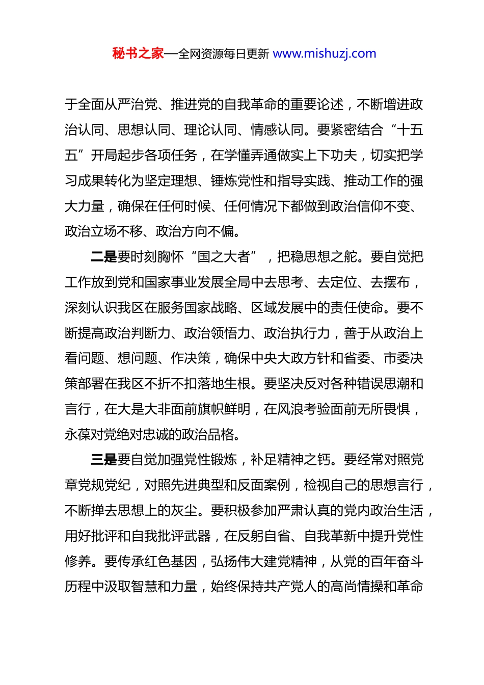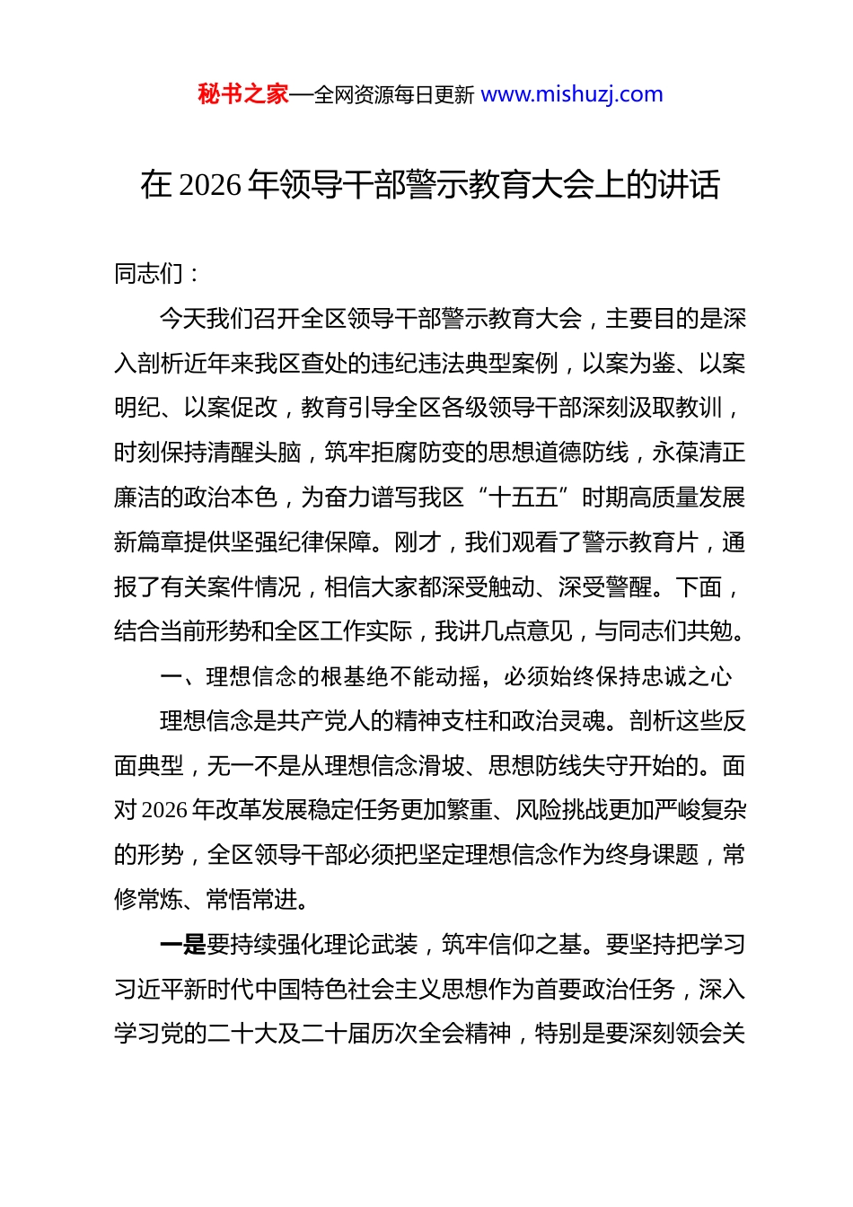 秘书之家—全网资源每日更新 www.mishuzj.com在 2026 年领导干部警示教育大会上的讲话 同志们:今天我们召开全区领导干部警示教育大会,主要目的是深入剖析近年来我区查处的违纪违法典型案例,以案为鉴、以案明纪、以案促改,教育引导全区各级领导干部深刻汲取教训,时刻保持清醒头脑,筑牢拒腐防变的思想道德防线,永葆清正廉洁的政治本色,为奋力谱写我区“十五五”时期高质量发展新篇章提供坚强纪律保障。刚才,我们观看了警示教育片,通报了有关案件情况,相信大家都深受触动、深受警醒。下面,结合当前形势和全区工作实际,我讲几点意见,与同志们共勉。一、理想信念的根基绝不能动摇,必须始终保持忠诚之心理想信念是共产党人的精神支柱和政治灵魂。剖析这些反面典型,无一不是从理想信念滑坡、思想防线失守开始的。面对 2026 年改革发展稳定任务更加繁重、风险挑战更加严峻复杂的形势,全区领导干部必须把坚定理想信念作为终身课题,常修常炼、常悟常进。一是要持续强化理论武装,筑牢信仰之基。要坚持把学习习近平新时代中国特色社会主义思想作为首要政治任务,深入学习党的二十大及二十届历次全会精神,特别是要深刻领会关秘书之家—全网资源每日更新 www.mishuzj.com于全面从严治党、推进党的自我革命的重要论述,不断增进政治认同、思想认同、理论认同、情感认同。要紧密结合“十五五”开局起步各项任务,在学懂弄通做实上下功夫,切实把学习成果转化为坚定理想、锤炼党性和指导实践、推动工作的强大力量,确保在任何时候、任何情况下都做到政治信仰不变、政治立场不移、政治方向不偏。二是要时刻胸怀“国之大者”,把稳思想之舵。要自觉把工作放到党和国家事业发展全局中去思考、去定位、去摆布,深刻认识我区在服务国家战略、区域发展中的责任使命。要不断提高政治判断力、政治领悟力、政治执行力,善于从政治上看问题、想问题、作决策,确保中央大政方针和省委、市委决策部署在我区不折不扣落地生根。要坚决反对各种错误思潮和言行,在大是大非面前旗帜鲜明,在风浪考验面前无所畏惧,永葆对党绝对忠诚的政治品格。三是要自觉加强党性锻炼,补足精神之钙。要经常对照党章党规党纪,对照先进典型和反面案例,检视自己的思想言行,不断掸去思想上的灰尘。要积极参加严肃认真的党内政治生活,用好批评和自我批评武器,在反躬自省、自我革新中提升党性修养。要传承红色基因,弘扬伟大建党精神,从党的百年奋斗历程中汲取智慧和力量,始终保持共产党人的高尚情操和革命秘书之家—全网资源每日更新 www.mishuzj.com气节,做到初心如磐、使命在肩。二、纪律规矩的红线绝不能触碰,必须始终保持敬畏之心党的纪律是党的生命线,是党员干部约束自身行为的标准和遵循。无数案例表明,“破法”无不始于“破纪”。全区领导干部必须把纪律规矩刻印在心,知敬畏、存戒惧、守底线。一是要带头学习遵守党章党规党纪。要把学习新修订的《中国共产党纪律处分条例》作为重要内容,逐章逐条学、联系实际学,真正搞清楚党的纪律规矩是什么,弄明白能干什么、不能干什么。要自觉用党章党规党纪约束自己的一言一行,将其内化为日用而不觉的言行准则。要时刻绷紧纪律规矩这根弦,做到心有所畏、言有所戒、行有所止。二是要坚决维护纪律的刚性约束。纪律是“带电的高压线”,必须铁面执纪、令行禁止。全区领导干部要带头维护纪律的严肃性和权威性,坚决同违反党纪的行为作斗争。要习惯在受监督和约束的环境中工作生活,主动接受组织监督、群众监督、舆论监督,决不能把监督当成是对自己的不信任。要严格执行民主集中制、重大事项请示报告等制度,决不允许搞先斩后奏、瞒报漏报。三是要注重抓早抓小防微杜渐。“千里之堤,溃于蚁穴”。要深化运用监督执纪“四种形态”,特别是要在用好第一种形秘书之家—全网资源每日更新 www.mishuzj.com态上下更大功夫,对党员干部身上出现的苗头性、倾向性问题,及时谈话提醒、批评教育,让“红脸出汗”成为常态。要注重家庭家教家风建设,管好自己、管好家人、管好身边工作人员,净化社交圈、生活圈、朋友圈,坚决守住廉洁自律的底线。三、人民群众...