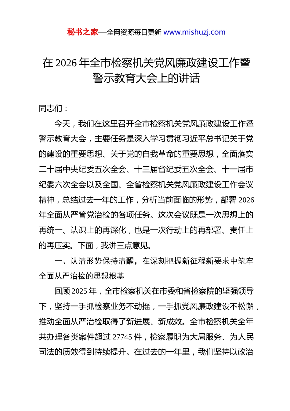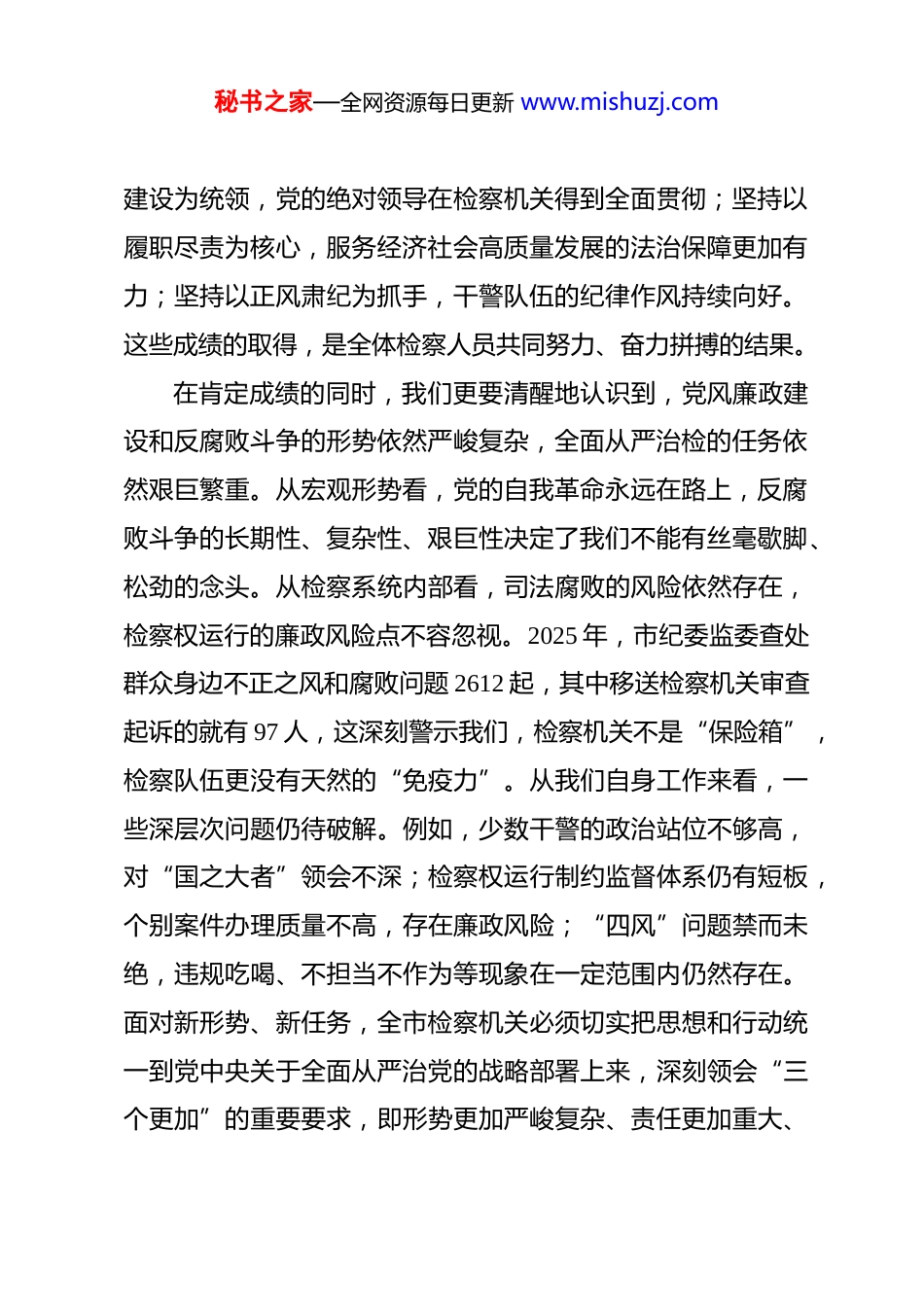 秘书之家—全网资源每日更新 www.mishuzj.com在 2026 年全市检察机关党风廉政建设工作暨警示教育大会上的讲话 同志们:今天,我们在这里召开全市检察机关党风廉政建设工作暨警示教育大会,主要任务是深入学习贯彻习近平总书记关于党的建设的重要思想、关于党的自我革命的重要思想,全面落实二十届中央纪委五次全会、十三届省纪委五次全会、十一届市纪委六次全会以及全国、全省检察机关党风廉政建设工作会议精神,总结过去一年的工作,分析当前面临的形势,部署 2026年全面从严管党治检的各项任务。这次会议既是一次思想上的再统一、认识上的再深化,也是一次行动上的再部署、责任上的再压实。下面,我讲三点意见。一、认清形势保持清醒,在深刻把握新征程新要求中筑牢全面从严治检的思想根基回顾 2025 年,全市检察机关在市委和省检察院的坚强领导下,坚持一手抓检察业务不动摇,一手抓党风廉政建设不松懈,推动全面从严治检取得了新进展、新成效。全市检察机关全年共办理各类案件超过 27745 件,检察履职为大局服务、为人民司法的质效得到持续提升。在过去的一年里,我们坚持以政治秘书之家—全网资源每日更新 www.mishuzj.com建设为统领,党的绝对领导在检察机关得到全面贯彻;坚持以履职尽责为核心,服务经济社会高质量发展的法治保障更加有力;坚持以正风肃纪为抓手,干警队伍的纪律作风持续向好。这些成绩的取得,是全体检察人员共同努力、奋力拼搏的结果。在肯定成绩的同时,我们更要清醒地认识到,党风廉政建设和反腐败斗争的形势依然严峻复杂,全面从严治检的任务依然艰巨繁重。从宏观形势看,党的自我革命永远在路上,反腐败斗争的长期性、复杂性、艰巨性决定了我们不能有丝毫歇脚、松劲的念头。从检察系统内部看,司法腐败的风险依然存在,检察权运行的廉政风险点不容忽视。2025 年,市纪委监委查处群众身边不正之风和腐败问题 2612 起,其中移送检察机关审查起诉的就有 97 人,这深刻警示我们,检察机关不是“保险箱”,检察队伍更没有天然的“免疫力”。从我们自身工作来看,一些深层次问题仍待破解。例如,少数干警的政治站位不够高,对“国之大者”领会不深;检察权运行制约监督体系仍有短板,个别案件办理质量不高,存在廉政风险;“四风”问题禁而未绝,违规吃喝、不担当不作为等现象在一定范围内仍然存在。面对新形势、新任务,全市检察机关必须切实把思想和行动统一到党中央关于全面从严治党的战略部署上来,深刻领会“三个更加”的重要要求,即形势更加严峻复杂、责任更加重大、秘书之家—全网资源每日更新 www.mishuzj.com要求更加严格。必须保持战略定力和战斗韧性,以彻底的自我革命精神,把严的基调、严的措施、严的氛围长期坚持下去,将全面从严治检的螺丝拧得更紧、基础夯得更实,为实现检察监督全面提质增效,在更好为大局服务、为人民司法、为法治担当中,展现与省域副中心城市定位相匹配的*检察新风采,提供最坚强的纪律保障。二、聚焦关键精准发力,在一体推进“三不腐”中提升全面从严治检的综合效能纵深推进全面从严治检,必须坚持系统观念,一体推进不敢腐、不能腐、不想腐,打好正风肃纪反腐的“组合拳”。要以政治建设为统领,以检察权运行制约监督为重点,以正风肃纪为抓手,以“四责协同”为保障,推动党风廉政建设取得更大实效。第一,持续强化政治建设,在淬炼忠诚品格中筑牢“不想腐”的思想堤坝。政治建设是检察机关的生命线,是确保检察工作正确方向的根本保证。一要坚持不懈用党的创新理论凝心铸魂。必须将学习贯彻习近平新时代中国特色社会主义思想作为首要政治任务,巩固拓展主题教育成果。严格落实“第一议题”制度,将思想政治工作深度融入检察业务工作的各方面、全过程,引导全体检察人员深刻领悟“两个确立”的决定性意秘书之家—全网资源每日更新 www.mishuzj.com义,增强“四个意识”、坚定“四个自信”、做到“两个维护”,确保检察队伍绝对忠诚、绝对纯洁、绝对可靠。二要持之以恒严明政治纪律和政治规矩。纪律严明是党的光荣传统和独特优势。要加强对党章党规党纪的学习教育,引导干警知敬畏、存戒惧、守底...