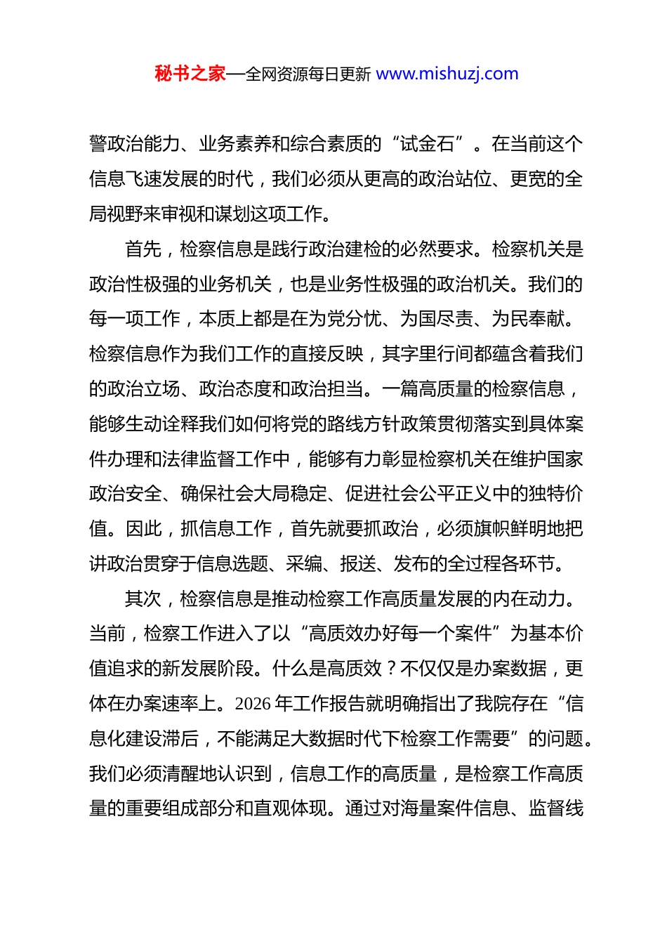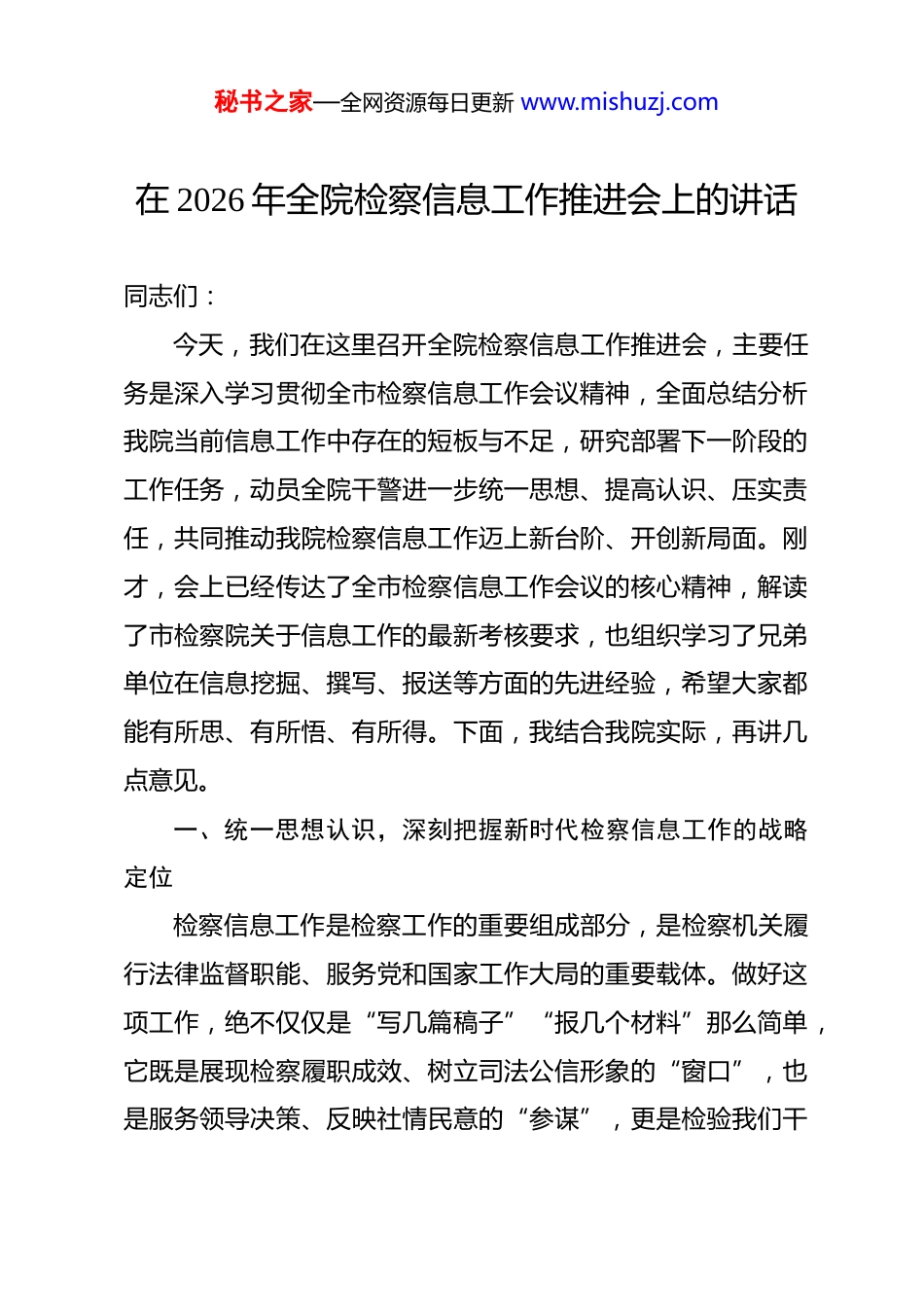 秘书之家—全网资源每日更新 www.mishuzj.com在 2026 年全院检察信息工作推进会上的讲话 同志们:今天,我们在这里召开全院检察信息工作推进会,主要任务是深入学习贯彻全市检察信息工作会议精神,全面总结分析我院当前信息工作中存在的短板与不足,研究部署下一阶段的工作任务,动员全院干警进一步统一思想、提高认识、压实责任,共同推动我院检察信息工作迈上新台阶、开创新局面。刚才,会上已经传达了全市检察信息工作会议的核心精神,解读了市检察院关于信息工作的最新考核要求,也组织学习了兄弟单位在信息挖掘、撰写、报送等方面的先进经验,希望大家都能有所思、有所悟、有所得。下面,我结合我院实际,再讲几点意见。一、统一思想认识,深刻把握新时代检察信息工作的战略定位检察信息工作是检察工作的重要组成部分,是检察机关履行法律监督职能、服务党和国家工作大局的重要载体。做好这项工作,绝不仅仅是“写几篇稿子”“报几个材料”那么简单,它既是展现检察履职成效、树立司法公信形象的“窗口”,也是服务领导决策、反映社情民意的“参谋”,更是检验我们干秘书之家—全网资源每日更新 www.mishuzj.com警政治能力、业务素养和综合素质的“试金石”。在当前这个信息飞速发展的时代,我们必须从更高的政治站位、更宽的全局视野来审视和谋划这项工作。首先,检察信息是践行政治建检的必然要求。检察机关是政治性极强的业务机关,也是业务性极强的政治机关。我们的每一项工作,本质上都是在为党分忧、为国尽责、为民奉献。检察信息作为我们工作的直接反映,其字里行间都蕴含着我们的政治立场、政治态度和政治担当。一篇高质量的检察信息,能够生动诠释我们如何将党的路线方针政策贯彻落实到具体案件办理和法律监督工作中,能够有力彰显检察机关在维护国家政治安全、确保社会大局稳定、促进社会公平正义中的独特价值。因此,抓信息工作,首先就要抓政治,必须旗帜鲜明地把讲政治贯穿于信息选题、采编、报送、发布的全过程各环节。其次,检察信息是推动检察工作高质量发展的内在动力。当前,检察工作进入了以“高质效办好每一个案件”为基本价值追求的新发展阶段。什么是高质效?不仅仅是办案数据,更体在办案速率上。2026 年工作报告就明确指出了我院存在“信息化建设滞后,不能满足大数据时代下检察工作需要”的问题。我们必须清醒地认识到,信息工作的高质量,是检察工作高质量的重要组成部分和直观体现。通过对海量案件信息、监督线秘书之家—全网资源每日更新 www.mishuzj.com索进行深度挖掘、提炼、分析和报送,我们不仅能够向上级机关和党委、政府精准反映工作成效和存在问题,争取更多的理解与支持,还能够通过信息的梳理总结,反思办案理念、优化监督模式、完善工作机制,从而实现业务工作与信息工作的同频共振、相互促进。最后,检察信息是密切联系人民群众的桥梁纽带。司法工作的生命力在于人民群众的拥护和支持。人民群众对检察工作的知晓度、认可度和满意度,直接关系到我们的司法公信力。检察信息,特别是通过新媒体平台发布的检察故事和普法宣传,是人民群众了解检察、监督检察最直接、最便捷的途径。我们要通过一篇篇有思想、有温度、有品质的信息作品,把抽象的法律条文转化为生动的司法实践,把检察机关的履职担当传递到千家万户,让人民群众真切感受到公平正义就在身边。二、正视问题差距,精准锁定当前信息工作中的短板弱项肯定成绩的同时,我们更要清醒地看到自身存在的差距和不足。这几年,在全院干警的共同努力下,我们的信息工作取得了一定进步,但与上级的要求相比,与兄弟院的先进水平相比,与新时代检察工作发展的需要相比,我们还存在不小的差距。这些问题,已经成为制约我院工作整体提升的瓶颈,必须下大力气加以解决。秘书之家—全网资源每日更新 www.mishuzj.com一是政治站位不够高,服务大局的视野格局有待提升。有的同志对信息工作的认识还停留在“完成任务”的层面,满足于就案办案、就事论事,缺乏从政治高度审视和提炼检察工作的能力。撰写的信息往往只见树木、不见森林,对案件背后反映的社会治理问题、制度机制漏洞挖掘不深...