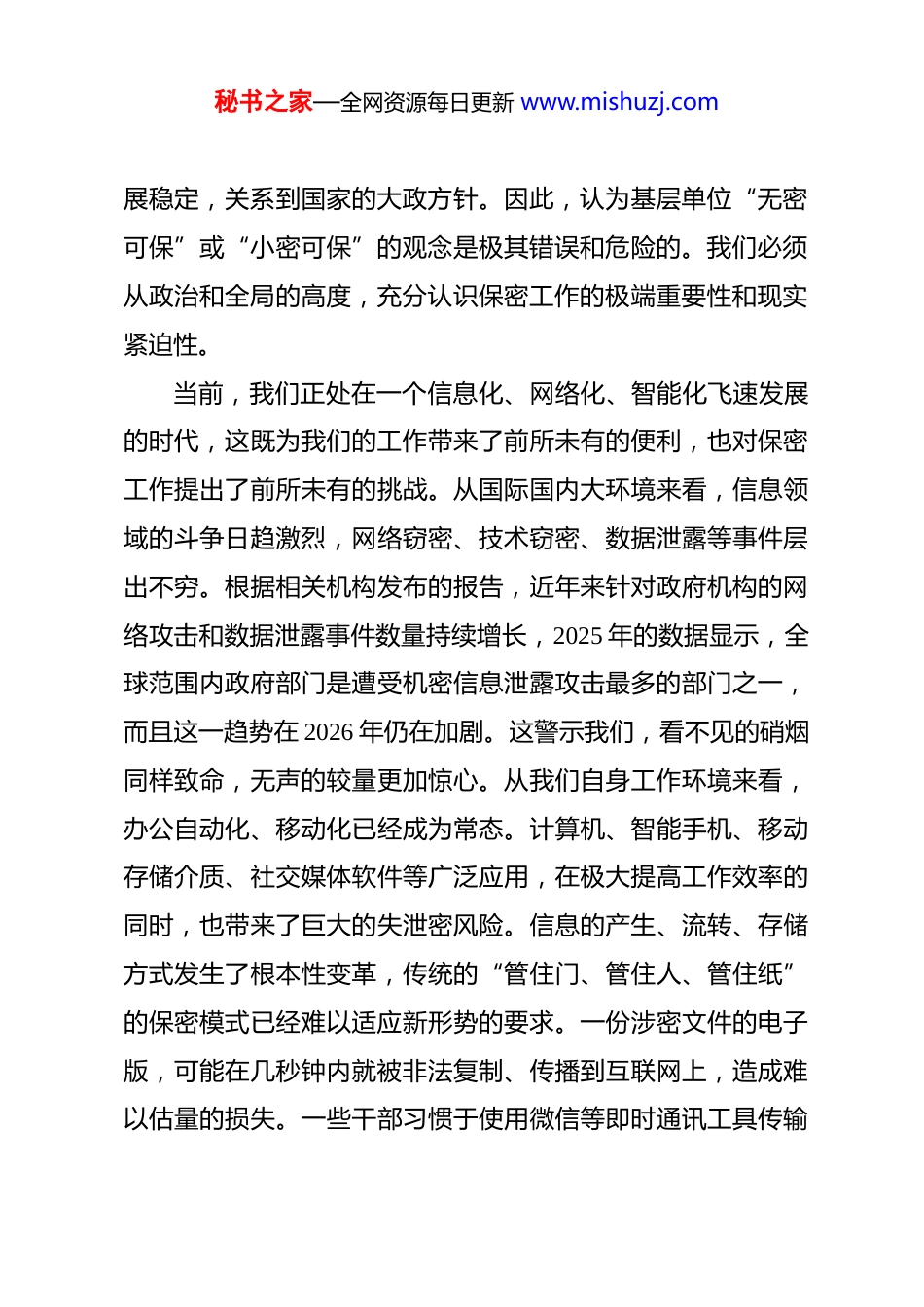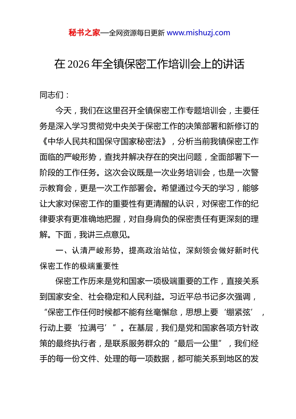秘书之家—全网资源每日更新 www.mishuzj.com在 2026 年全镇保密工作培训会上的讲话 同志们:今天,我们在这里召开全镇保密工作专题培训会,主要任务是深入学习贯彻党中央关于保密工作的决策部署和新修订的《中华人民共和国保守国家秘密法》,分析当前我镇保密工作面临的严峻形势,查找并解决存在的突出问题,全面部署下一阶段的工作任务。这次会议既是一次业务培训会,也是一次警示教育会,更是一次工作部署会。希望通过今天的学习,能够让大家对保密工作的重要性有更清醒的认识,对保密工作的纪律要求有更准确地把握,对自身肩负的保密责任有更深刻的理解。下面,我讲三点意见。一、认清严峻形势,提高政治站位,深刻领会做好新时代保密工作的极端重要性保密工作历来是党和国家一项极端重要的工作,直接关系到国家安全、社会稳定和人民利益。习近平总书记多次强调,“保密工作任何时候都不能有丝毫懈怠,思想上要‘绷紧弦’,行动上要‘拉满弓’”。在基层,我们是党和国家各项方针政策的最终执行者,是联系服务群众的“最后一公里”,我们经手的每一份文件、处理的每一项数据,都可能关系到地区的发秘书之家—全网资源每日更新 www.mishuzj.com展稳定,关系到国家的大政方针。因此,认为基层单位“无密可保”或“小密可保”的观念是极其错误和危险的。我们必须从政治和全局的高度,充分认识保密工作的极端重要性和现实紧迫性。当前,我们正处在一个信息化、网络化、智能化飞速发展的时代,这既为我们的工作带来了前所未有的便利,也对保密工作提出了前所未有的挑战。从国际国内大环境来看,信息领域的斗争日趋激烈,网络窃密、技术窃密、数据泄露等事件层出不穷。根据相关机构发布的报告,近年来针对政府机构的网络攻击和数据泄露事件数量持续增长,2025 年的数据显示,全球范围内政府部门是遭受机密信息泄露攻击最多的部门之一,而且这一趋势在 2026 年仍在加剧。这警示我们,看不见的硝烟同样致命,无声的较量更加惊心。从我们自身工作环境来看,办公自动化、移动化已经成为常态。计算机、智能手机、移动存储介质、社交媒体软件等广泛应用,在极大提高工作效率的同时,也带来了巨大的失泄密风险。信息的产生、流转、存储方式发生了根本性变革,传统的“管住门、管住人、管住纸”的保密模式已经难以适应新形势的要求。一份涉密文件的电子版,可能在几秒钟内就被非法复制、传播到互联网上,造成难以估量的损失。一些干部习惯于使用微信等即时通讯工具传输秘书之家—全网资源每日更新 www.mishuzj.com工作文件,这种“指尖上的办公”虽然便捷,但其安全隐患不容忽视。一旦操作不当,极易造成信息泄露。这些新情况、新问题,使得保密工作的边界在扩展,防范的难度在加大,对我们每一位干部的保密意识和保密技能都提出了更高要求。2024年新修订的《中华人民共和国保守国家秘密法》正式施行,这是国家适应新时代保密工作形势变化作出的重大战略部署。新《中华人民共和国保守国家秘密法》进一步完善了保密管理体制,细化了网络信息保密规定,并首次将“工作秘密”纳入法律保护范畴,强化了机关单位的主体责任和全流程保密管理要求。这充分说明,国家对保密工作的重视程度提升到了新的高度。作为基层干部,我们必须把学习贯彻新《中华人民共和国保守国家秘密法》作为当前和今后一个时期的重要政治任务,准确把握其核心要义和实践要求,切实把法律规定转化为我们日常工作的行为准则,确保党的路线方针政策和国家的重大决策部署在我们这里绝对安全。二、正视薄弱环节,深挖问题根源,清醒认识我镇保密工作存在的风险与挑战近年来,镇党委、政府高度重视保密工作,建立健全了相关制度,开展了一系列宣传教育活动,全镇保密工作形势总体平稳可控。但是,我们必须清醒地看到,对照新形势、新任务、秘书之家—全网资源每日更新 www.mishuzj.com新要求,我们的工作中还存在不少亟待解决的突出问题和薄弱环节。这些问题如果不能及时发现、有效解决,就如同埋下的“定时炸弹”,随时可能引爆,给我们造成无法挽回的损失。一是思想认识存在“温差”。部分干部存在麻痹思想和侥幸心理,...