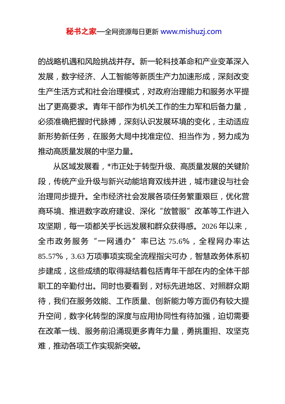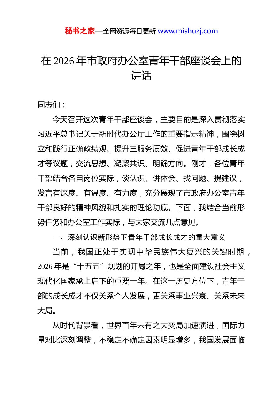 秘书之家—全网资源每日更新 www.mishuzj.com在 2026 年市政府办公室青年干部座谈会上的讲话 同志们:今天召开这次青年干部座谈会,主要目的是深入贯彻落实习近平总书记关于新时代办公厅工作的重要指示精神,围绕树立和践行正确政绩观、提升三服务质效、促进青年干部成长成才等议题,交流思想、凝聚共识、明确方向。刚才,各位青年干部结合各自岗位实际,谈认识、讲体会、找问题、提建议,发言有深度、有温度、有力度,充分展现了市政府办公室青年干部良好的精神风貌和扎实的理论功底。下面,我结合当前形势任务和办公室工作实际,与大家交流几点意见。一、深刻认识新形势下青年干部成长成才的重大意义当前,我国正处于实现中华民族伟大复兴的关键时期 ,2026 年是“十五五”规划的开局之年,也是全面建设社会主义现代化国家承上启下的重要一年。在这一历史方位下,青年干部的成长成才不仅关系个人发展,更关系事业兴衰、关系未来大局。从时代背景看,世界百年未有之大变局加速演进,国际力量对比深刻调整,不稳定不确定因素明显增多,我国发展面临秘书之家—全网资源每日更新 www.mishuzj.com的战略机遇和风险挑战并存。新一轮科技革命和产业变革深入发展,数字经济、人工智能等新质生产力加速形成,深刻改变生产生活方式和社会治理模式,对政府治理能力和服务水平提出了更高要求。青年干部作为机关工作的生力军和后备力量,必须准确把握时代脉搏,深刻认识发展环境的变化,主动适应新形势新任务,在服务大局中找准定位、担当作为,努力成为推动高质量发展的中坚力量。从区域发展看,*市正处于转型升级、高质量发展的关键阶段,传统产业升级与新兴动能培育双线并进,城市建设与社会治理同步提升。全市经济社会发展各项任务繁重艰巨,优化营商环境、推进数字政府建设、深化“放管服”改革等工作进入攻坚期,每一项都关乎长远发展和群众获得感。2026 年以来,全市政务服务“一网通办”率已达 75.6%,全程网办率达85.57%,3.63 万项事项实现全流程指尖可办,智慧政务体系初步建成,这些成绩的取得凝结着包括青年干部在内的全体干部职工的辛勤付出。同时也要看到,对标先进地区、对照群众期待,我们在服务效能、工作质量、创新能力等方面仍有较大提升空间,数字化转型的深度与应用协同性有待加强,迫切需要在改革一线、服务前沿涌现更多青年力量,勇挑重担、攻坚克难,推动各项工作实现新突破。秘书之家—全网资源每日更新 www.mishuzj.com从干部队伍建设看,青年干部培养是关系事业后继有人的根本大计,是组织持续发展的战略支撑。当前,办公室干部队伍正处于新老交替、薪火相传的重要时期,一批经验丰富的老同志逐步退出岗位,迫切需要年轻力量及时跟进、承接使命。培养一支政治过硬、本领高强、作风优良的青年干部队伍,既是应对当前复杂任务的当务之急,也是保障事业长远发展的固本之策。青年干部要珍惜机遇、不负韶华,在实践锻炼中砥砺品质、增长才干,主动到困难多、挑战大的岗位上磨练,不断提升政治判断力、政治领悟力、政治执行力,努力成长为可堪大用、能担重任的栋梁之材,为党和人民事业注入持续不断的生机与活力。二、准确把握青年干部成长成才的核心要求青年干部成长成才,既需要组织培养,更需要自身努力。结合当前形势任务和办公室工作实际,青年干部要在以下几个方面下功夫、见成效。(一)坚定理想信念,筑牢思想根基。理想信念是共产党人精神上的钙,是青年干部成长成才的根本支撑。当前,中央在全党部署开展树立和践行正确政绩观学习教育,这既是对党员干部的一次深刻思想洗礼,也是对青年干部的一次重要政治历练。一是要深学细悟习近平新时代中国特色社会主义思想,秘书之家—全网资源每日更新 www.mishuzj.com全面把握其核心要义、精神实质、丰富内涵和实践要求,做到学思用贯通、知信行统一。要把学习贯彻习近平总书记关于新时代办公厅工作的重要指示精神作为重中之重,深刻领会其政治性、思想性、指导性,切实把思想和行动统一到党党中央决策部署上来。二是要牢固树立正确政绩观,深刻理解政绩为谁而树、树什么样的政绩、靠什么树政绩这一根本问...