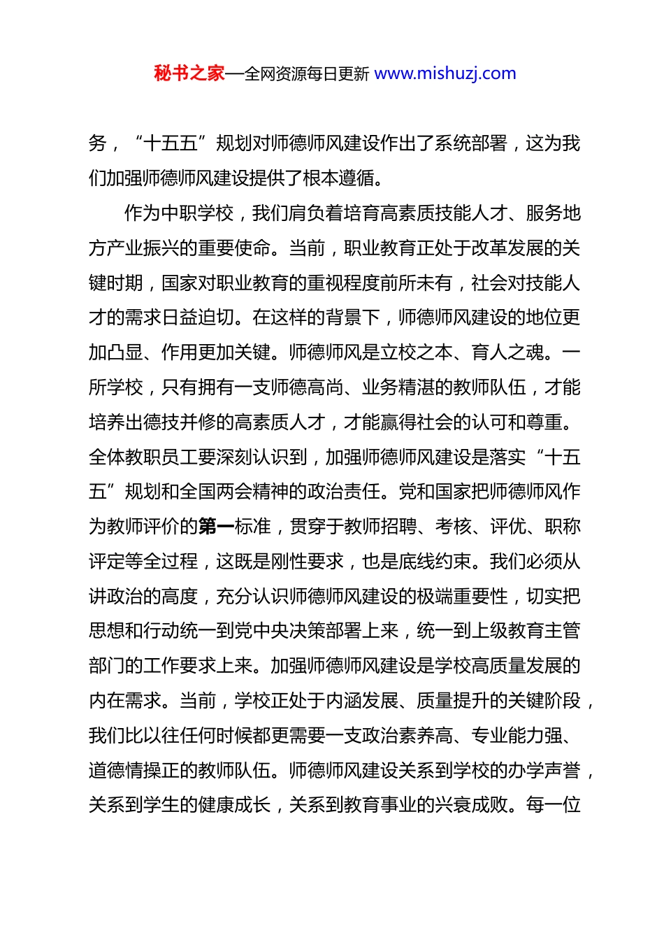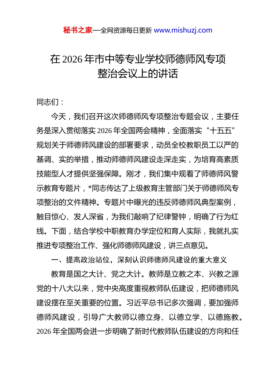 秘书之家—全网资源每日更新 www.mishuzj.com在 2026 年市中等专业学校师德师风专项整治会议上的讲话 同志们:今天,我们召开这次师德师风专项整治专题会议,主要任务是深入贯彻落实 2026 年全国两会精神,全面落实“十五五”规划关于师德师风建设的部署要求,动员全校教职员工以严的基调、实的举措,推动师德师风建设走深走实,为培育高素质技能型人才提供坚强保障。刚才,我们集中观看了师德师风警示教育专题片,*同志传达了上级教育主管部门关于师德师风专项整治的文件精神。专题片中曝光的违反师德师风典型案例,触目惊心、发人深省,为我们敲响了纪律警钟,明确了行为红线。下面,结合学校中职教育办学定位和育人实际,我就扎实推进专项整治工作、强化师德师风建设,讲三点意见。一、提高政治站位,深刻认识师德师风建设的重大意义教育是国之大计、党之大计。教师是立教之本、兴教之源党的十八大以来,党中央高度重视教师队伍建设,把师德师风建设摆在至关重要的位置。习近平总书记多次强调,要加强师德师风建设,引导广大教师以德立身、以德立学、以德施教。2026 年全国两会进一步明确了新时代教师队伍建设的方向和任秘书之家—全网资源每日更新 www.mishuzj.com务,“十五五”规划对师德师风建设作出了系统部署,这为我们加强师德师风建设提供了根本遵循。作为中职学校,我们肩负着培育高素质技能人才、服务地方产业振兴的重要使命。当前,职业教育正处于改革发展的关键时期,国家对职业教育的重视程度前所未有,社会对技能人才的需求日益迫切。在这样的背景下,师德师风建设的地位更加凸显、作用更加关键。师德师风是立校之本、育人之魂。一所学校,只有拥有一支师德高尚、业务精湛的教师队伍,才能培养出德技并修的高素质人才,才能赢得社会的认可和尊重。全体教职员工要深刻认识到,加强师德师风建设是落实“十五五”规划和全国两会精神的政治责任。党和国家把师德师风作为教师评价的第一标准,贯穿于教师招聘、考核、评优、职称评定等全过程,这既是刚性要求,也是底线约束。我们必须从讲政治的高度,充分认识师德师风建设的极端重要性,切实把思想和行动统一到党中央决策部署上来,统一到上级教育主管部门的工作要求上来。加强师德师风建设是学校高质量发展的内在需求。当前,学校正处于内涵发展、质量提升的关键阶段,我们比以往任何时候都更需要一支政治素养高、专业能力强、道德情操正的教师队伍。师德师风建设关系到学校的办学声誉,关系到学生的健康成长,关系到教育事业的兴衰成败。每一位秘书之家—全网资源每日更新 www.mishuzj.com教职员工都应自觉把师德规范内化于心、外化于行,践行“为党育人、为国育才”的初心使命,以实际行动回答好“培养什么人、怎样培养人、为谁培养人”这一根本问题。加强师德师风建设是回应人民群众期盼的必然要求。教育牵动着千家万户的心,人民群众对教育的期盼,最根本的是对好老师的期盼。什么是好老师?好老师首先要有高尚的道德情操。学生、家长和社会对教师的期望值很高,教师的一言一行、一举一动,都受到社会的关注和评判。我们必须以更高的标准要求自己,以更严的纪律约束自己,用良好的师德师风赢得人民群众的信任和尊重。二、聚焦整治重点,坚决守住师德师风纪律底线本次专项整治工作会议,是在学校深入贯彻落实上级部署推进内涵发展、提升育人质量的关键时刻召开的。我们必须清醒地看到,师德师风建设虽然取得了积极成效,但仍然存在一些不容忽视的问题。有的教师理想信念不够坚定,教书育人的责任感、使命感有所淡化;有的教师纪律规矩意识不强,存在违规收受礼品礼金、有偿补课等问题;有的教师对待学生态度生硬,存在歧视、体罚学生等现象。这些问题虽然是个别现象,但严重损害了教师队伍的整体形象,严重影响了学校的教育教学质量,必须引起我们高度重视,切实加以解决。秘书之家—全网资源每日更新 www.mishuzj.com根据上级教育主管部门的要求,本次专项整治将重点聚焦以下突出问题:一是教师违规收受礼品礼金问题;二是在职教师有偿补课问题;三是歧视、体罚学生问题;四是违规收费问题;五是违规征...