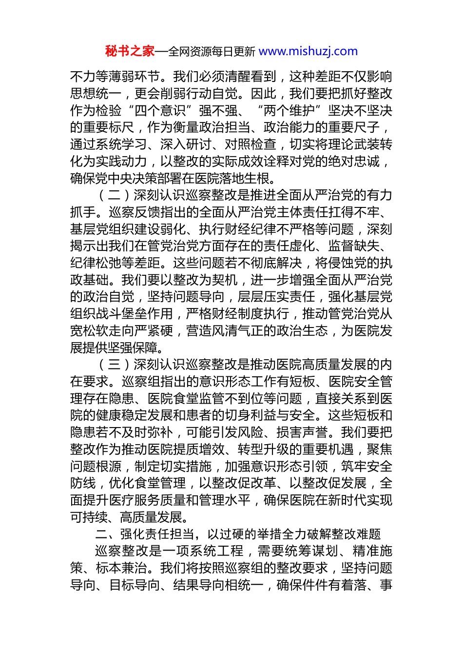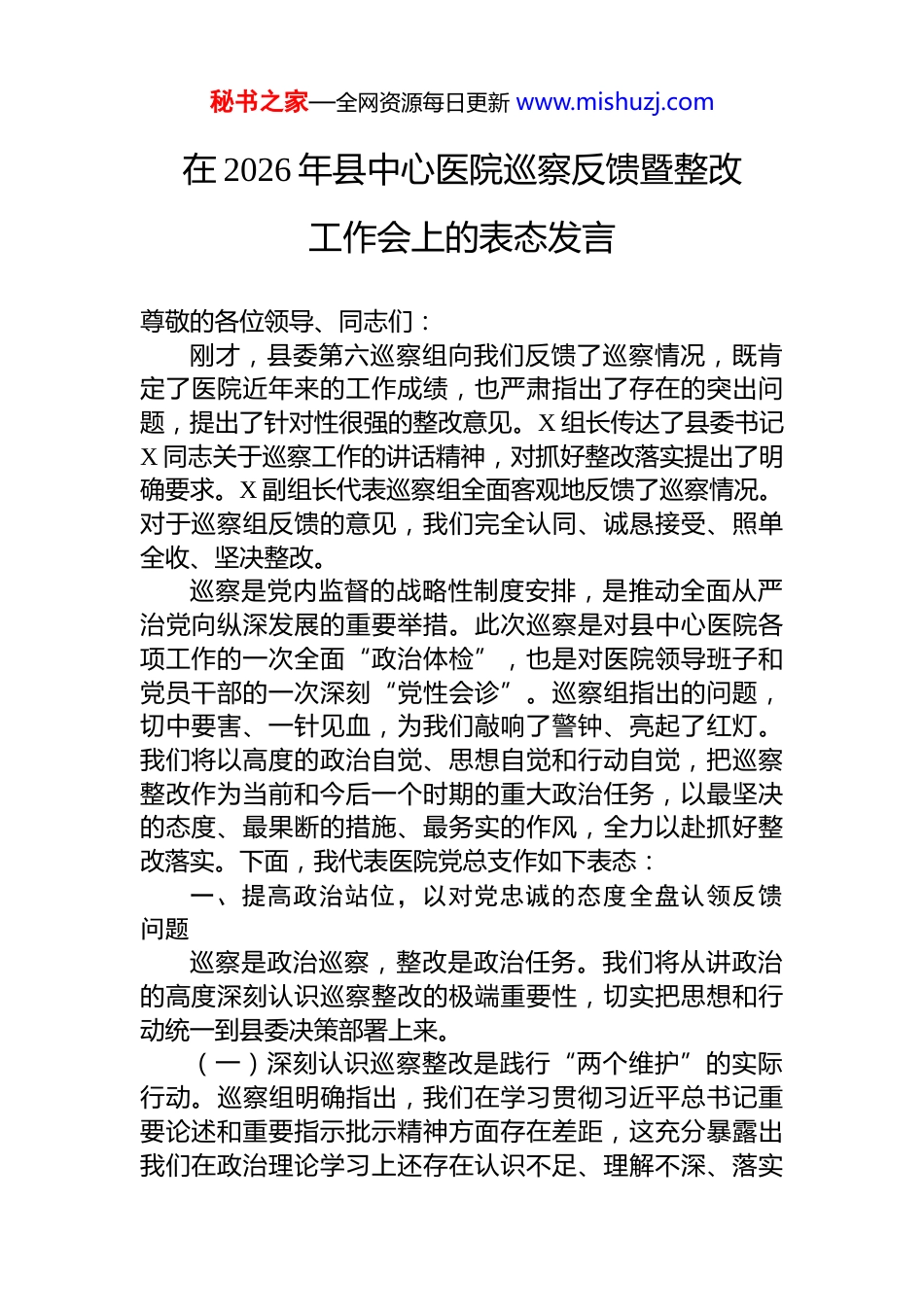秘书之家—全网资源每日更新 www.mishuzj.com在 2026 年县中心医院巡察反馈暨整改工作会上的表态发言尊敬的各位领导、同志们:刚才,县委第六巡察组向我们反馈了巡察情况,既肯定了医院近年来的工作成绩,也严肃指出了存在的突出问题,提出了针对性很强的整改意见。X 组长传达了县委书记X 同志关于巡察工作的讲话精神,对抓好整改落实提出了明确要求。X 副组长代表巡察组全面客观地反馈了巡察情况。对于巡察组反馈的意见,我们完全认同、诚恳接受、照单全收、坚决整改。巡察是党内监督的战略性制度安排,是推动全面从严治党向纵深发展的重要举措。此次巡察是对县中心医院各项工作的一次全面“政治体检”,也是对医院领导班子和党员干部的一次深刻“党性会诊”。巡察组指出的问题,切中要害、一针见血,为我们敲响了警钟、亮起了红灯。我们将以高度的政治自觉、思想自觉和行动自觉,把巡察整改作为当前和今后一个时期的重大政治任务,以最坚决的态度、最果断的措施、最务实的作风,全力以赴抓好整改落实。下面,我代表医院党总支作如下表态:一、提高政治站位,以对党忠诚的态度全盘认领反馈问题巡察是政治巡察,整改是政治任务。我们将从讲政治的高度深刻认识巡察整改的极端重要性,切实把思想和行动统一到县委决策部署上来。(一)深刻认识巡察整改是践行“两个维护”的实际行动。巡察组明确指出,我们在学习贯彻习近平总书记重要论述和重要指示批示精神方面存在差距,这充分暴露出我们在政治理论学习上还存在认识不足、理解不深、落实秘书之家—全网资源每日更新 www.mishuzj.com不力等薄弱环节。我们必须清醒看到,这种差距不仅影响思想统一,更会削弱行动自觉。因此,我们要把抓好整改作为检验“四个意识”强不强、“两个维护”坚决不坚决的重要标尺,作为衡量政治担当、政治能力的重要尺子,通过系统学习、深入研讨、对照检查,切实将理论武装转化为实践动力,以整改的实际成效诠释对党的绝对忠诚,确保党中央决策部署在医院落地生根。(二)深刻认识巡察整改是推进全面从严治党的有力抓手。巡察反馈指出的全面从严治党主体责任扛得不牢、基层党组织建设弱化、执行财经纪律不严格等问题,深刻揭示出我们在管党治党方面存在的责任虚化、监督缺失、纪律松弛等差距。这些问题若不彻底解决,将侵蚀党的执政基础。我们要以整改为契机,进一步增强全面从严治党的政治自觉,坚持问题导向,层层压实责任,强化基层党组织战斗堡垒作用,严格财经制度执行,推动管党治党从宽松软走向严紧硬,营造风清气正的政治生态,为医院发展提供坚强保障。(三)深刻认识巡察整改是推动医院高质量发展的内在要求。巡察组指出的意识形态工作有短板、医院安全管理存在隐患、医院食堂监管不到位等问题,直接关系到医院的健康稳定发展和患者的切身利益与安全。这些短板和隐患若不及时弥补,可能引发风险、损害声誉。我们要把整改作为推动医院提质增效、转型升级的重要机遇,聚焦问题根源,制定切实措施,加强意识形态引领,筑牢安全防线,优化食堂管理,以整改促改革、以整改促发展,全面提升医疗服务质量和管理水平,确保医院在新时代实现可持续、高质量发展。二、强化责任担当,以过硬的举措全力破解整改难题巡察整改是一项系统工程,需要统筹谋划、精准施策、标本兼治。我们将按照巡察组的整改要求,坚持问题导向、目标导向、结果导向相统一,确保件件有着落、事秘书之家—全网资源每日更新 www.mishuzj.com事有回音。(一)压实整改责任,形成工作合力。医院党总支将切实担负起巡察整改的主体责任,我作为第一责任人,将亲自部署、亲自过问、亲自协调、亲自督办,确保整改工作高位推进、高效落实,并建立定期汇报机制,及时掌握整改进展。班子成员将按照“一岗双责”要求,主动认领问题,细化整改任务,抓好分管领域的整改落实,定期召开专题会议研究解决难点,形成齐抓共管的工作格局。各科室负责人作为整改的直接责任人,要逐项对照问题清单,制定详细整改措施和时间表,明确责任人员和完成标准,确保整改任务落实到人、落实到岗、落实到事,并加强科室间协作,避免推诿扯皮。我们将成立由...