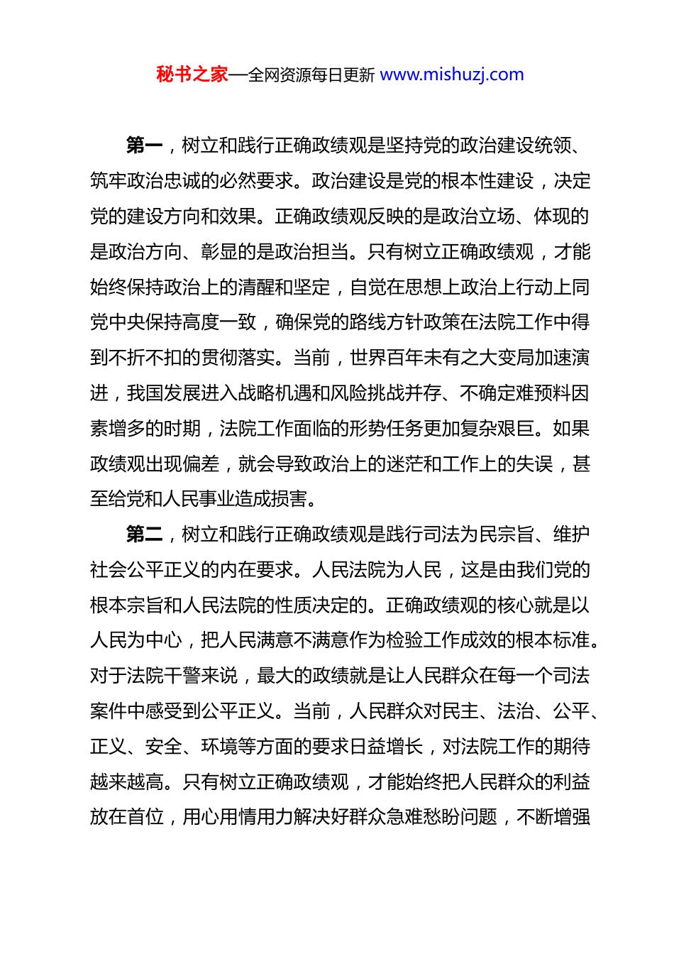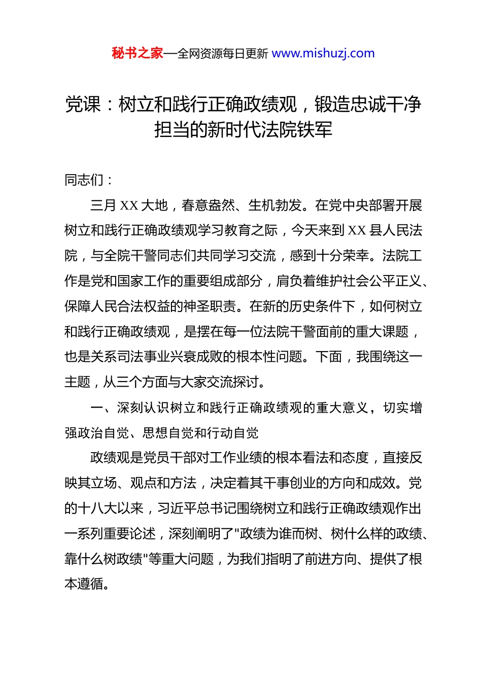 秘书之家—全网资源每日更新 www.mishuzj.com党课:树立和践行正确政绩观,锻造忠诚干净担当的新时代法院铁军 同志们:三月 XX 大地,春意盎然、生机勃发。在党中央部署开展树立和践行正确政绩观学习教育之际,今天来到 XX 县人民法院,与全院干警同志们共同学习交流,感到十分荣幸。法院工作是党和国家工作的重要组成部分,肩负着维护社会公平正义、保障人民合法权益的神圣职责。在新的历史条件下,如何树立和践行正确政绩观,是摆在每一位法院干警面前的重大课题,也是关系司法事业兴衰成败的根本性问题。下面,我围绕这一主题,从三个方面与大家交流探讨。一、深刻认识树立和践行正确政绩观的重大意义,切实增强政治自觉、思想自觉和行动自觉政绩观是党员干部对工作业绩的根本看法和态度,直接反映其立场、观点和方法,决定着其干事创业的方向和成效。党的十八大以来,习近平总书记围绕树立和践行正确政绩观作出一系列重要论述,深刻阐明了"政绩为谁而树、树什么样的政绩、靠什么树政绩"等重大问题,为我们指明了前进方向、提供了根本遵循。秘书之家—全网资源每日更新 www.mishuzj.com第一,树立和践行正确政绩观是坚持党的政治建设统领、筑牢政治忠诚的必然要求。政治建设是党的根本性建设,决定党的建设方向和效果。正确政绩观反映的是政治立场、体现的是政治方向、彰显的是政治担当。只有树立正确政绩观,才能始终保持政治上的清醒和坚定,自觉在思想上政治上行动上同党中央保持高度一致,确保党的路线方针政策在法院工作中得到不折不扣的贯彻落实。当前,世界百年未有之大变局加速演进,我国发展进入战略机遇和风险挑战并存、不确定难预料因素增多的时期,法院工作面临的形势任务更加复杂艰巨。如果政绩观出现偏差,就会导致政治上的迷茫和工作上的失误,甚至给党和人民事业造成损害。第二,树立和践行正确政绩观是践行司法为民宗旨、维护社会公平正义的内在要求。人民法院为人民,这是由我们党的根本宗旨和人民法院的性质决定的。正确政绩观的核心就是以人民为中心,把人民满意不满意作为检验工作成效的根本标准。对于法院干警来说,最大的政绩就是让人民群众在每一个司法案件中感受到公平正义。当前,人民群众对民主、法治、公平、正义、安全、环境等方面的要求日益增长,对法院工作的期待越来越高。只有树立正确政绩观,才能始终把人民群众的利益放在首位,用心用情用力解决好群众急难愁盼问题,不断增强秘书之家—全网资源每日更新 www.mishuzj.com人民群众的获得感、幸福感、安全感。第三,树立和践行正确政绩观是推进审判体系和审判能力现代化、实现法院工作高质量发展的重要保障。高质量发展是新时代的硬道理。法院工作要实现高质量发展,必须树立正确政绩观,正确处理好质量与效率、公正与效率、法律效果与社会效果等重大关系。近年来,法院系统深入推进司法体制改革,不断完善审判权力运行机制,审判质效持续提升。但也应当看到,一些地方和干警中仍然存在重显绩轻潜绩、重数量轻质量、重结果轻程序等问题,影响了司法公信力和群众满意度。只有树立正确政绩观,才能坚持实事求是、求真务实,尊重审判规律,推动法院工作在高质量发展的轨道上行稳致远。立和践行正确政绩观是锻造过硬法院队伍、提升司法公信力的迫切需要。队伍是事业的根本保证。干警的政绩观直接关系司法形象和司法公信力。从近年来查处的违纪违法案件看,一些干警之所以走上违法犯罪道路,根源就在于政绩观出现了严重偏差,把个人名利凌驾于党和人民利益之上,把司法权力当作谋取私利的工具。只有树立正确政绩观,才能筑牢拒腐防变的思想防线,恪守司法良知和职业道德,做到公正司法、廉洁司法、为民司法,以良好的司法形象赢得人民群众的信任和支持。秘书之家—全网资源每日更新 www.mishuzj.com二、准确把握正确政绩观的科学内涵和实践要求,在司法工作中见行见效正确政绩观具有深刻的理论内涵和鲜明的实践特征。习近平总书记强调,人民对美好生活的向往,就是我们的奋斗目标。这一重要论述深刻揭示了正确政绩观的本质要求。结合法院工作实际,我认为要着重把握以下几个方面。第一,正...