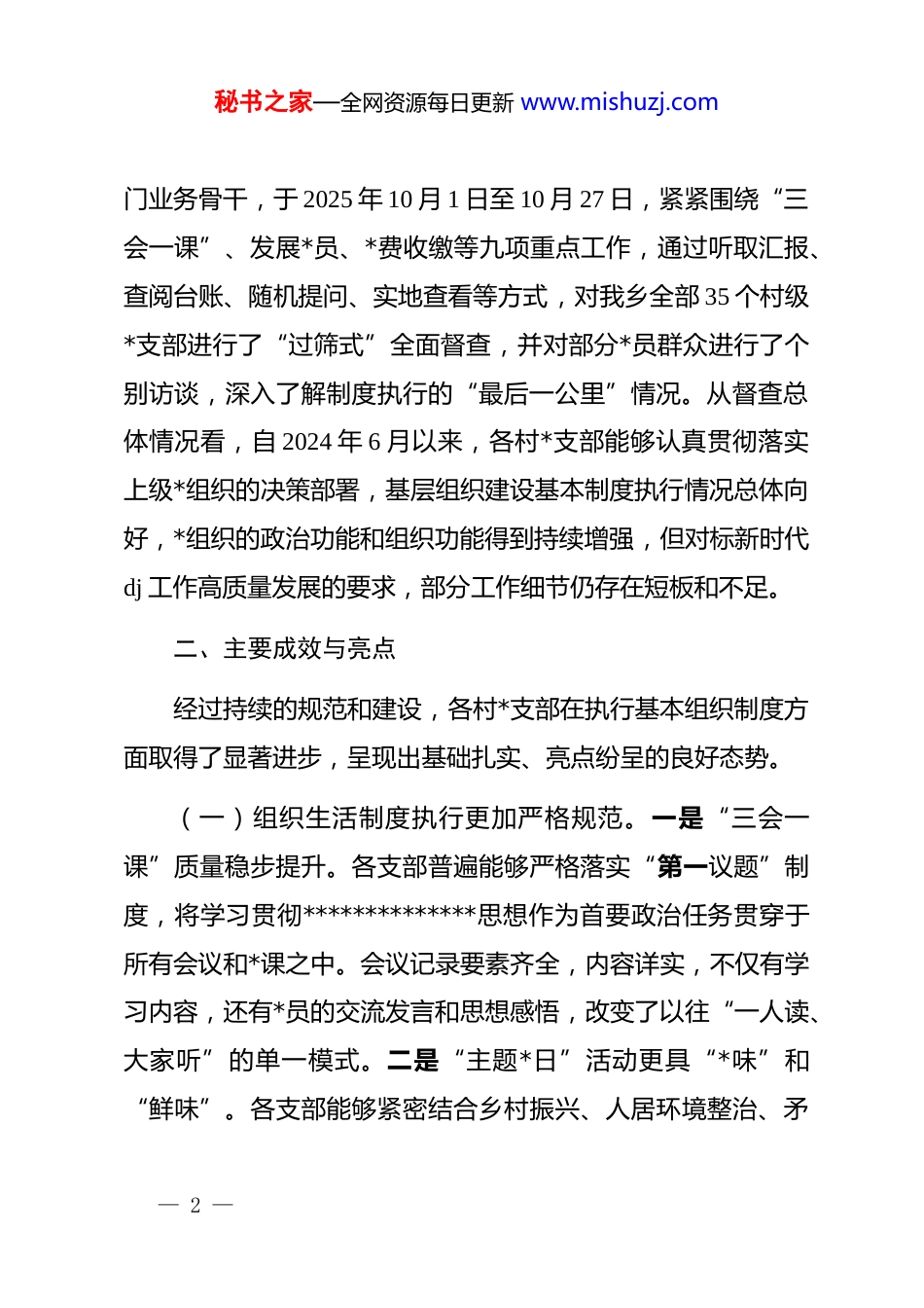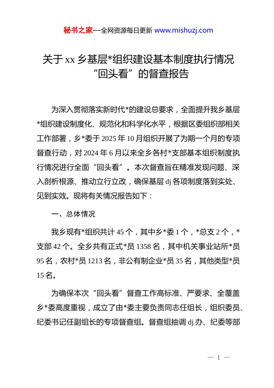 秘书之家—全网资源每日更新 www.mishuzj.com关于 xx 乡基层*组织建设基本制度执行情况“回头看”的督查报告为深入贯彻落实新时代*的建设总要求,全面提升我乡基层*组织建设制度化、规范化和科学化水平,根据区委组织部相关工作部署,乡*委于 2025 年 10 月组织开展了为期一个月的专项督查行动,对 2024 年 6 月以来全乡各村*支部基本组织制度执行情况进行全面“回头看”。本次督查旨在精准发现问题、深入剖析根源、推动立行立改,确保基层 dj 各项制度落到实处、见到实效。现将有关情况报告如下:一、总体情况我乡现有*组织共计 45 个,其中乡*委 1 个,*总支 2 个,*支部 42 个。全乡共有正式*员 1358 名,其中机关事业站所*员95 名,农村*员 1213 名,非公有制企业*员 35 名,其他类型*员15 名。为确保本次“回头看”督查工作高标准、严要求、全覆盖乡*委高度重视,成立了由*委主要负责同志任组长,组织委员、纪委书记任副组长的专项督查组。督查组抽调 dj 办、纪委等部— 1 —秘书之家—全网资源每日更新 www.mishuzj.com门业务骨干,于 2025 年 10 月 1 日至 10 月 27 日,紧紧围绕“三会一课”、发展*员、*费收缴等九项重点工作,通过听取汇报、查阅台账、随机提问、实地查看等方式,对我乡全部 35 个村级*支部进行了“过筛式”全面督查,并对部分*员群众进行了个别访谈,深入了解制度执行的“最后一公里”情况。从督查总体情况看,自 2024 年 6 月以来,各村*支部能够认真贯彻落实上级*组织的决策部署,基层组织建设基本制度执行情况总体向好,*组织的政治功能和组织功能得到持续增强,但对标新时代dj 工作高质量发展的要求,部分工作细节仍存在短板和不足。二、主要成效与亮点经过持续的规范和建设,各村*支部在执行基本组织制度方面取得了显著进步,呈现出基础扎实、亮点纷呈的良好态势。(一)组织生活制度执行更加严格规范。一是“三会一课”质量稳步提升。各支部普遍能够严格落实“第一议题”制度,将学习贯彻**************思想作为首要政治任务贯穿于所有会议和*课之中。会议记录要素齐全,内容详实,不仅有学习内容,还有*员的交流发言和思想感悟,改变了以往“一人读、大家听”的单一模式。二是“主题*日”活动更具“*味”和“鲜味”。各支部能够紧密结合乡村振兴、人居环境整治、矛— 2 —秘书之家—全网资源每日更新 www.mishuzj.com盾纠纷调解等中心工作,每月固定时间开展主题*日活动。部分支部创新活动载体,将活动地点搬到田间地头、项目一线和红色教育基地,如 xx 村*支部组织的“重走红色足迹,助力乡村旅游”主题*日活动,有效增强了活动的吸引力和感染力。三是组织生活会和民主评议*员“辣味”更足。各支部能够严格按照程序,会前充分征求意见、深入开展谈心谈话,会上严肃认真开展批评和自我批评,敢于动真碰硬,事后扎实抓好整改落实,有效杜绝了“走过场”、“搞形式”的现象。(二)*员队伍建设管理更加精细有效。一是发展*员工作更加严谨有序。各支部严格遵循“控制总量、优化结构、提高质量、发挥作用”的总要求,认真执行发展*员年度计划。在发展流程上,严格对照发展*员五个阶段 25 个步骤,对入*积极分子的培养教育、预备*员的接收和转正等环节层层把关,确保了新发展*员的政治素质和程序合规。自 2024 年 6 月以来,全乡各村*支部共发展预备*员 28 名,按期转正*员 31 名,队伍结构得到进一步优化。二是流动*员管理更加精准到位。各村*支部均建立了详细的流动*员管理台账,做到了底数清、情况明。普遍利用微信群、视频会议等信息化手段,建立了“线上*小组”,定期推送学习资料,组织线上学习讨论,确保流动*员“流动不— 3 —秘书之家—全网资源每日更新 www.mishuzj.com流失、离乡不离*”。xx 村*支部建立的“乡情驿站”微信群,不仅是组织关怀的平台,也成为了流动*员回报家乡、建言献策的重要渠道。(三)基础保障工作体系更加健全完善。一是*费收缴管理使用更加规范透明。各支部均明确了专人负责*费收缴工作,*员每月自觉、按时、足额交纳*费的意识显著增强。*费...