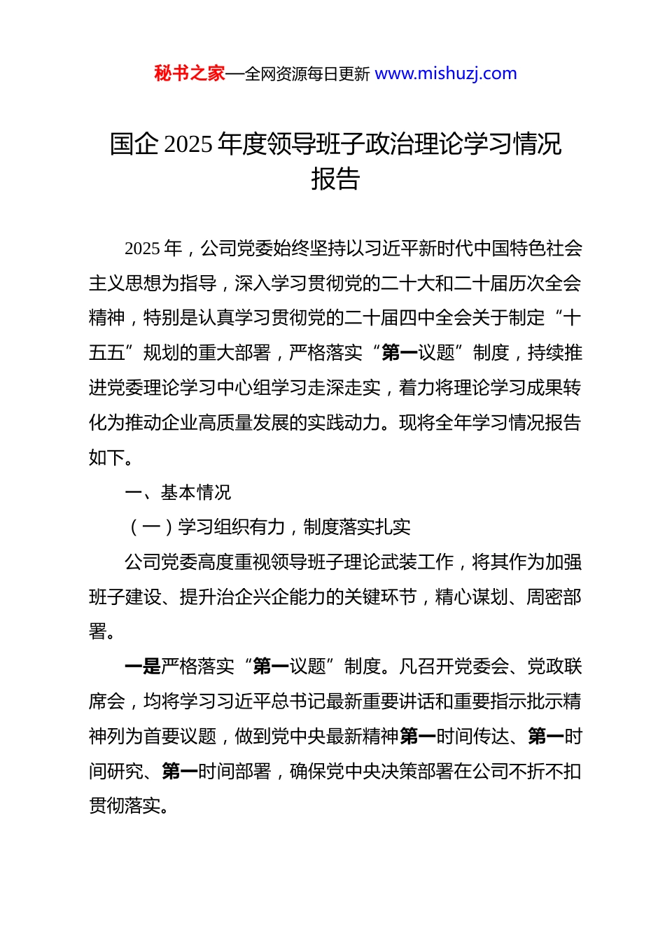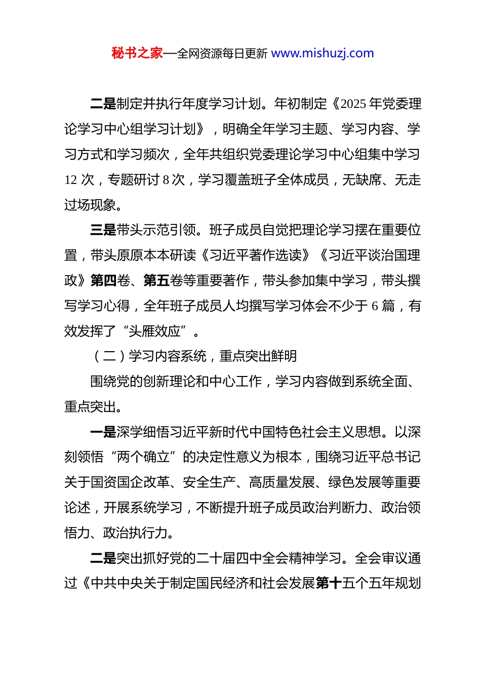 秘书之家—全网资源每日更新 www.mishuzj.com国企 2025 年度领导班子政治理论学习情况报告 2025 年,公司党委始终坚持以习近平新时代中国特色社会主义思想为指导,深入学习贯彻党的二十大和二十届历次全会精神,特别是认真学习贯彻党的二十届四中全会关于制定“十五五”规划的重大部署,严格落实“第一议题”制度,持续推进党委理论学习中心组学习走深走实,着力将理论学习成果转化为推动企业高质量发展的实践动力。现将全年学习情况报告如下。一、基本情况(一)学习组织有力,制度落实扎实公司党委高度重视领导班子理论武装工作,将其作为加强班子建设、提升治企兴企能力的关键环节,精心谋划、周密部署。一是严格落实“第一议题”制度。凡召开党委会、党政联席会,均将学习习近平总书记最新重要讲话和重要指示批示精神列为首要议题,做到党中央最新精神第一时间传达、第一时间研究、第一时间部署,确保党中央决策部署在公司不折不扣贯彻落实。秘书之家—全网资源每日更新 www.mishuzj.com二是制定并执行年度学习计划。年初制定《2025 年党委理论学习中心组学习计划》,明确全年学习主题、学习内容、学习方式和学习频次,全年共组织党委理论学习中心组集中学习12 次,专题研讨 8 次,学习覆盖班子全体成员,无缺席、无走过场现象。三是带头示范引领。班子成员自觉把理论学习摆在重要位置,带头原原本本研读《习近平著作选读》《习近平谈治国理政》第四卷、第五卷等重要著作,带头参加集中学习,带头撰写学习心得,全年班子成员人均撰写学习体会不少于 6 篇,有效发挥了“头雁效应”。(二)学习内容系统,重点突出鲜明围绕党的创新理论和中心工作,学习内容做到系统全面、重点突出。一是深学细悟习近平新时代中国特色社会主义思想。以深刻领悟“两个确立”的决定性意义为根本,围绕习近平总书记关于国资国企改革、安全生产、高质量发展、绿色发展等重要论述,开展系统学习,不断提升班子成员政治判断力、政治领悟力、政治执行力。二是突出抓好党的二十届四中全会精神学习。全会审议通过《中共中央关于制定国民经济和社会发展第十五个五年规划秘书之家—全网资源每日更新 www.mishuzj.com的建议》,对“十五五”时期经济社会发展作出顶层设计和战略擘画。公司党委专门邀请专家进行辅导解读,组织班子成员逐字逐句研读全会公报和《建议》全文,深刻领会全会关于建设现代化产业体系、加快高水平科技自立自强、深化国资国企改革等重大部署,结合施工企业实际研究谋划“十五五”发展思路。三是扎实推进党纪学习教育成果巩固。持续深化《中国共产党纪律处分条例》等党内法规学习,将深入贯彻中央八项规定精神学习教育贯穿全年,围绕“四风”问题新表现开展专题研讨,引导班子成员知敬畏、存戒惧、守底线。四是紧扣行业特点拓展学习内容。结合施工企业实际,围绕国家重大基础设施建设战略部署、安全生产法律法规、绿色施工标准规范、数字化转型、BIM 技术应用等内容,邀请行业专家举办专题讲座 5 次,组织赴先进企业考察学习 2 次,有效拓宽了班子成员视野,提升了专业能力。(三)学习形式多元,研讨质量提升坚持集体学习与个人自学相结合、理论研讨与实践调研相结合,创新学习方式,增强学习实效。一是深化研讨交流,打破单向灌输模式,推行“主题发言 +互动提问 +自由讨论 +总结点评”的研讨形式,全年围绕秘书之家—全网资源每日更新 www.mishuzj.com“深化国企改革提升核心竞争力”“党建引领保障重大工程建设质效”“安全生产风险防控体系优化”“推动施工企业绿色低碳转型”等重点议题开展专题研讨 8 次,形成有价值的共识性意见和建议若干条。二是推动调查研究与理论学习深度融合,班子成员结合分管领域深入项目一线开展专题调研,将调研中发现的问题带回理论学习加以研讨破解,做到以学促研、以研深学。三是充分利用“学习强国”等平台开展日常自学,强化学习积分管理,将学习情况纳入班子成员年度考核,推动理论学习由“要我学”向“我要学”转变。(四)学以致用,成果转化有效坚持把理论学习成果转化为推动企业发展的实践举措,做到学用贯通、知行...