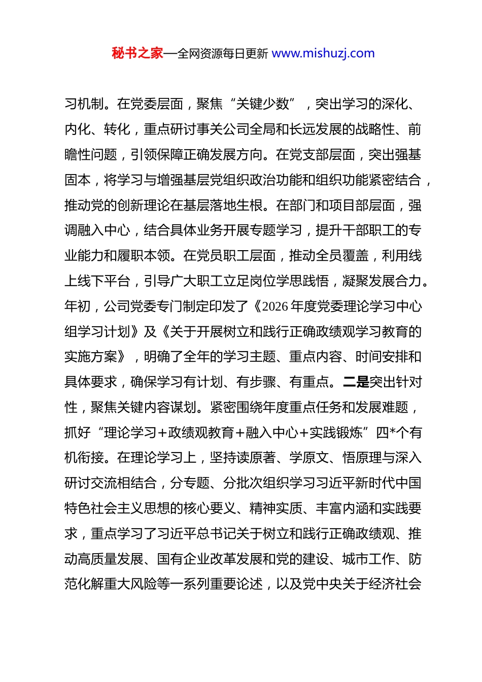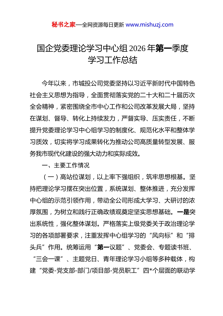 秘书之家—全网资源每日更新 www.mishuzj.com国企党委理论学习中心组 2026 年第一季度学习工作总结 今年以来,市城投公司党委坚持以习近平新时代中国特色社会主义思想为指导,全面贯彻落实党的二十大和二十届历次全会精神,紧密围绕全市中心工作和公司改革发展大局,坚持在谋划、督导、转化上持续发力,严督实导、压实责任,不断提升党委理论学习中心组学习的制度化、规范化水平和整体学习质效,切实将学习成果转化为推动公司高质量转型发展、服务我市现代化建设的强大动力和实际成效。一、主要工作情况(一)高站位谋划,以上率下强组织,筑牢思想根基。坚持把理论学习摆在突出位置,系统谋划、整体推进,充分发挥中心组的示范引领作用,带动全公司形成大学习、大研讨的浓厚氛围,为树立和践行正确政绩观奠定坚实思想基础。一是突出系统性,强化整体谋划。严格落实上级党委关于政治理论学习的各项部署要求,注重发挥中心组学习的“风向标”和“排头兵”作用。统筹运用“第一议题”、党委会、专题读书班、“三会一课”、主题党日、青年理论学习小组等多种载体,构建“党委-党支部-部门/项目部-党员职工”四*个层面的联动学秘书之家—全网资源每日更新 www.mishuzj.com习机制。在党委层面,聚焦“关键少数”,突出学习的深化、内化、转化,重点研讨事关公司全局和长远发展的战略性、前瞻性问题,引领保障正确发展方向。在党支部层面,突出强基固本,将学习与增强基层党组织政治功能和组织功能紧密结合,推动党的创新理论在基层落地生根。在部门和项目部层面,强调融入中心,结合具体业务开展专题学习,提升干部职工的专业能力和履职本领。在党员职工层面,推动全员覆盖,利用线上线下平台,引导广大职工立足岗位学思践悟,凝聚发展合力。年初,公司党委专门制定印发了《2026 年度党委理论学习中心组学习计划》及《关于开展树立和践行正确政绩观学习教育的实施方案》,明确了全年的学习主题、重点内容、时间安排和具体要求,确保学习有计划、有步骤、有重点。二是突出针对性,聚焦关键内容谋划。紧密围绕年度重点任务和发展难题,抓好“理论学习+政绩观教育+融入中心+实践锻炼”四*个有机衔接。在理论学习上,坚持读原著、学原文、悟原理与深入研讨交流相结合,分专题、分批次组织学习习近平新时代中国特色社会主义思想的核心要义、精神实质、丰富内涵和实践要求,重点学习了习近平总书记关于树立和践行正确政绩观、推动高质量发展、国有企业改革发展和党的建设、城市工作、防范化解重大风险等一系列重要论述,以及党中央关于经济社会秘书之家—全网资源每日更新 www.mishuzj.com发展、新型城镇化、现代化基础设施体系建设的重大决策部署。在政绩观教育上,将“为谁创造业绩、创造什么样的业绩、怎样创造业绩”作为学习研讨的核心议题,深入剖析“重显绩轻潜绩、重当前轻长远、重局部轻全局”等错误政绩观的表现和危害,引导领导干部牢记初心使命,坚持发展为了人民、发展依靠人民、发展成果由人民共享。在融入中心上,坚持宏观政策与公司中心任务相衔接,围绕市“十五五”规划实施、城市更新、智慧城市建设、绿色低碳发展、投融资模式创新等议题,邀请市委党校教授、相关领域专家学者、政府部门负责人进行专题辅导和政策解读,全年计划开展专题辅导报告场,已开展场,有效拓宽了领导班子和党员干部的视野思路。在实践锻炼上,坚持集体研讨与专题调研相衔接,公司党委班子成员牵头,围绕“在城市建设运营中树立和践行正确政绩观的实践路径”、“当前公司转型发展面临的瓶颈问题及对策”、“重点项目推进中的风险挑战与应对”、“职工群众急难愁盼问题排查与解决”等*个重点课题,深入基层一线、项目现场开展解剖麻雀式调研,运用党的创新理论蕴含的立场观点方法研究新情况、解决新问题。三是突出示范性,抓住“关键少数”谋划。充分发挥党员领导干部特别是党委班子成员的“头雁效应”和“头雁”领学、促学、导学作用。严格落实中心组学习制度,班子秘书之家—全网资源每日更新 www.mishuzj.com成员带头制定*个人学习计划,带头研读指定书目和重要文献,带头在集中学习时作重...